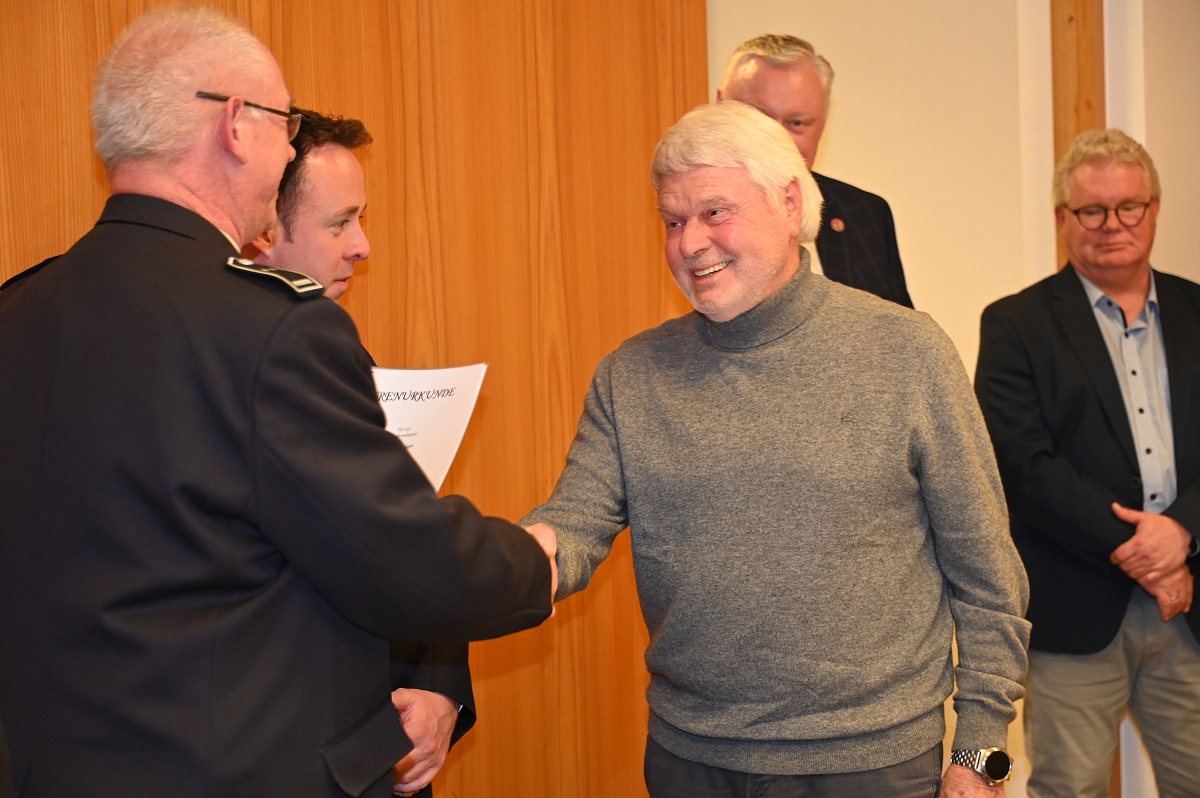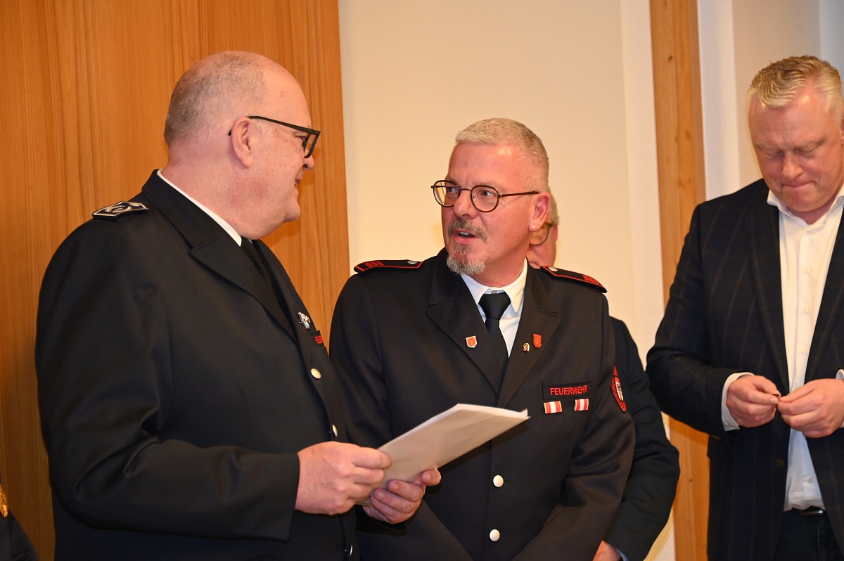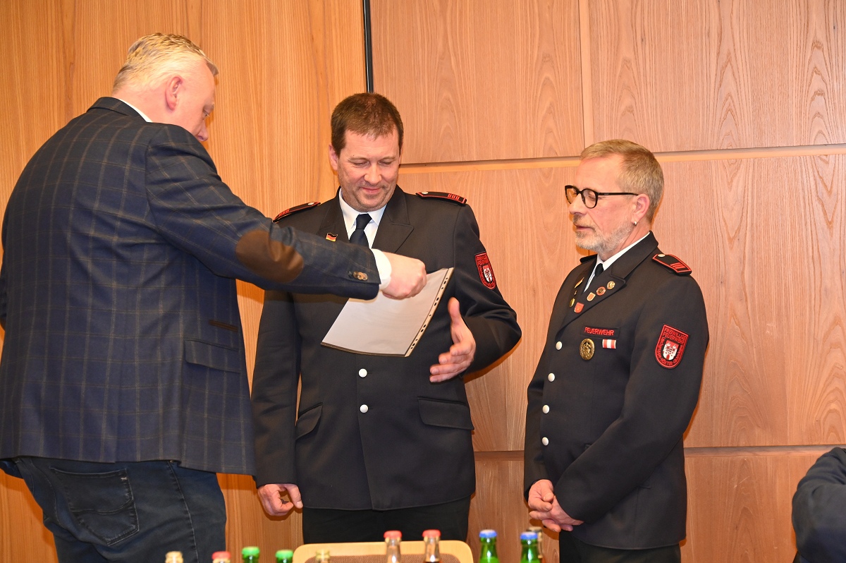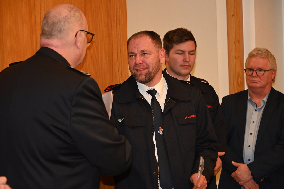 Eine besondere Ehrung wurde Hauptfeuerwehrmann Ludger Heine zuteil. Für seine 40-jährige aktive Mitgliedschaft in der Freiwilligen Feuerwehr verlieh Stadtbrandinspektor Jürgen Schmits ihm eine Urkunde sowie das Sonderabzeichen des Landesfeuerwehrverbandes. Sowohl der Leiter der Feuerwehr als auch Bürgermeister Daniel Hartmann dankten ihm für seinen jahrzehntelangen Einsatz. Aus gesundheitlichen Gründen trat Ludger Heine aus der ersten Reihe der aktiven Feuerwehrleute zurück und wurde in die Ehrenabteilung versetzt. Unter großem Applaus der Mannschaft verabschiedete ihn Jürgen Schmits mit einer Urkunde. Für ihre zehnjährige aktive Mitgliedschaft wurden Unterbrandmeister Timo Heine und Fabian Rosner in Abwesenheit sowie Hauptfeuerwehrmann Julian Jöhren und Unterbrandmeister Maximilien Meise ausgezeichnet. Urkunden für 20 Jahre aktive Mitgliedschaft überreichte Löschgruppenführer Andreas Bohnenpoll an Rudolf Lützer, Patrick Haller und Lukas Heine.