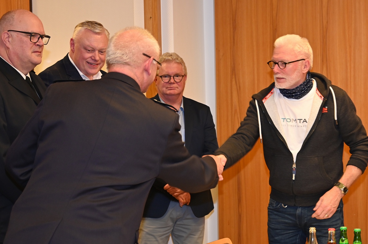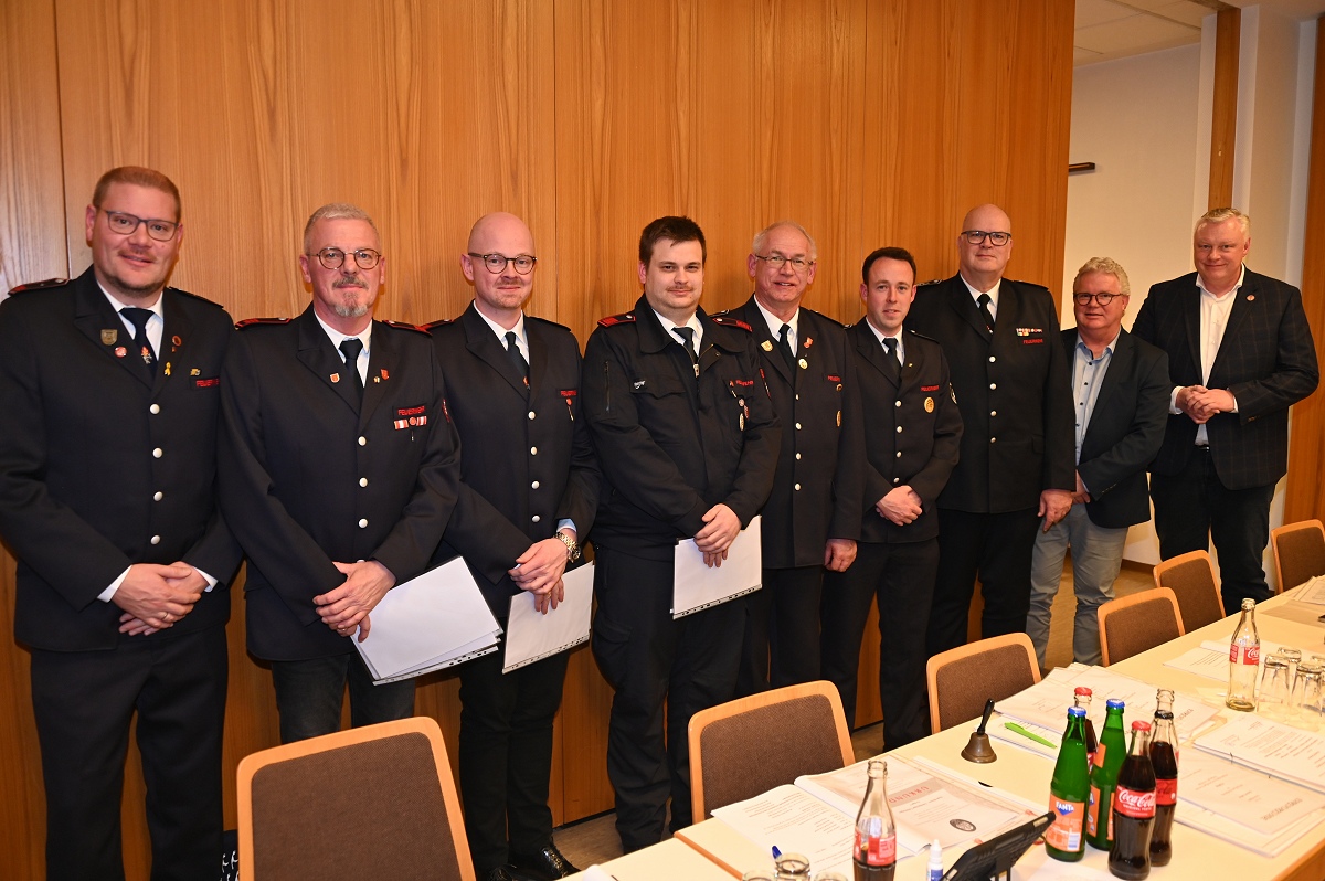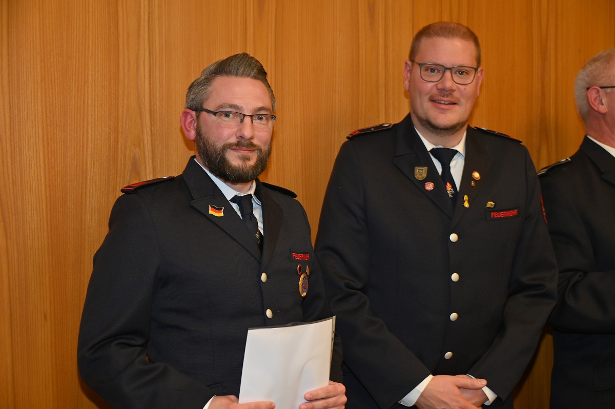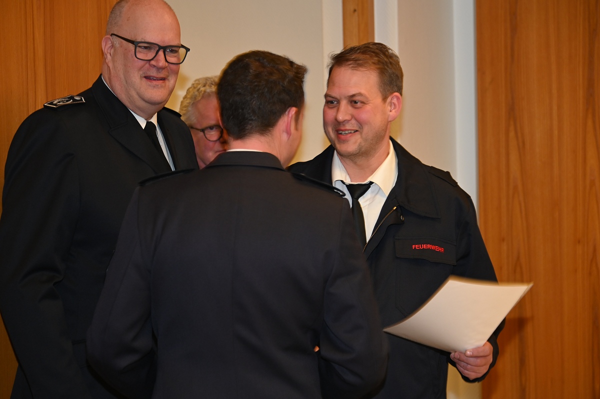 Eine besondere Ehrung wurde Hauptfeuerwehrmann Ludger Heine zuteil. Für seine 40-jährige aktive Mitgliedschaft in der Freiwilligen Feuerwehr verlieh Stadtbrandinspektor Jürgen Schmits ihm eine Urkunde sowie das Sonderabzeichen des Landesfeuerwehrverbandes. Sowohl der Leiter der Feuerwehr als auch Bürgermeister Daniel Hartmann dankten ihm für seinen jahrzehntelangen Einsatz. Aus gesundheitlichen Gründen trat Ludger Heine aus der ersten Reihe der aktiven Feuerwehrleute zurück und wurde in die Ehrenabteilung versetzt. Unter großem Applaus der Mannschaft verabschiedete ihn Jürgen Schmits mit einer Urkunde. Für ihre zehnjährige aktive Mitgliedschaft wurden Unterbrandmeister Timo Heine und Fabian Rosner in Abwesenheit sowie Hauptfeuerwehrmann Julian Jöhren und Unterbrandmeister Maximilien Meise ausgezeichnet. Urkunden für 20 Jahre aktive Mitgliedschaft überreichte Löschgruppenführer Andreas Bohnenpoll an Rudolf Lützer, Patrick Haller und Lukas Heine.