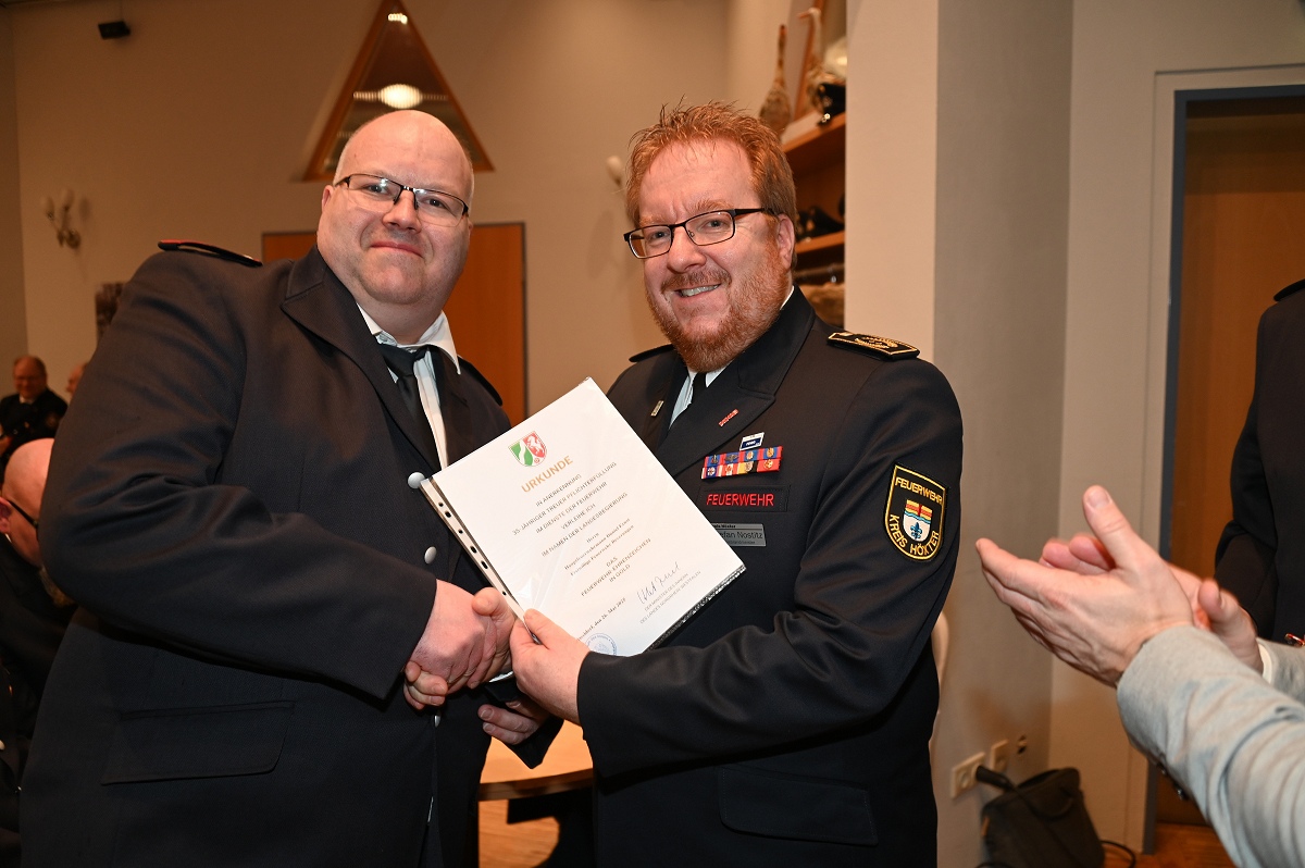 Das Feuerwehr-Ehrenzeichen des Landes in Gold für 35 Jahre aktiven Dienst ging an Stephan Sievers, Martin Beine, Klaus Even, Christoph Dierkes, Thomas Kröger, Tobias Dierkes, Markus Dierkes, Daniel Ernst, Kreisbrandmeister Stefan Nostiz, Andreas Nostitz und Ulrich Kieneke. Darüber hinaus wurden zahlreiche Sonderabzeichen des Verbandes der Feuerwehren NRW verliehen. Das Sonderabzeichen für 40 Jahre Feuerwehrmitgliedschaft in Silber erhielten Matthias Berg, Marc Schrick, Stefan Dewender, Arnold Dunschen und Franz Lavarino. Das Sonderabzeichen in Gold für 50 Jahre Mitgliedschaft verlieh Kreisbrandmeister Nostiz an Rudolf Berg, Günter Konzek, Ludwig Kuhn und Manfred Schade sowie für 60- bzw. 70-jährige Mitgliedschaft an Hans Lorenz Vössing und Josef Vössing.