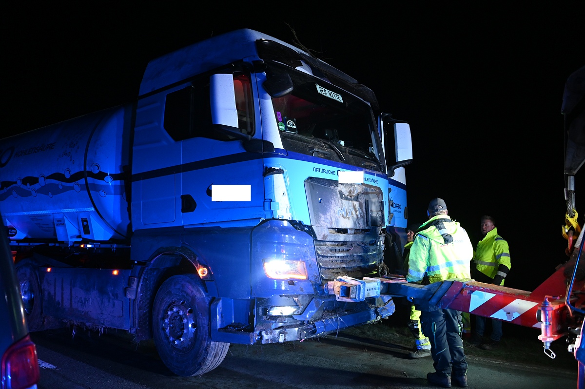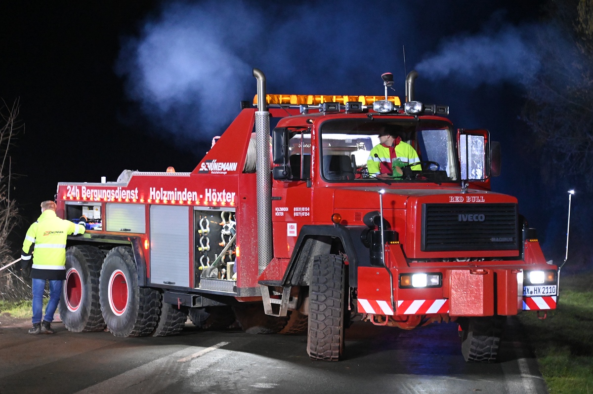 Die Bergung des Lastwagens begann etwa gegen 21.30 Uhr und stellte das Bergungsunternehmen vor erhebliche Herausforderungen. Zunächst musste die Feuerwehr einen störenden Baum kürzen und einschneiden, um ausreichend Platz für die schweren Bergungsgeräte zu schaffen. Anschließend wurde die Unfallstelle großflächig ausgeleuchtet und schweres Gerät in Stellung gebracht. Zum Einsatz kamen unter anderem ein 50-Tonnen-Kran, ein 60-Tonnen-Kran sowie eine weitere große Bergemaschine aus den Kreisen Höxter und Holzminden. Aufgrund der schwierigen Lage des Lkw im Graben zogen sich die Arbeiten jedoch über mehrere Stunden hin. Erst gegen 2.30 Uhr am Freitagmorgen gelang es den Berbungskräften, den Tanklastzug wieder auf die Fahrbahn zu heben und für den Abtransport vorzubereiten. Während der Bergungsarbeiten mussten mehrere Lastkraftwagen, die in Richtung Godelheim unterwegs waren, auf der Bundesstraße ausharren, weil sie nicht mehr wenden konnten. Die Bundesstraße B64/83 blieb bis etwa 2.45 Uhr vollständig gesperrt. Nach dem Abtransport des Lkw musste die Feuerwehr die Fahrbahn noch von großen Mengen Erde und Schmutz befreien, die durch den Unfall und die Bergung auf die Straße gelangt waren. Erst gegen 3 Uhr konnte die Strecke schließlich wieder für den Verkehr freigegeben werden. Die Polizei hat die Ermittlungen zur genauen Unfallursache aufgenommen. Weitere Angaben zum Gesundheitszustand der schwer verletzten Pkw-Fahrerin lagen zunächst nicht vor.