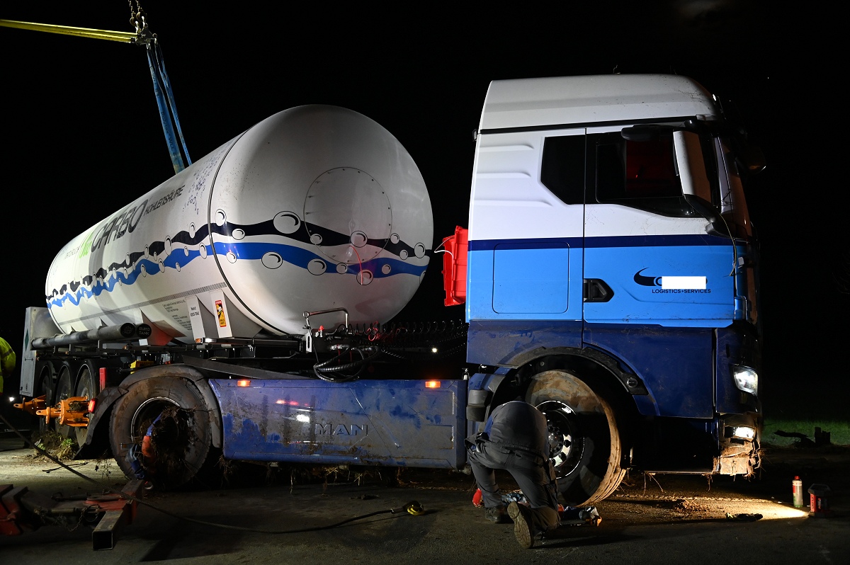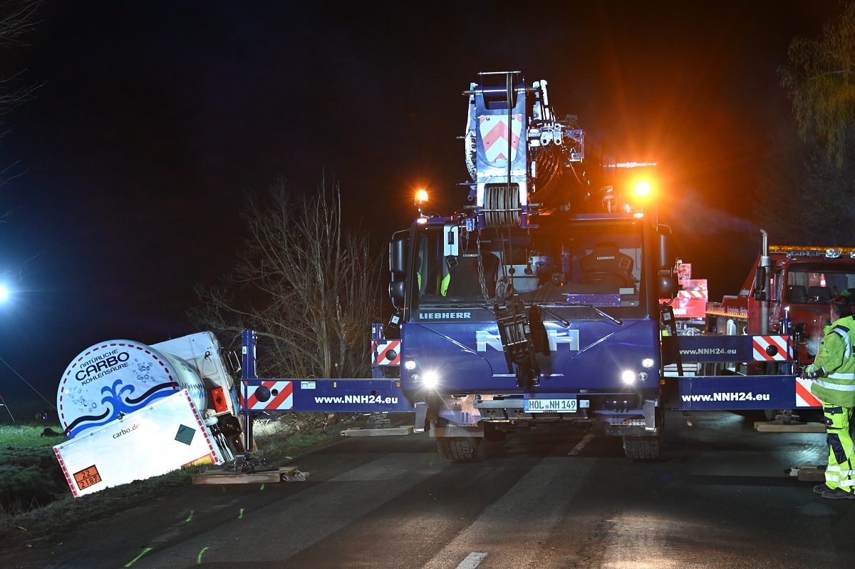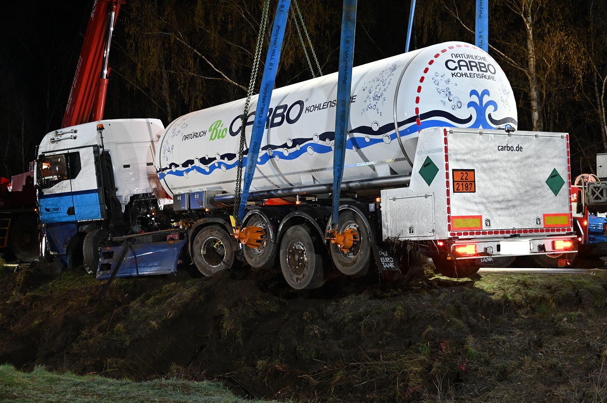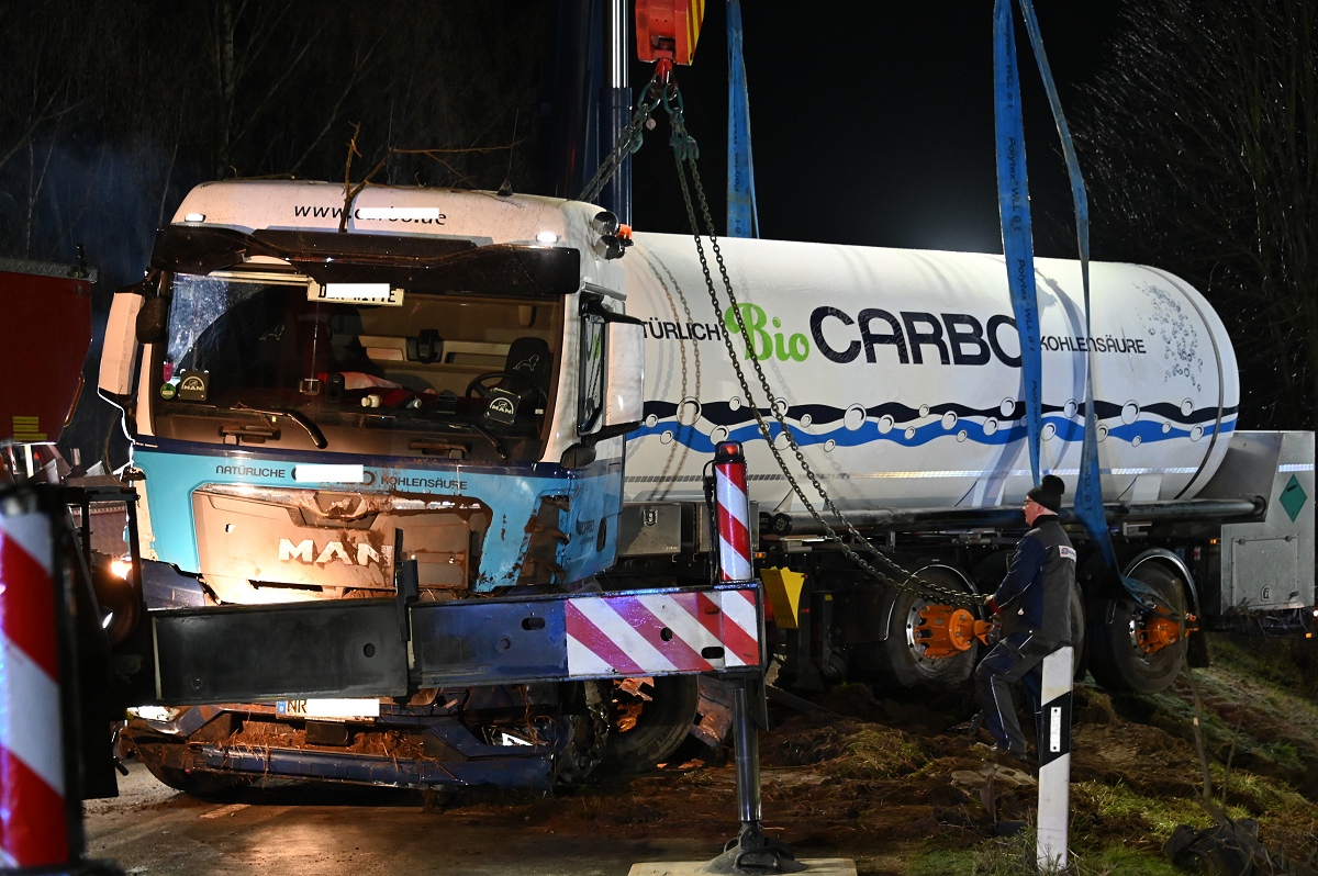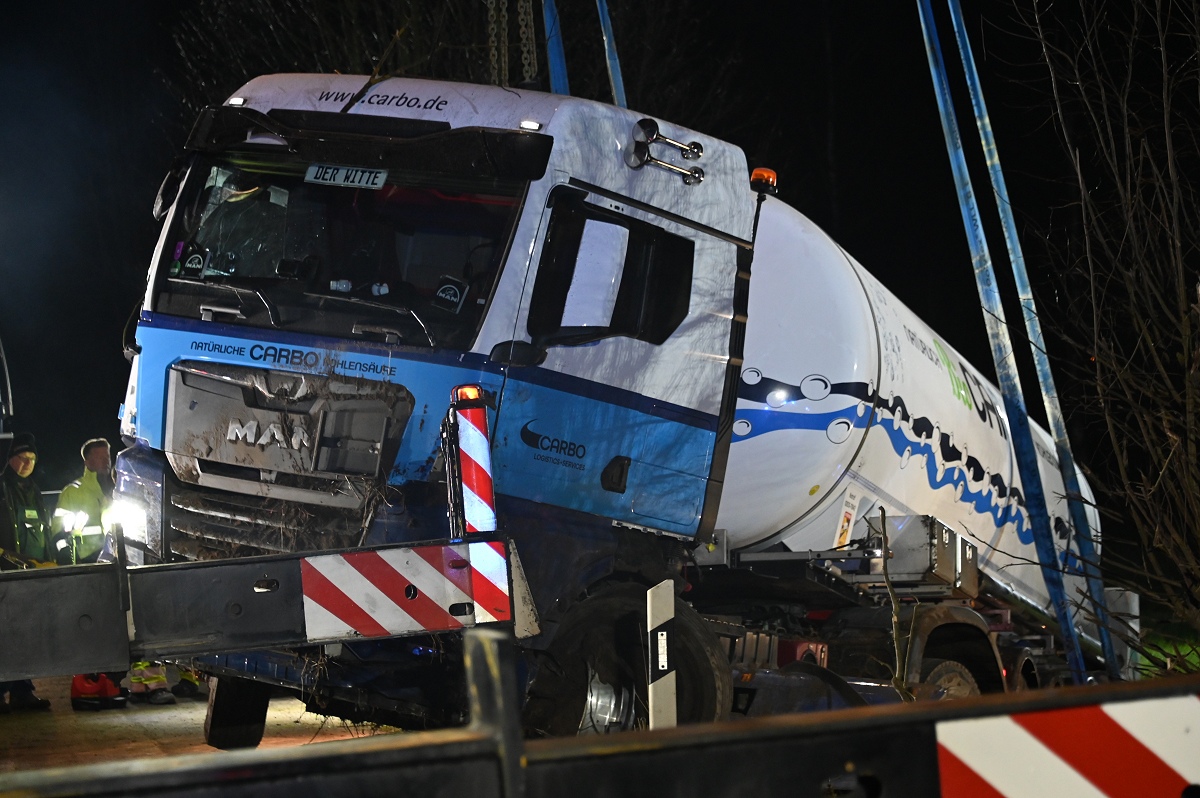 Höxter/Godelheim (TKu). Update zum schweren Verkehrsunfall auf der B64/83: Die Bergung des mit Kohlensäure beladenen Tanklastzugs gestaltete sich schwierig und dauerte bis in die frühen Morgenstunden. Nach dem schweren Verkehrsunfall zwischen einem Lastkraftwagen und einem Pkw am Donnerstagabend gegen 19 Uhr auf der B64/83 zwischen Höxter und Godelheim in Höhe der Kiesseen hat sich die Bergung des verunglückten Tanklastzugs als äußerst schwierig und zeitaufwendig erwiesen. Die Bundesstraße blieb bis in die frühen Morgenstunden voll gesperrt. Wie die Polizei vor Ort berichtete, waren ein VW Golf und ein mit Kohlensäure beladener Tanklastzug auf freier Strecke in Höhe der Kiesseen zwischen Godelheim und Höxter zusammen kollidiert. Durch die Wucht des Aufpralls geriet der Pkw in den Straßengraben, wobei die Fahrerin in ihrem Fahrzeug eingeklemmt und schwer verletzt wurde. Der Lkw-Fahrer erlitt hingegen leichte Verletzungen. Der Tanklastzug kam ebenfalls von der Fahrbahn ab und bohrte sich tief in den Straßengraben und in den Erdwall eines Ackers hinein.