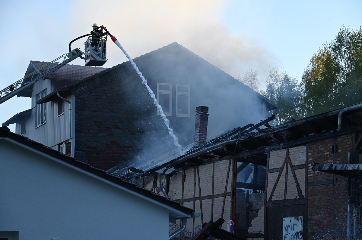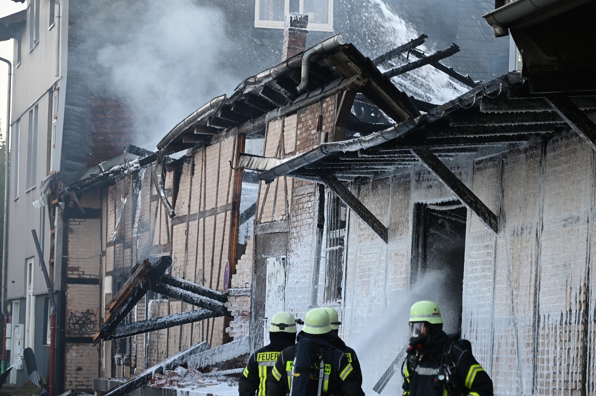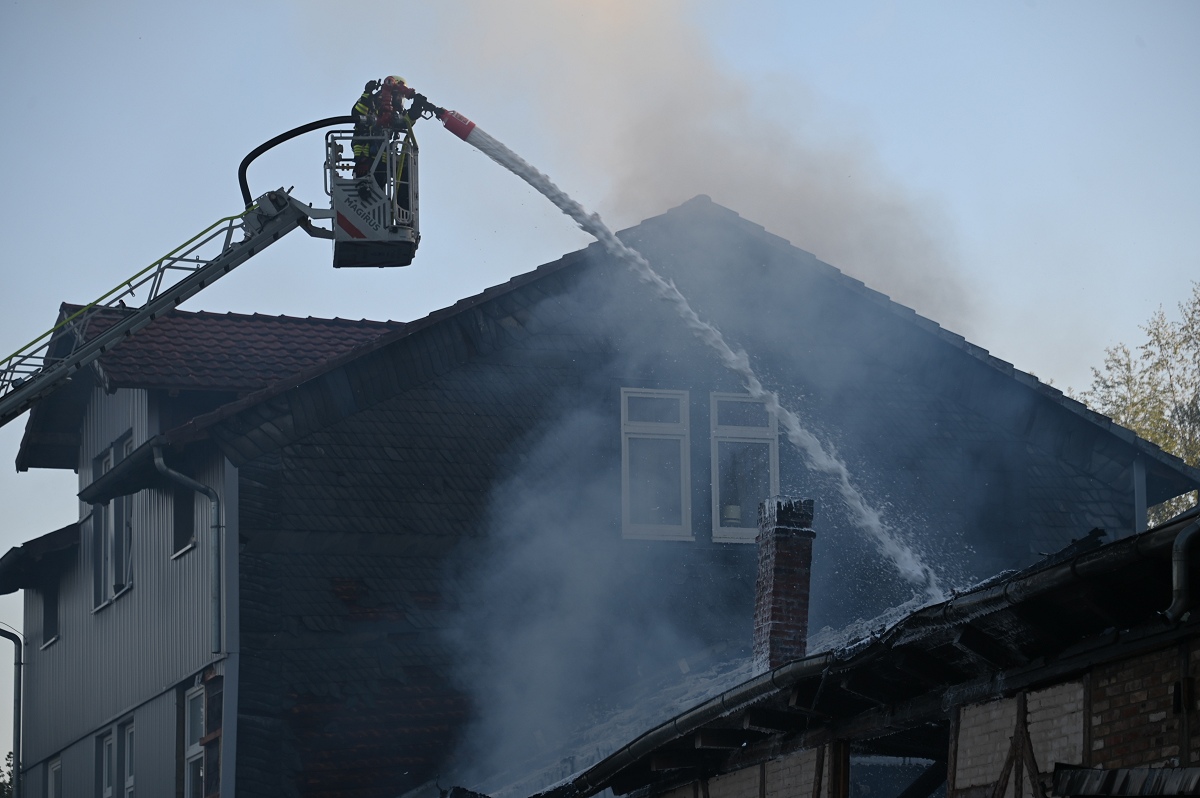 Beverungen (red). Nach dem Großbrand am Donnerstagnachmittag auf dem Gelände des Alten Bahnhofs in Beverungen liegen inzwischen weitere Erkenntnisse zum Einsatzverlauf und zum Ausmaß der Schäden vor. Demnach bestätigte sich, dass das Feuer im Bereich eines Anbaus ausbrach und sich von dort rasch ausbreitete. Eine Zeugin hatte gegen 16 Uhr Rauch aus dem Anbau des früheren Bahnhofsgebäudes bemerkt und die Einsatzkräfte alarmiert. Beim Eintreffen von Feuerwehr und Polizei stand der Dachstuhl bereits in Flammen, gegen 17 Uhr war er vollständig ausgebrannt. Das Feuer beschränkte sich nach Angaben der Einsatzleitung auf den Anbau, in dem unter anderem städtische Notunterkünfte untergebracht waren. Das angrenzende Gebäude mit einer Asylbewerberunterkunft blieb relativ verschont, wurde jedoch durch Hitze und Rauch ebenfalls in Mitleidenschaft gezogen. Die Feuerwehr kühlte das Gebäude vorsorglich dauerhaft, um ein Übergreifen der Flammen zu verhindern. Nach ersten Einschätzungen kann es vorerst nicht mehr bewohnt werden. Ein Anzeichen dafür sind die ausgelösten Rauchmelder im Gebäude, die auch am Abend noch lautstark schrillten. Das bedeutet, dass Rauch weit bis in das Wohngebäude vorgedrungen ist, wie die Feuerwehr erklärte. Die Bewohner wurden zunächst an anderen Orten untergebracht.