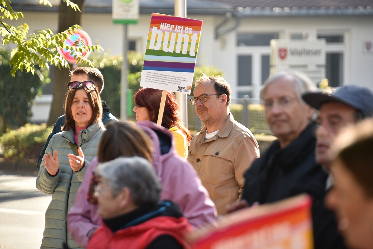 Der evangelische Pfarrer Tim Wendorff aus Höxter trug Hasskommentare aus dem Internet vor. Mit scharfen Beispielen verdeutlichte er den Anwesenden, wie verletzend und gefährlich menschenverachtende Sprache wirkt. „Diese Internetkommentare haben mit ‚Einigkeit und Recht und Freiheit‘ nichts zu tun“, betonte Wendorff. „Wenn Freiheit missbraucht wird, schränkt sie die Freiheit anderer ein.“ Zwischen den Redebeiträgen setzten Hans Hermann Jansen und das Projektteam musikalische Akzente, womit sie die Teilnehmenden aktiv eingebunden haben. Gemeinsam wurden starke Lieder gesungen wie das alte Volkslied „Die Gedanken sind frei“, die dritte Strophe von Hoffmann Von Fallersleben seinem Deutschlandlied, ergänzt durch Brechts Kinderhymne „Anmut sparet nicht noch Mühe“ auf die Melodie der Nationalhymne oder aber auch die Europahymne „Freude schöner Götterfunken“.