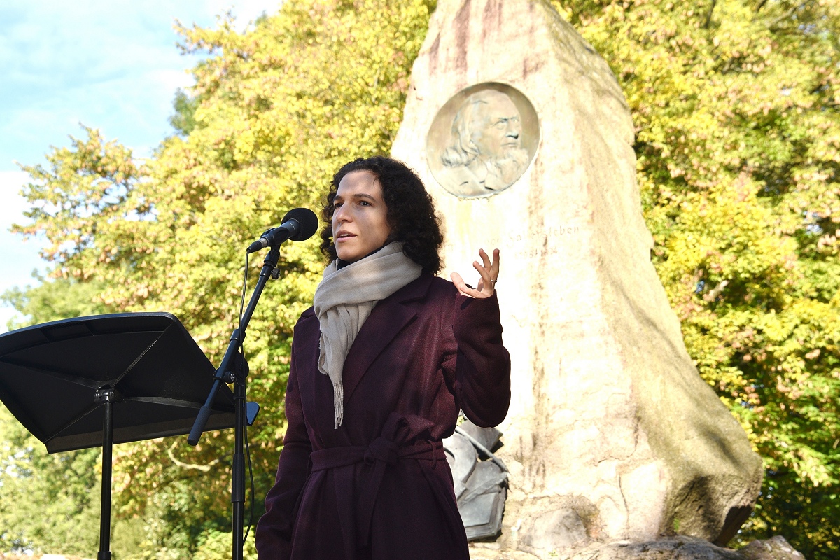Und so fehlte in dem passenden Motto „Starke Worte. Starke Orte“ eigentlich nur noch die Ergänzung „mit starken Liedern“, meinte eine Besucherin. Einen Rückblick in die Geschichte brachte das Grußwort von Dr. Michael Stoltz, Vorsitzender des Arbeitskreises Hoffmann von Fallersleben im Heimat- und Verkehrsverein Höxter e.V., mit sich, das von Helmut Lensdorf verlesen wurde. Stoltz, der persönlich nicht anwesend sein konnte, spannte einen historischen Bogen: von den Bauernkriegen über die Revolution von 1848 bis hin zur Weimarer Republik und zum Grundgesetz. Er erinnerte daran, dass Demokratie stets erkämpft und verteidigt werden müsse. „Heute stehen wir wieder an einem Punkt, der verlangt, Farbe zu bekennen, die Demokratie zu verteidigen, die Würde aller Menschen zu schützen. Demokratie ist keine Selbstverständlichkeit, sondern eine gemeinsame Aufgabe.“