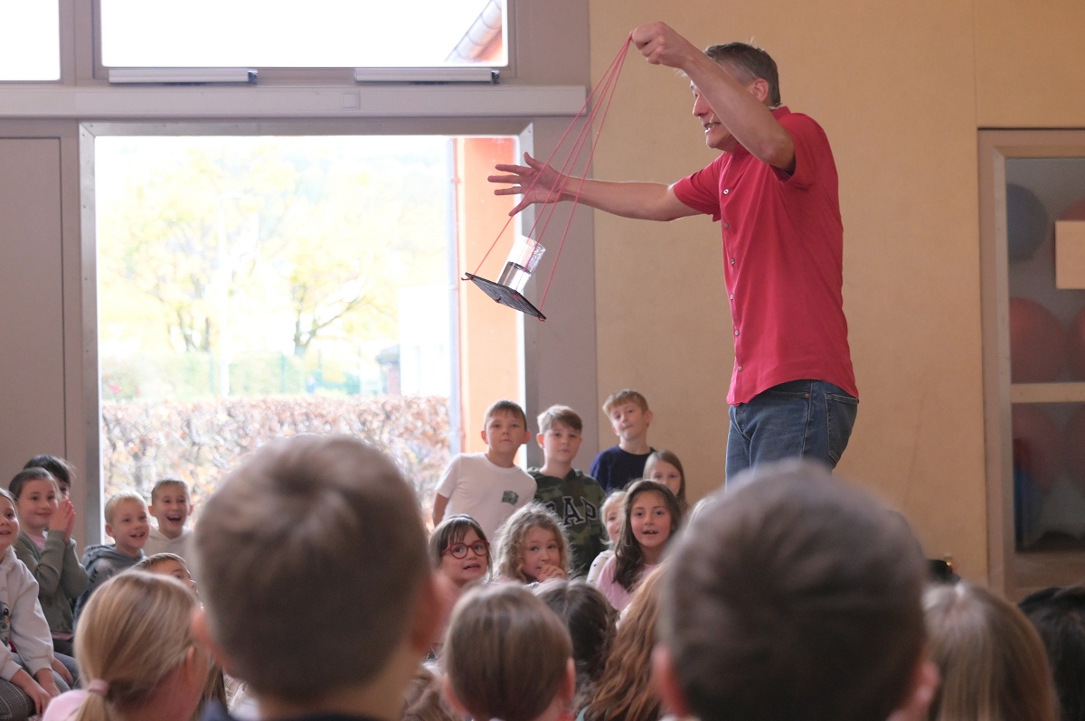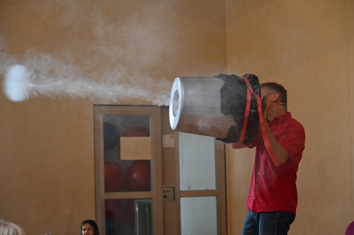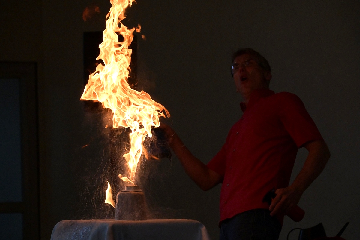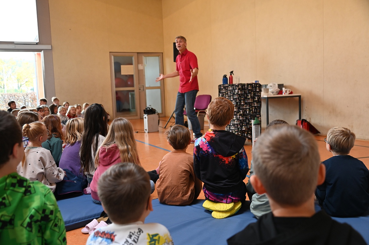 Im Mittelpunkt der Show standen die vier Elemente Feuer, Wasser, Luft und Erde. Wissenschaftsjournalist Dr. Sascha Ott, bekannt aus dem WDR-Format „Küchenexperimente“, präsentierte die physikalischen Phänomene kindgerecht, humorvoll und immer auf dem soliden Grund wissenschaftlicher Fakten. So wurde ein kleines Teelicht plötzlich zu einem spektakulären Feuerball. Fünf Liter Wasser verwandelten sich in eine Schwalldusche, die für viel Staunen und Gelächter sorgte. Doch nicht nur beeindruckende Experimente standen im Fokus. Die Kinder erfuhren spielerisch, wie Raketen fliegen, warum ein Feuer brennt oder wie man im Alltag Energie sparen kann. Besonders wichtig dabei: Alle durften mitdenken, miträtseln und mitexperimentieren. Genau dieses aktive Erleben macht die Wissensshows der Physikanten zu nachhaltigen Lernerlebnissen.