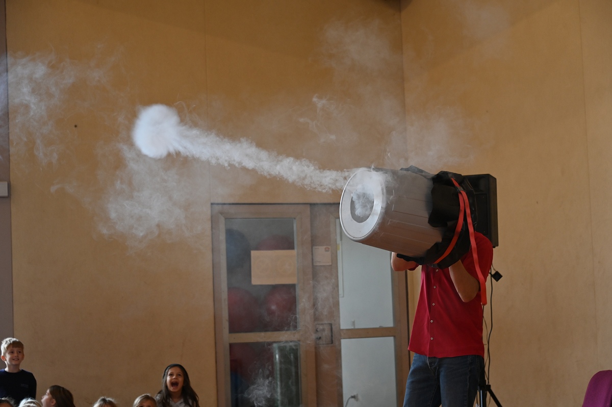 Lüchtringen (TKu). Mit einem Feuerball, spritzenden Wassermengen und Wirbelringen, die quer durch die Turnhalle schossen, endete am Donnerstagmorgen die letzte Unterrichtsstunde für die Schülerinnen und Schüler der Grundschule Lüchtringen auf besonders spannende Weise. Zu Gast waren „Die Physikanten“, ein mehrfach ausgezeichnetes Team aus Naturwissenschaftlern und Künstlern, das seit Jahren Kinder wie Erwachsene mit spektakulären Experimenten begeistert. Der Förderverein der Grundschule Lüchtringen hatte diese besondere Wissensshow organisiert und finanziert. Damit konnten alle Klassen von Jahrgang 1 bis 4 teilnehmen, und das nicht nur zuschauen, sondern auch aktiv mitmachen.
