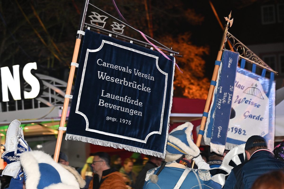 Lauenförde/Beverungen (TKu). Musik, Tanz und ausgelassene Carnevalsstimmung an der Ländergrenze ist der CVWB in die neue Carnevalssession gestartet: Der Carnevalsverein Weserbrücke e.V. (CVWB) feiert in diesem Jahr sein 50-jähriges Vereinsjubiläum, und wie immer mit einem dreifach donnernden „Weserbrücke Helau!“ Unter dem Motto „Der CVWB glitzert grenzenlos – im Dreiländereck ist richtig was los!“ erlebten zahlreiche Närrinnen und Narren einen Auftakt, der ausgelassener kaum sein könnte. Die Jecken aus Beverungen und Lauenförde ließen es sichzunächst nicht nehmen, traditionsgemäß den Schlüssel zum Roten Rathaus in Lauenförde zu erobern und das Rathaus zu erstürmen. Die Wächter des Schützenvereins Lauenförde von 1882 e.V. rückten mit einer schweren Kanone, einer kleinen Schützen-Armee und einem massiven Schlagbaum an, um das Gebäude gegen die närrische Übermacht zu verteidigen. Auch zwei Burgwächter aus Beverungen, motiviert durch den neu gewählten Bürgermeister Tino Wenkel, stellten sich den Karnevalisten entgegen. Doch trotz ihrer lautstarken Verteidigungsstrategie blieb der Sieg der Jecken unausweichlich: Die Damen der blau-weißen Garde eröffneten den Angriff mit Konfetti-Kanonen, gefolgt von der Alten Garde, die mit Regenschirmen ein ungewohntes, aber wirkungsvolles Bild bot. Schließlich ebneten die männlichen Karnevalisten den Weg, indem sie den Schlagbaum kurzerhand beiseite räumten und so die Verteidigungslinie durchbrachen. Unter großem Jubel zog die Narrenschar ins Rathaus ein. „Besser könnte unsere Jubiläumssession nicht beginnen!“, freute sich CVWB-Präsident Daniel Zarnitz über den erfolgreichen Auftakt.