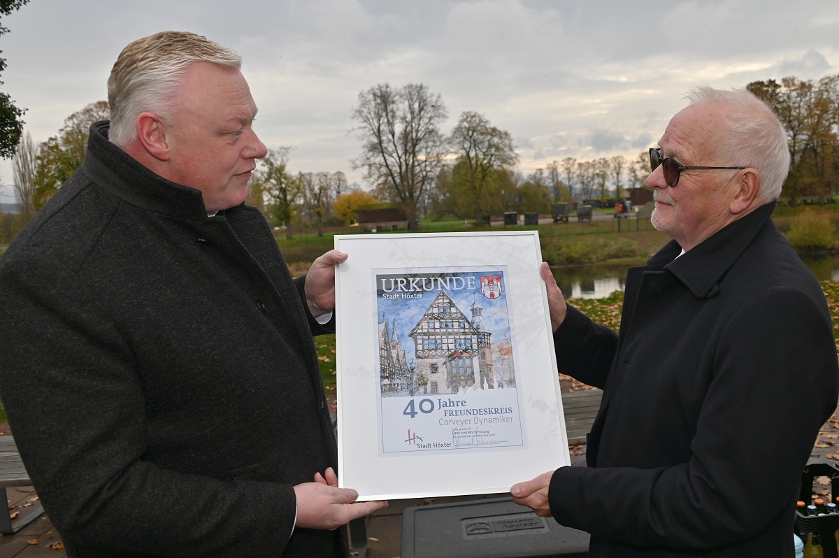 Bürgermeister Daniel Hartmann würdigte dieses Engagement und überreichte dem Freundeskreis im Namen der Stadt Höxter eine Ehrenurkunde. In seiner Rede erinnerte er an die Gründung im Kaminzimmer von Schloss Corvey und an die besondere Mischung der damaligen Runde: Handwerker, Kaufleute, Juristen, Unternehmer und ein Gastronom. „Eine Art Stadtsymphonie“, wie Hartmann es formulierte, „in der jeder ein anderes Instrument spielt, aber gemeinsam ein Klang entsteht, der sich hören lassen kann.“ Er hob hervor, wie selbstverständlich der Freundeskreis dort einspringe, wo Aufgaben sonst hätten liegen bleiben können. Die Dynamiker hätten nicht nur Steine restauriert, sondern Erinnerungsräume bewahrt; nicht nur Anlagen gebaut, sondern Freiheitsorte geschaffen; nicht nur Toiletten errichtet, sondern gezeigt, was möglich sei, wenn Bürgerinnen und Bürger Verantwortung übernehmen. „Der Funke aus jenem Kaminzimmer von 1985 brennt weiter. Und er leuchtet noch immer hell genug, um die nächsten Jahre Höxter ein Stück weit mitzugestalten“, so der Bürgermeister.