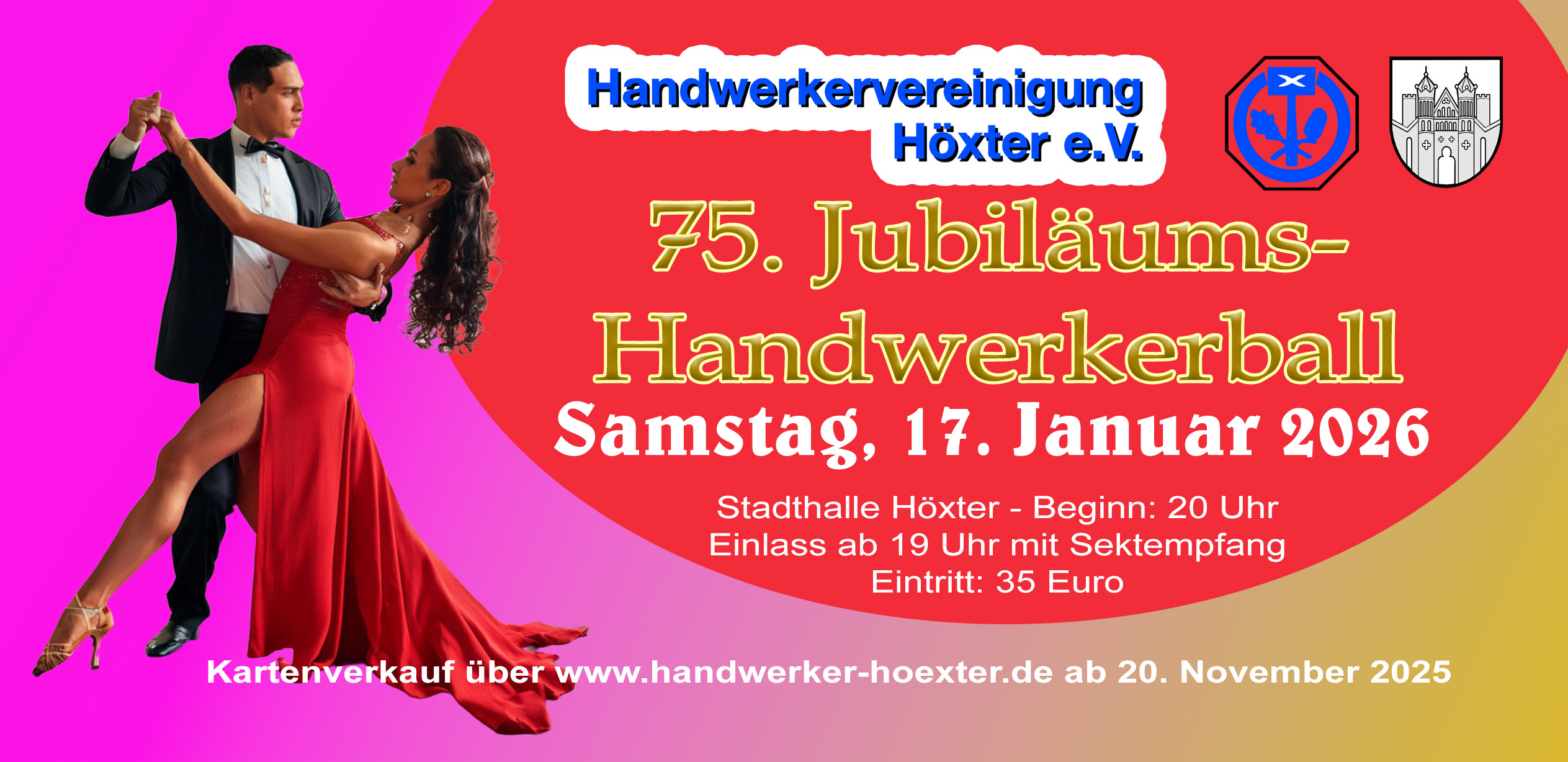 Höxter (red.). Die Handwerkervereinigung Höxter e.V. lädt am Samstag, 17. Januar 2026, zum 75. Jubiläums-Handwerkerball in die Stadthalle Höxter ein. Die Veranstalter kündigen einen festlichen Abend an, der an die Tradition früherer Bälle anknüpfen und zugleich besondere Akzente setzen soll.