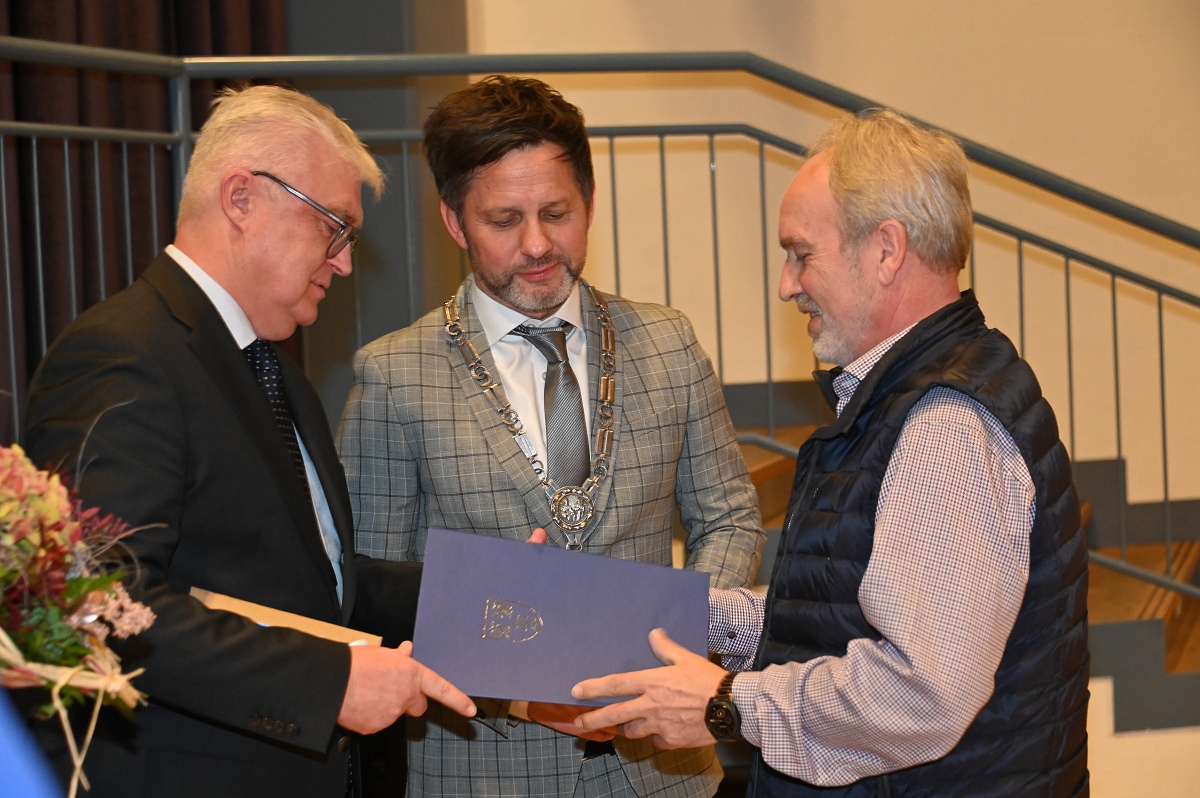 Mit drei Urkunden und Blumensträußen wurden zunächst die Ehrenamtspreisträger gewürdigt. Als einen „Mann, der anpackt“ bezeichnete Wenkel den ersten Preisträger, Lothar Rose aus Jakobsberg. In seiner Laudatio hob Bürgermeister Wenkel insbesondere Roses unermüdlichen Einsatz für sein Dorf hervor. Ob als kirchlicher Funktionsträger, für seine Renovierungsarbeiten an der Kapelle, dem Pfarrheim, dem Kriegerdenkmal oder am örtlichen Brunnen, Rose sei stets zur Stelle, wenn praktisch angepackt werden müsse. Mit handwerklichem Können setzte er Natursteinmauern instand, half beim Aufbau von Liegebänken und unterstützte zahlreiche Maßnahmen, die das Dorfleben verschönern. Auch beruflich habe er Spuren hinterlassen: als langjähriger Mitarbeiter des Bauhofs, als Hauswart im Asylbereich sowie als Hausmeister der Beverunger Schulen. Zudem bereichert er mit seinen Brüdern als Musiker regelmäßig Feste im Ort. Der Ehrenamtspreis geht an Lothar Rose, einen Mann, „der mit Taten überzeugt und mit seinem Wesen bereichert“, so der Bürgermeister.