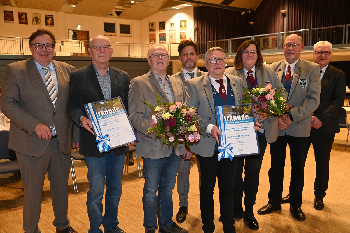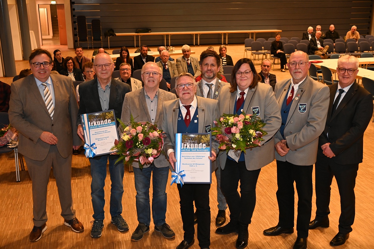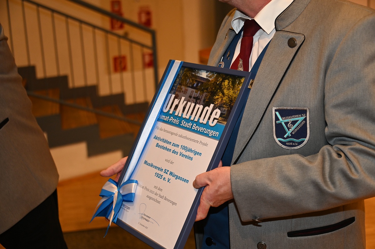 Sein 100-jähriges Bestehen mache laut Wenkel den Spielmannszug Würgassen zu einem besonderen Preisträger. Seit den 1920er Jahren begleitet der Verein Feste und Feiern in Würgassen, Beverungen und der ganzen Region. Besonders hervorgehoben wurde die kontinuierliche Jugendarbeit seit 1970: Zeltlager, Wanderungen, Ausflüge und ein eigener Jugendspielmannszug prägten Generationen von Kindern und Jugendlichen. Heute musizieren 40 aktive Mitglieder, 20 befinden sich in Ausbildung. Zudem organisiert der Verein seit über 40 Jahren den großen Karnevalsabend in Würgassen und hält mit dem Förderverein den Kinderkarneval lebendig. Der Heimatpreis 2025 geht an den Musikverein-Spielmannszug Würgassen 1925 e.V., der mit 3.000 Euro dotiert ist. Zum Abschluss der Feierstunde sprach Bürgermeister Wenkel allen Ausgezeichneten seinen Dank aus: „Sie alle sind Vorbilder – für unsere Stadt, für unsere Dörfer, für das Miteinander, das Beverungen ausmacht.“ Mit großem Applaus würdigten die Gäste die Preisträgerinnen und Preisträger, die durch ihr Wirken zeigen, wie vielfältig und wertvoll Ehrenamt und Heimat für Beverungen sind.