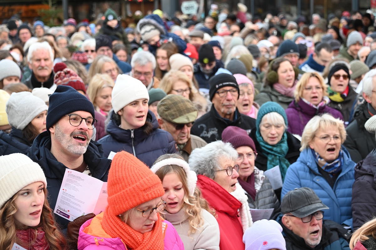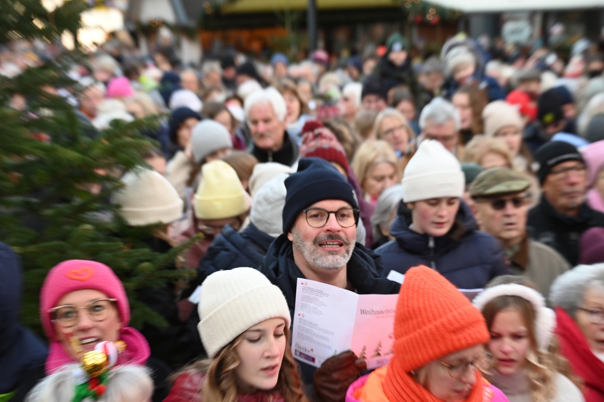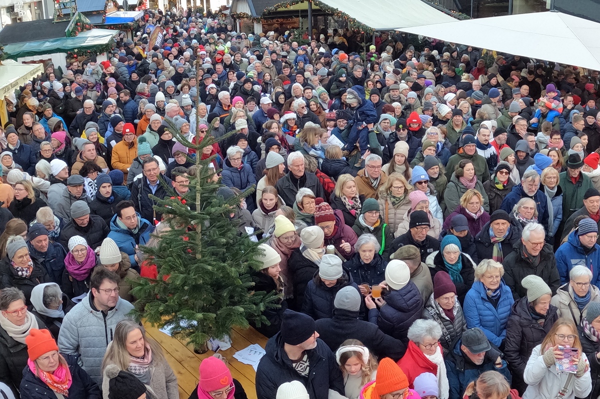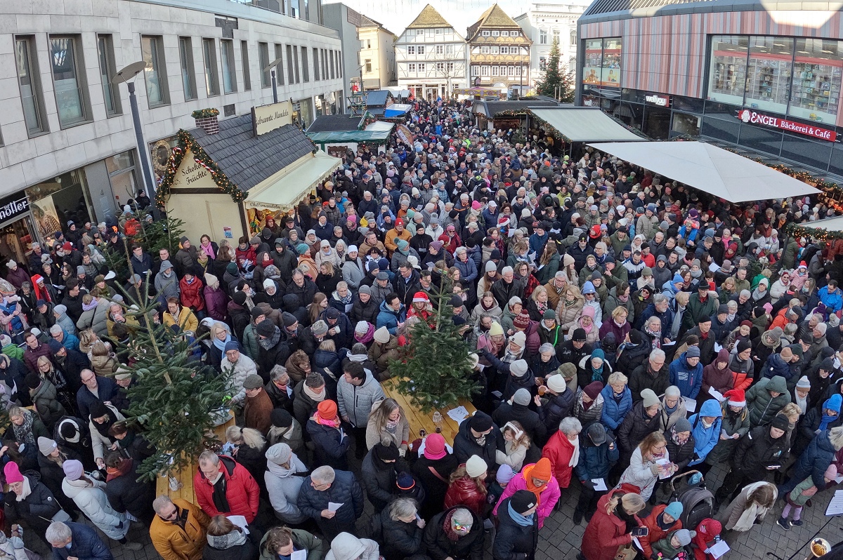 Höxter (TKu). Höxter hält zusammen und wünscht sich gegenseitig frohe Weihnachten: Höxters „gute Stube“ zeigte sich am Heiligabend von ihrer schönsten Seite: Kalt, aber sonnig und prall gefüllt mit Menschen. Mehr als 500 Bürgerinnen und Bürger versammelten sich auf dem Marktplatz von Höxter, um gemeinsam mit der Musikschule Höxter Weihnachtslieder zu singen, um damit das Weihnachtsfest einzuläuten. Von „Kling Glöckchen, klingelingeling“ bis „Leise rieselt der Schnee“ hat Höxter sich selbst wieder in Weihnachtsstimmung versetzt. Die Veranstaltung war auch zugleich der stimmungsvolle Abschluss des diesjährigen Weihnachtsmarktes. Musikalisch begleitet wurden die hunderte Sängerinnen und Sänger von der Musikschule Höxter, die durch ihre Blechbläser auf dem Marktplatz, wie auf einem Balkon ergänzt wurde. Die Kinderherzen höher schlagen ließ Carolin Franke, die das Weihnachtssingen als Solo-Sängerin mit dem Lied „Willst Du einen Schneemann bauen“ aus „Die Eiskönigin“ eröffnet hat. Auch wieder mit von der Partie waren die Solisten Sylvia Wiesemeyer-Koke (Sopran) und Georg Thauern (Bariton).