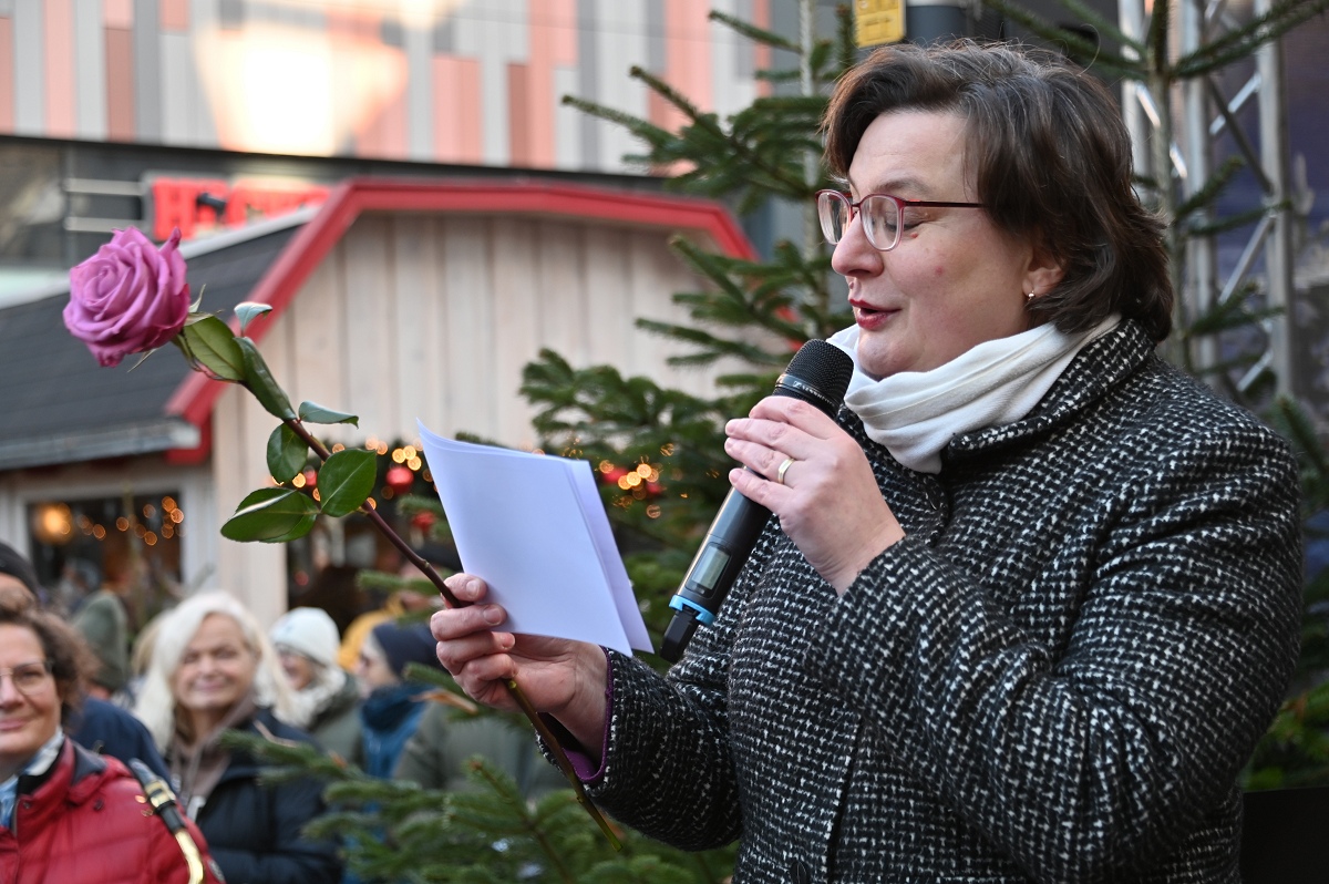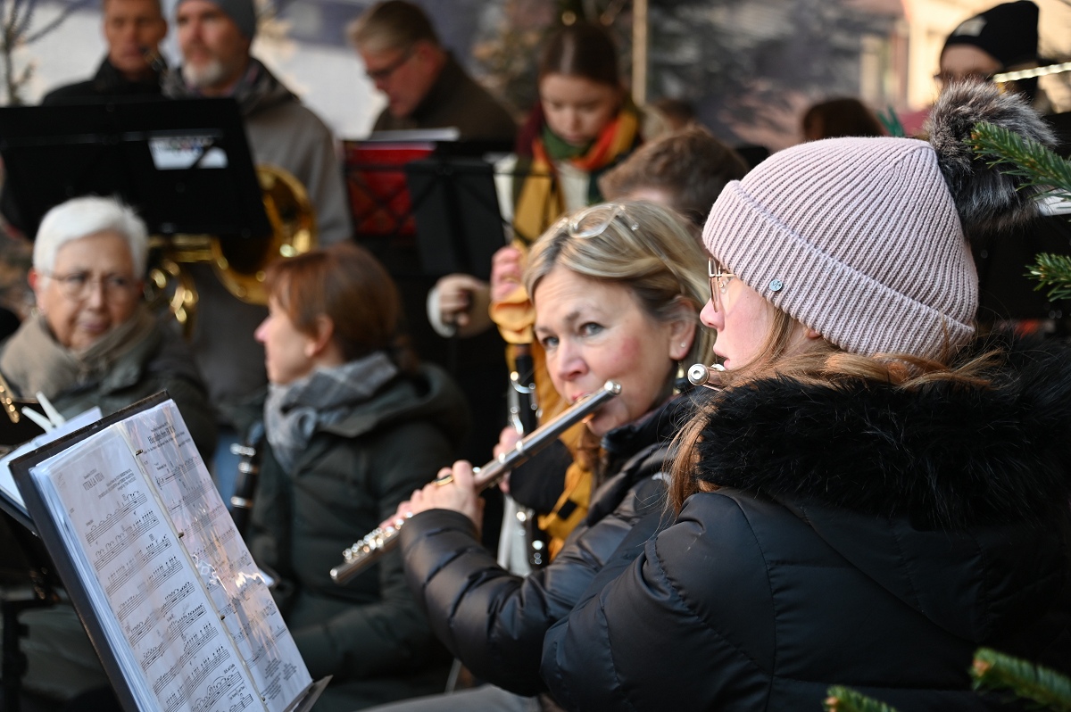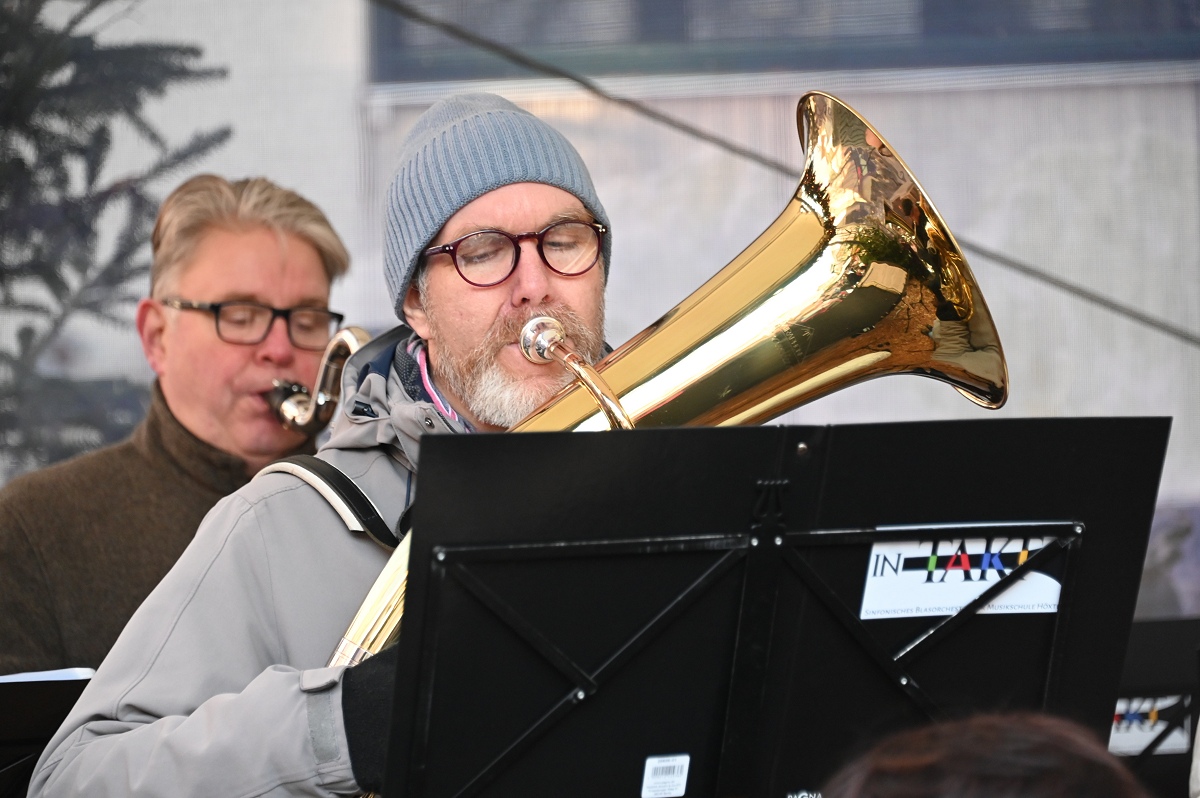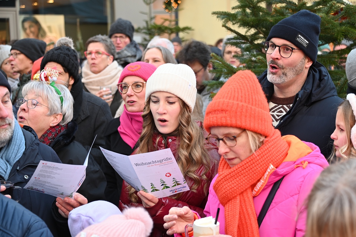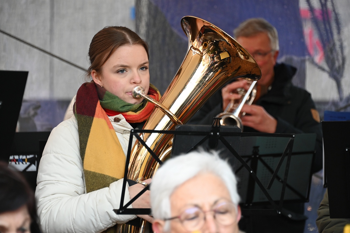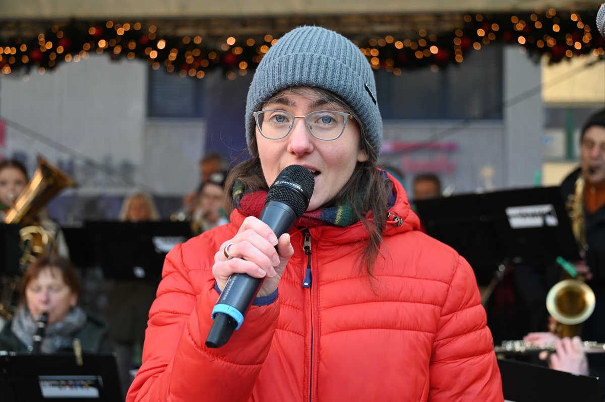 Musikschulleiterin Klaudia Knapp blickte in einer kurzen Ansprache zurück und erinnerte an die Anfänge der Musikschule, die vor wenigen Wochen 65 Jahre alt geworden ist. Ende November 1960 wurde das Jugendmusikwerk laut Claudia Knapp gegründet, der Vorläufer der heutigen Musikschule. Unterstützt wurde das Weihnachtssingen zudem von den Turmbläsern Stefan Balke vom Weserberglandorchester Bödexen und Jonathan Mann von den Hochstiftmusikanten, die vom Balkon über Thalia aus einzelne Musikstücke anstimmten und so für eine besondere Klangatmosphäre sorgten. Bürgermeister Daniel Hartmann wünschte allen Menschen „frohe Festtage“, dankte den Mitwirkenden für ihr Engagement. Er hob den starken Gemeinschaftssinn in Höxter hervor und betonte die Bedeutung des letzten Liedes „Stille Nacht, heilige Nacht“ als Zeichen von Frieden, Hoffnung und Zusammenhalt, ein Lied, das wie kaum ein anderes für Frieden in der Welt steht.