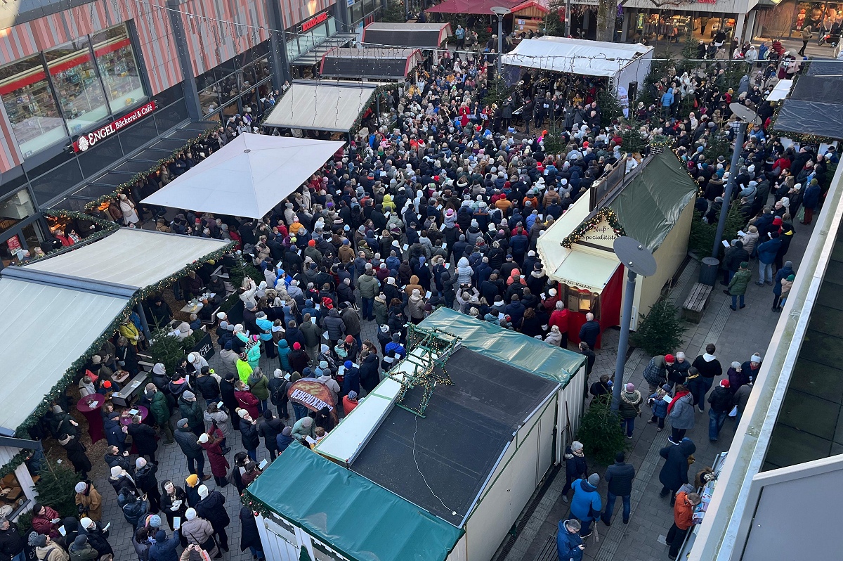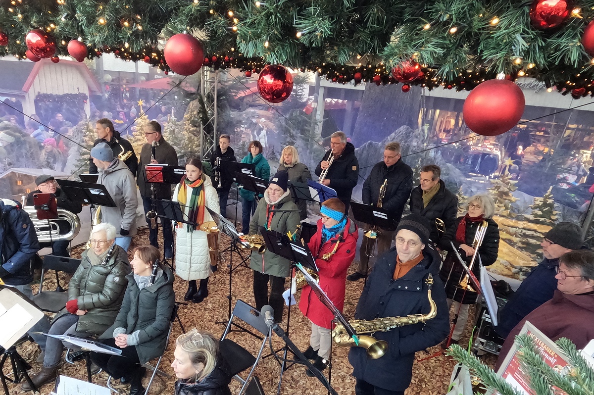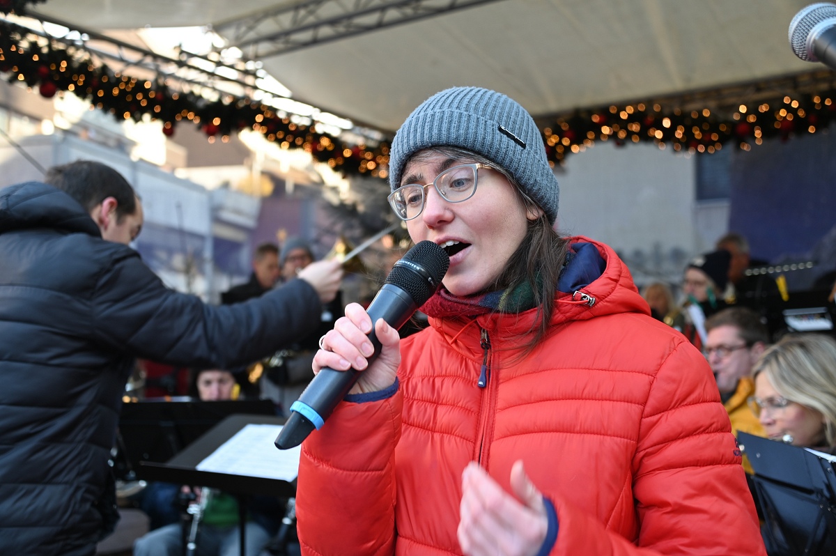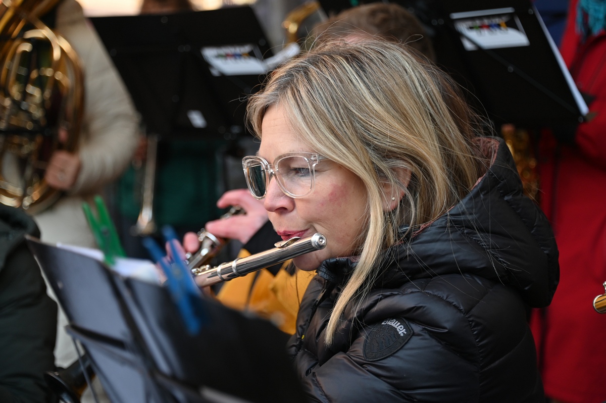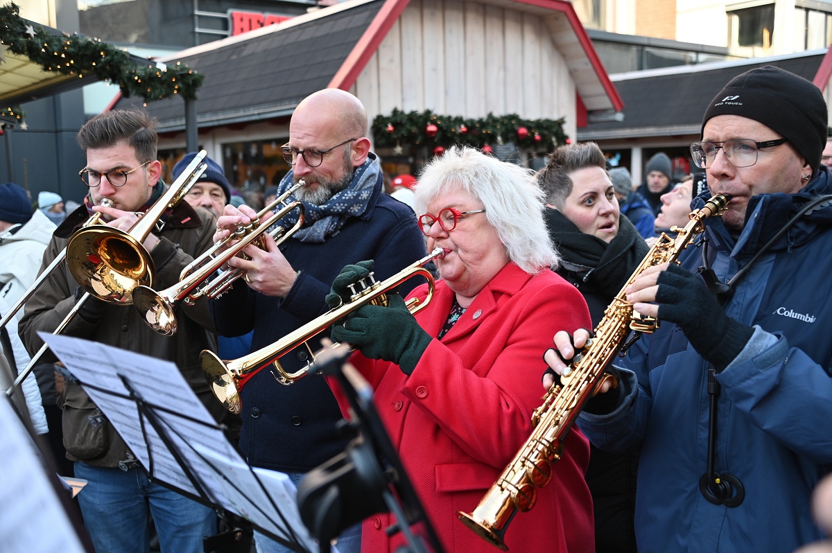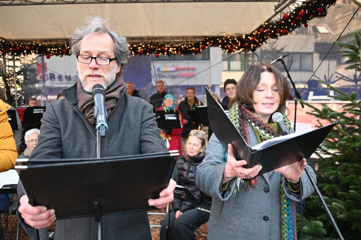 Musikschulleiterin Klaudia Knapp blickte in einer kurzen Ansprache zurück und erinnerte an die Anfänge der Musikschule, die vor wenigen Wochen 65 Jahre alt geworden ist. Ende November 1960 wurde das Jugendmusikwerk laut Claudia Knapp gegründet, der Vorläufer der heutigen Musikschule. Unterstützt wurde das Weihnachtssingen zudem von den Turmbläsern Stefan Balke vom Weserberglandorchester Bödexen und Jonathan Mann von den Hochstiftmusikanten, die vom Balkon über Thalia aus einzelne Musikstücke anstimmten und so für eine besondere Klangatmosphäre sorgten. Bürgermeister Daniel Hartmann wünschte allen Menschen „frohe Festtage“, dankte den Mitwirkenden für ihr Engagement. Er hob den starken Gemeinschaftssinn in Höxter hervor und betonte die Bedeutung des letzten Liedes „Stille Nacht, heilige Nacht“ als Zeichen von Frieden, Hoffnung und Zusammenhalt, ein Lied, das wie kaum ein anderes für Frieden in der Welt steht.