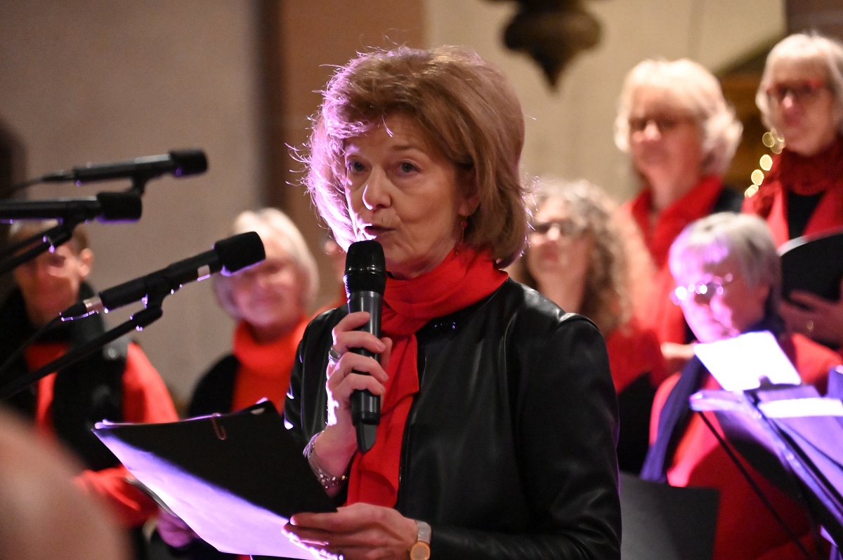 Ein besonderer Höhepunkt des Abends war der tänzerische Auftritt von Anke Schregel, die zum Lied „Lord Of The Dance“ mit ausdrucksstarker Bewegung die Kirche förmlich zum Leben erweckte. Während sie durch die Reihen schritt, wurde sie von den kraftvollen Stimmen des Chors begleitet und sorgte für einen magischen Moment. Für einen weiteren Gänsehautmoment sorgte der 20-jährige Timo Ising. Mit seiner gefühlvollen Interpretation von „Du bist so“ berührte der junge Mann mit Handycap die Herzen der Anwesenden. Seine ausdrucksstarke Stimme und lebhaften Gesten machten diesen Auftritt zu einem emotionalen Höhepunkt des Konzerts und setzten zugleich ein starkes Zeichen für gelebte Inklusion. Musikalisch überzeugten die LIVING VOICES mit einem abwechslungsreichen Repertoire. Neu arrangierte Weihnachtsklassiker wie „Winter Wonderland“, „Santa Claus Is Coming to Town“, „Shepherds Run“ und „Feliz Navidad“ sorgten für vertraute Melodien in frischem Gewand. Passend zum 15-Jährigen erklangen insgesamt auch 15 Titel. Für besondere Klangfarben sorgte erneut die dreiköpfige Band mit dem britischen Keyboarder Peter Moss, Bassist Peter Kros und Percussionist Yukinobu Ishikawa. Die Soloparts wurden von den vereinseigenen Sängerinnen und Sängern Monique Sandmann, Nicole Timmermann, Johanna Potthast, Werner Humann, Heiner Wiemers-Meyer sowie Matthias Kämpfer und Walter Cappell übernommen. Zusätzliche Instrumentalbeiträge, unter anderem von Helena Holletzek an der Blockflöte, rundeten das Klangbild ab. Zum Abschluss des Konzerts erhob sich das Publikum zu stehenden Ovationen und daher gab es auch noch eine Zugabe.