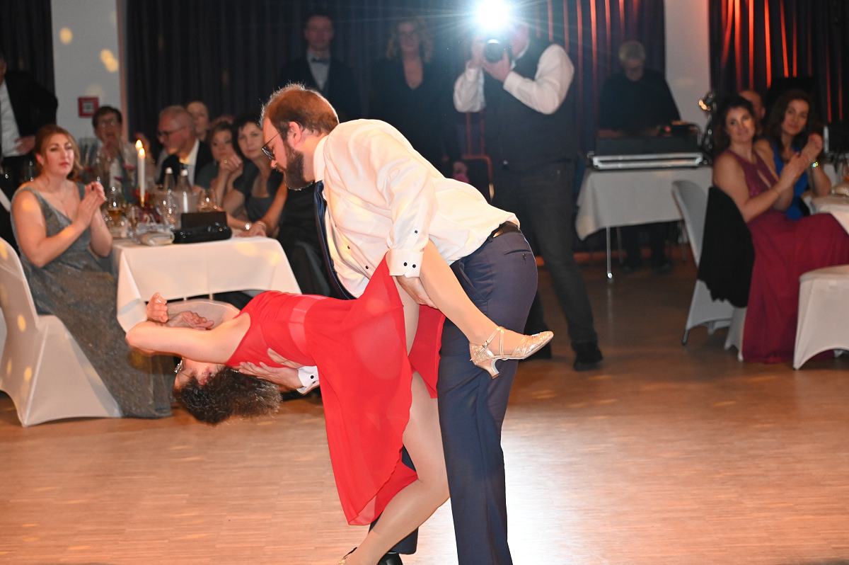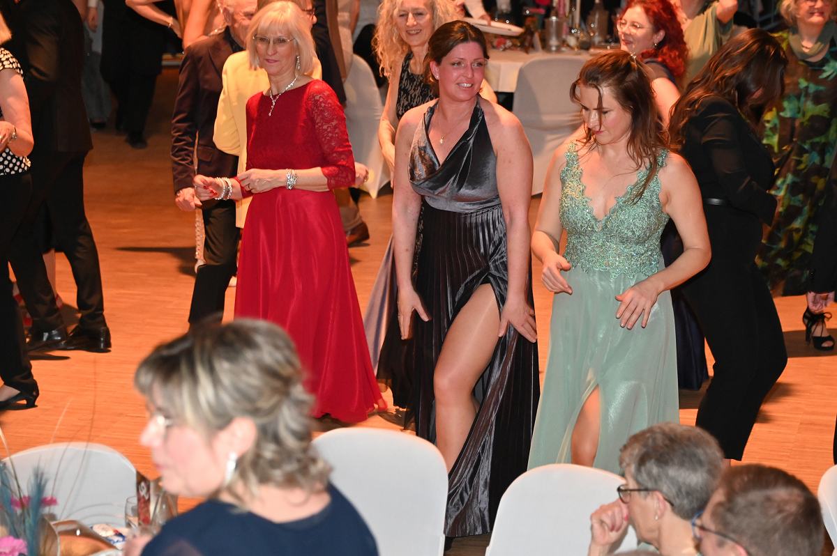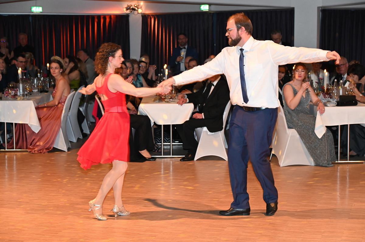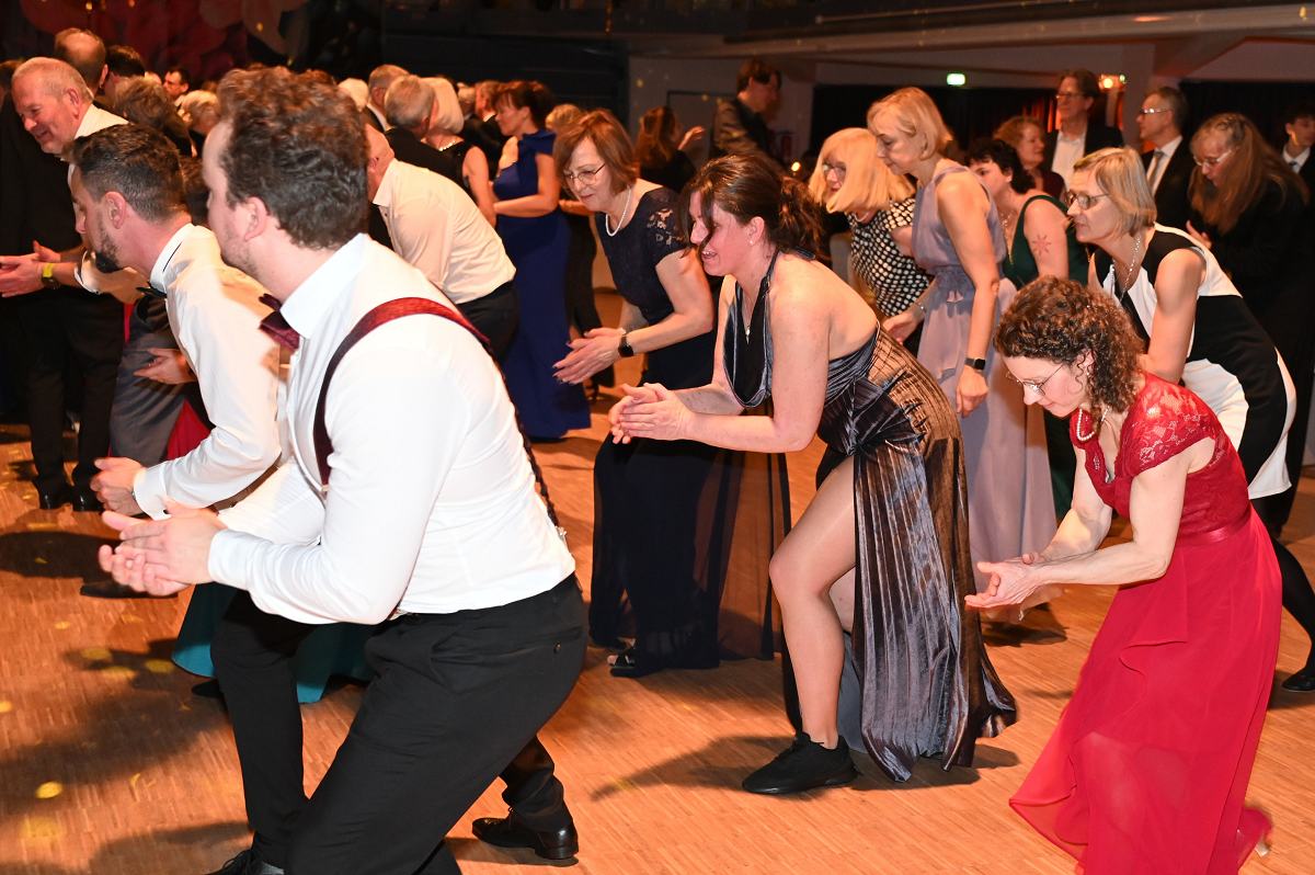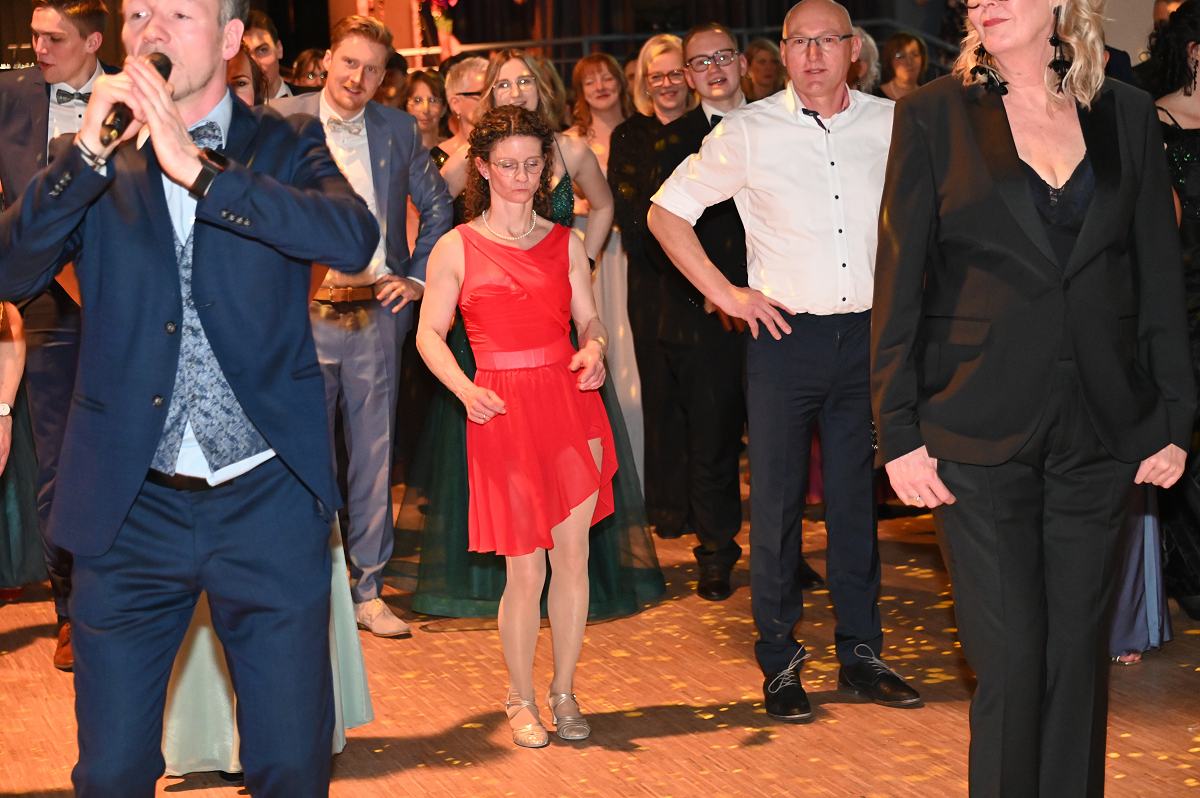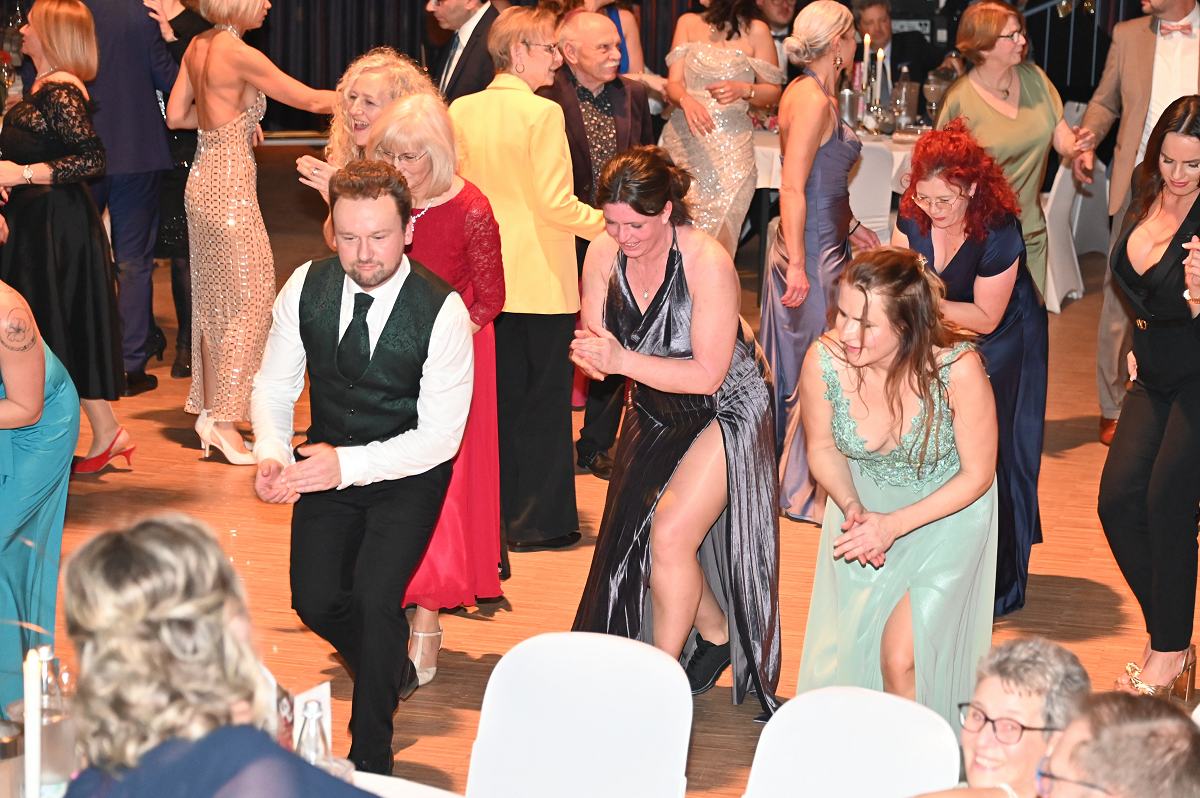 Doch statt Enttäuschung folgte Begeisterung: Ball-Besucher Daniel Hesse von der Tanzschule Hesse aus Heiligenstadt sprang spontan ein und „rettete“ den zweiten Hauptact. Mit einer Line-Dance-Vorführung, Animationen und einem eigenen Tanzpaar brachte Hesse die Stimmung zum Kochen. „Wir haben uns das aus den Fingern gesogen“, sagte er schmunzelnd und traf damit genau den Geschmack des Publikums. Besonders der Auftritt des Tanzpaares Diana und Michael aus Heiligenstadt zum Song „Pretty Woman“ sorgte für großen Applaus. Insgesamt war die Gruppe mit 26 Personen vertreten. Für Daniel Hesse schloss sich dabei ein Kreis: Bereits vor 15 Jahren hatte er in der Stadthalle Beverungen Tanzkurse gegeben. Seine Verbundenheit zum Kulturball sei bis heute geblieben. Für die musikalische Begleitung sorgten Jürgen Becker und seine Amorados Showband. Die achtköpfige Formation überzeugte erneut mit ihrer großen musikalischen Bandbreite und direkter Publikumsnähe. Die Tanzfläche blieb daher durchgehend gut gefüllt, wenn sie vom Walzer bis Disco-Fox mit einer großen Bandbreite an bester Ball-Musik begeisterten.