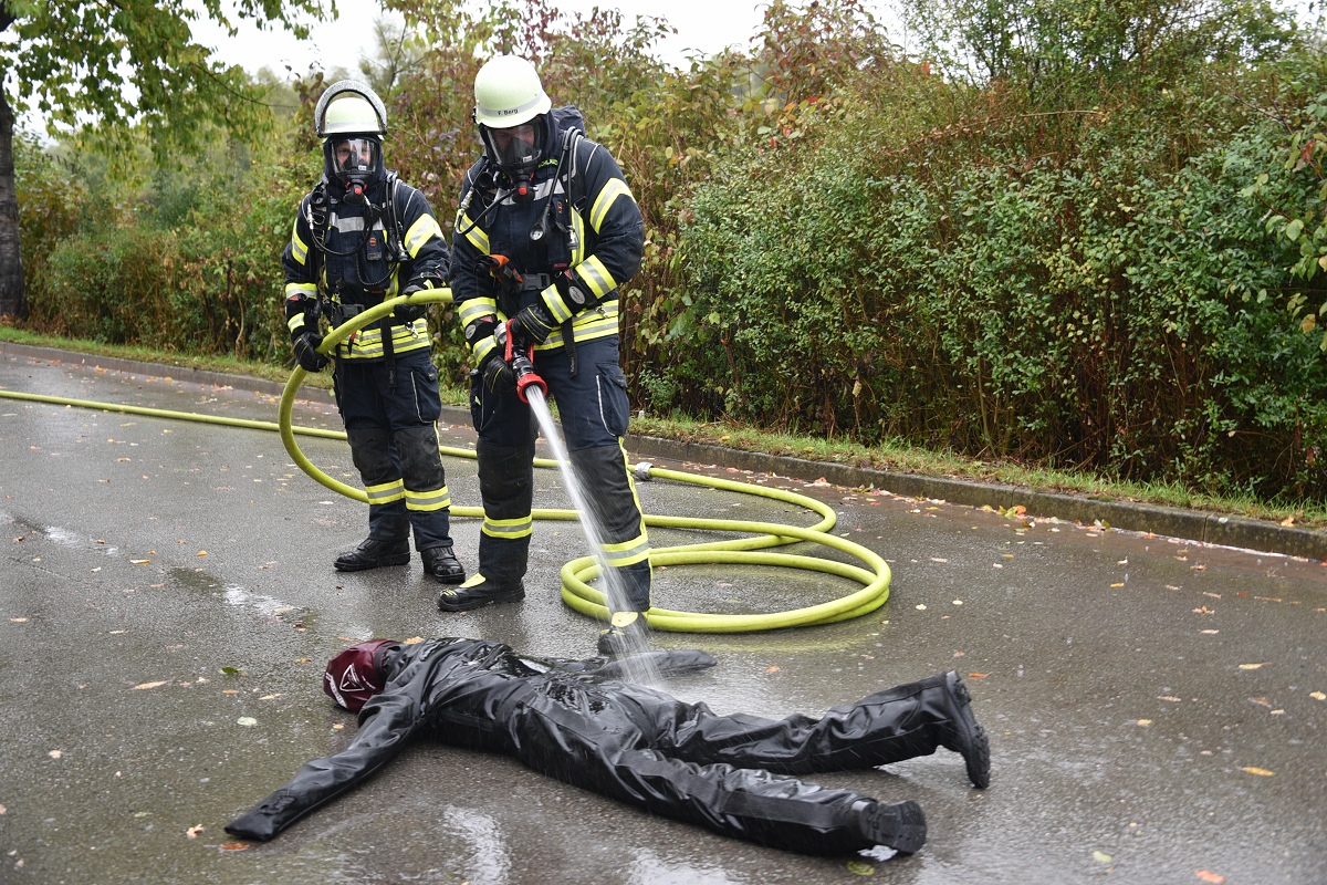 Gefährlich wurde es am Weseranger, wo ein Lkw mit Gefahrgutkennzeichnung Flüssigkeiten verlor. Hier galt es, die Lage nach dem sogenannten „GAMS-Schema“ abzuarbeiten, sprich die Gefahr erkennen, absperren, Menschenrettung einleiten und Spezialkräfte nachfordern. Die Feuerwehr rettete zwei Personen unter Atemschutz und zog sich danach wieder schnell zurück. Wichtig war unter anderem zu erkennen, dass dieser Stoff nicht mit Wasser in Berührung kommen darf, was auf der Warntafel an dem Gefahrgut-Lkw das „X“ vor der Gefahrzahl bedeute, erklärt der Pressesprecher. Bei dem ausgetretenen Stoff sollte es sich um Siliciumtetrachlorid handeln, eine farblose Flüssigkeit mit erstickendem Geruch, die in Gegenwart von Feuchtigkeit die meisten Metalle stark angreift und bei Kontakt mit Wasser heftig reagiert, wobei das ätzende Gas Chlorwasserstoff freigesetzt wird.