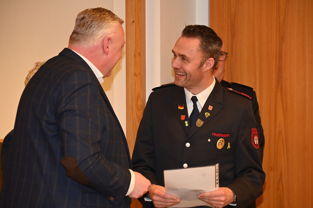 Eine besondere Ehrung wurde Hauptfeuerwehrmann Ludger Heine zuteil. Für seine 40-jährige aktive Mitgliedschaft in der Freiwilligen Feuerwehr verlieh Stadtbrandinspektor Jürgen Schmits ihm eine Urkunde sowie das Sonderabzeichen des Landesfeuerwehrverbandes. Sowohl der Leiter der Feuerwehr als auch Bürgermeister Daniel Hartmann dankten ihm für seinen jahrzehntelangen Einsatz. Aus gesundheitlichen Gründen trat Ludger Heine aus der ersten Reihe der aktiven Feuerwehrleute zurück und wurde in die Ehrenabteilung versetzt. Unter großem Applaus der Mannschaft verabschiedete ihn Jürgen Schmits mit einer Urkunde. Für ihre zehnjährige aktive Mitgliedschaft wurden Unterbrandmeister Timo Heine und Fabian Rosner in Abwesenheit sowie Hauptfeuerwehrmann Julian Jöhren und Unterbrandmeister Maximilien Meise ausgezeichnet. Urkunden für 20 Jahre aktive Mitgliedschaft überreichte Löschgruppenführer Andreas Bohnenpoll an Rudolf Lützer, Patrick Haller und Lukas Heine.