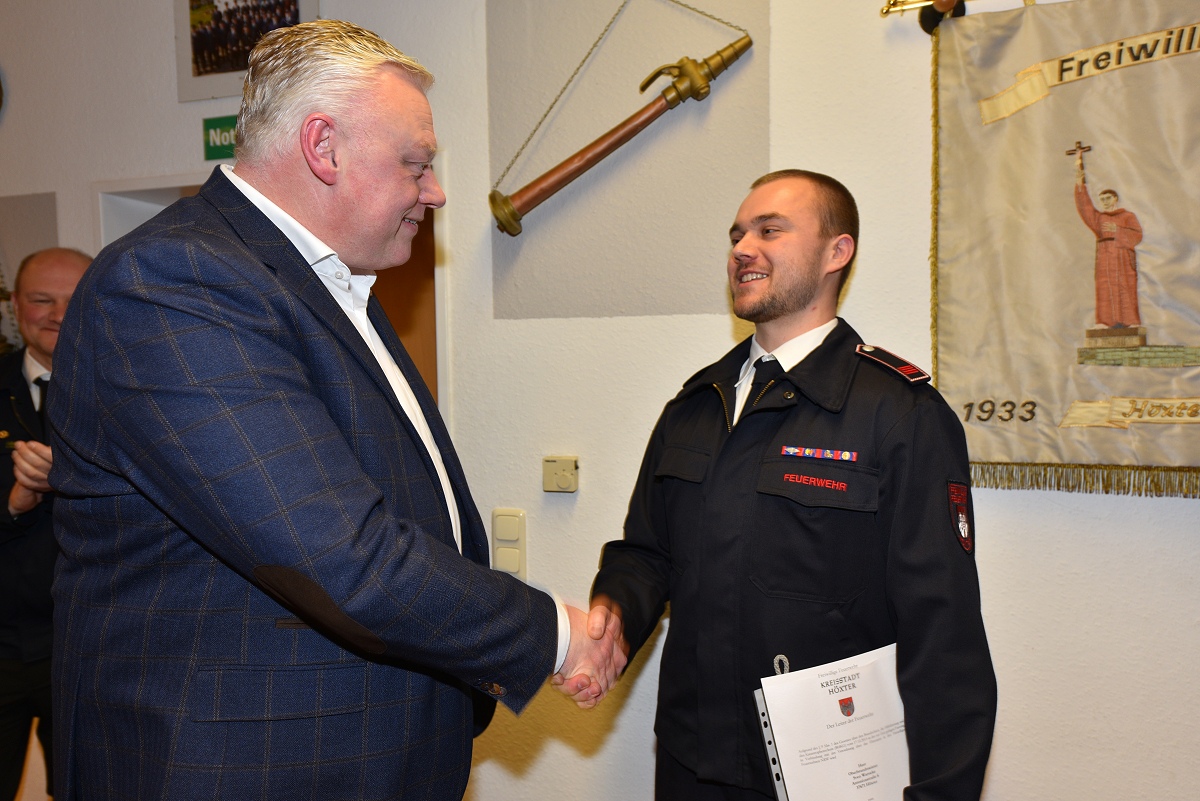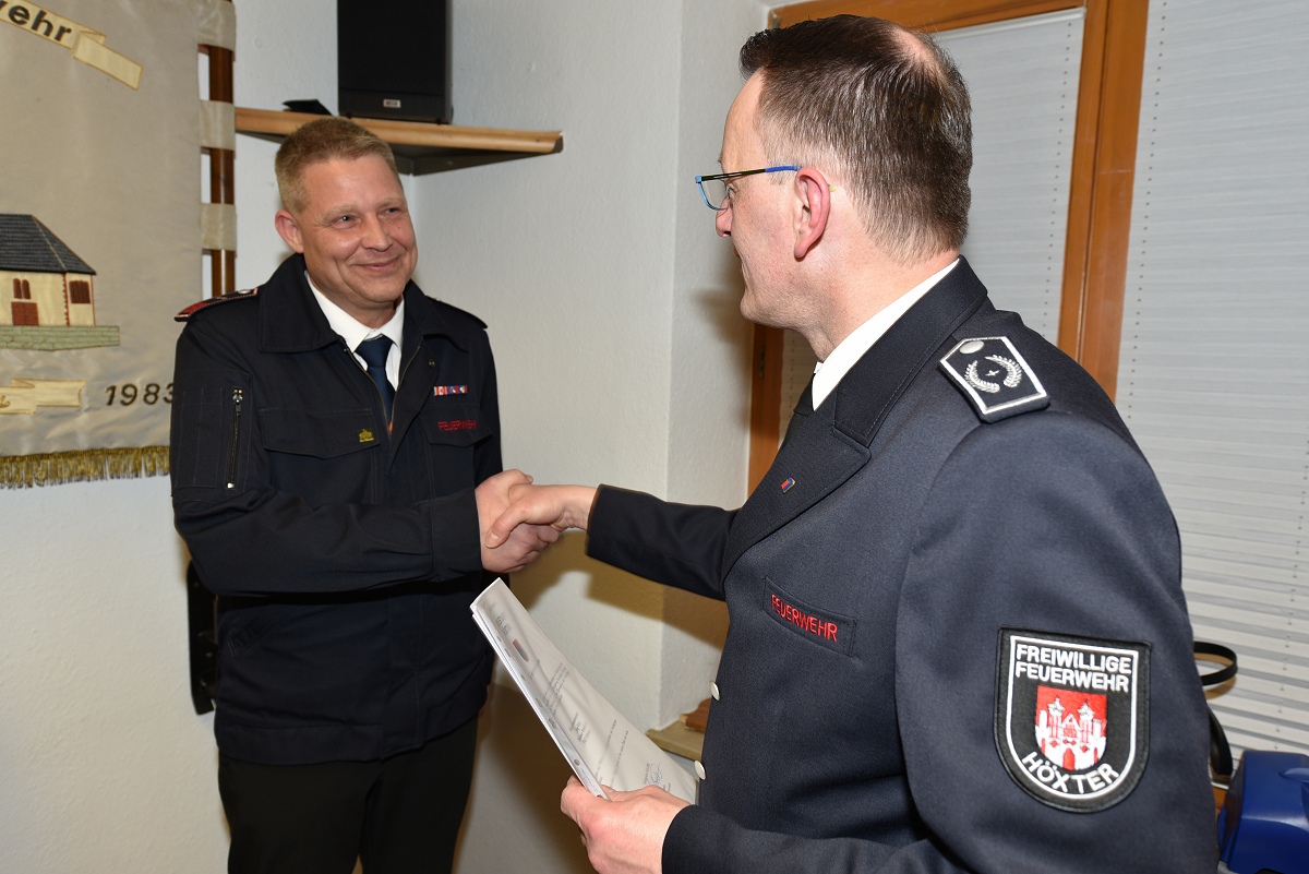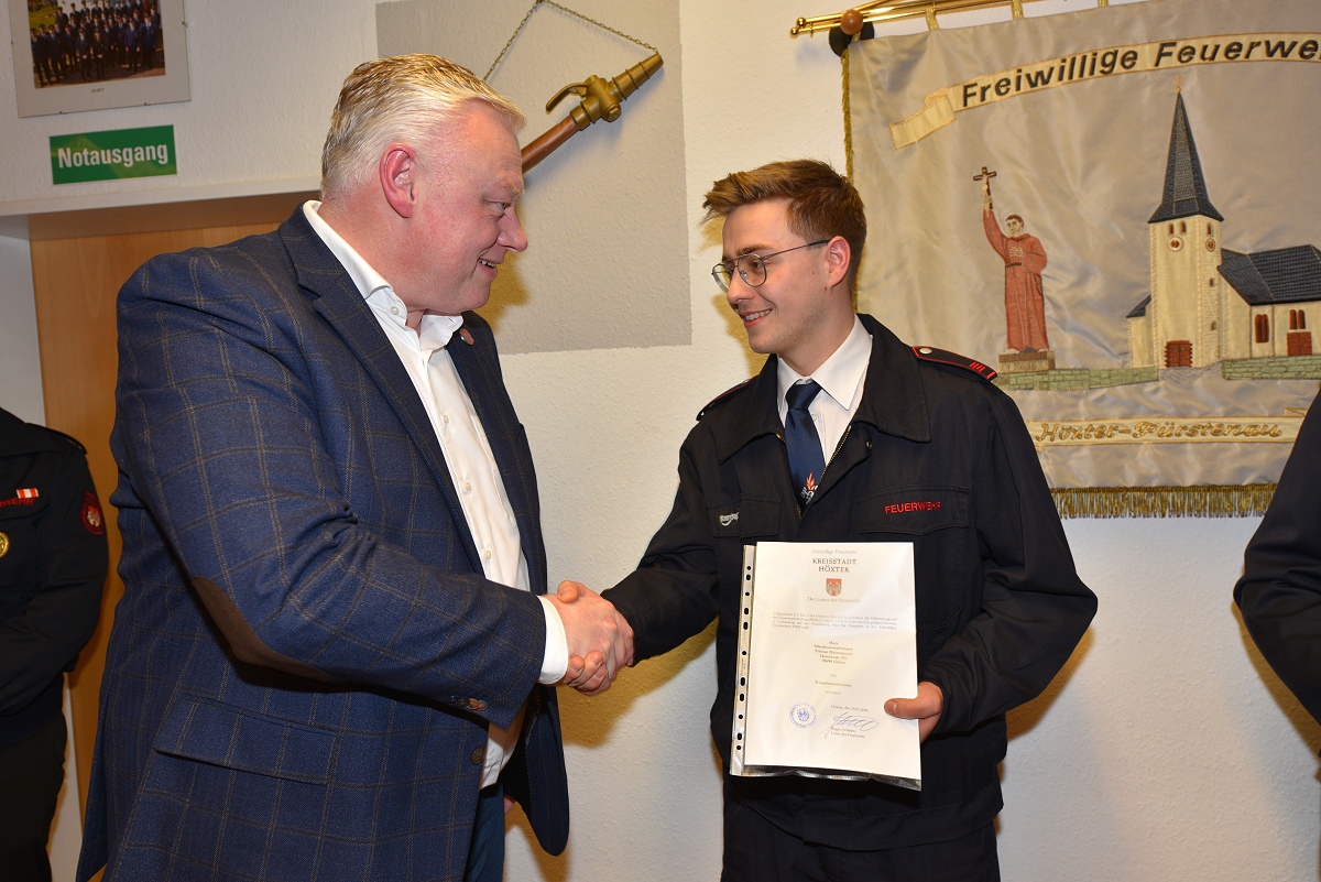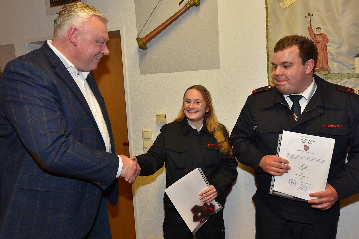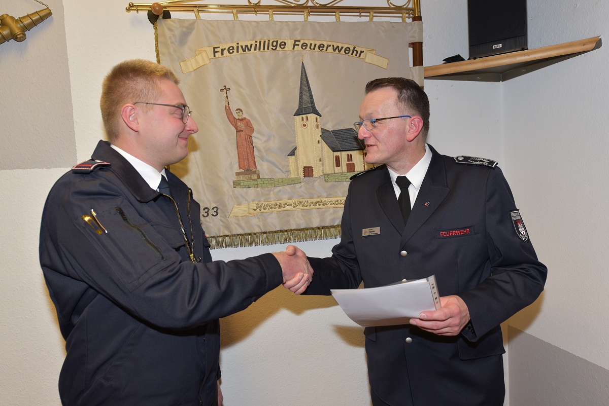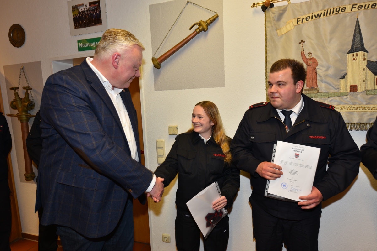 Feuerschutz-Sachbearbeiterin Stefanie Buhmann von der Stadt Höxter, berichtete über die laufenden Planungen zum Ersatz des 24 Jahre alten Einsatzfahrzeuges vom Typ HLF 10. Das neue Fahrzeug soll gemeinsam mit der Löschgruppe Ovenhausen beschafft werden, die ein baugleiches Modell erhalten soll. Bürgermeister Daniel Hartmann würdigte in seinem Grußwort die Einsatzstärke, den Zusammenhalt sowie die vielfältigen Aufgaben der Löschgruppe Fürstenau. Er betonte, dass die Stadt Höxter geschlossen hinter ihrer Feuerwehr stehe. Zum Abschluss der Versammlung nahm Stadtbrandinspektor Rainer Höppner zahlreiche Beförderungen und Ehrungen vor. Sven Warneke wurde zum Brandinspektor befördert. Tristan Heinemeyer erhielt die Beförderung zum Unterbrandmeister, Angelina Sobotta zur Oberfeuerwehrfrau, Aron Kanand zum Oberfeuerwehrmann. Zu Feuerwehrmännern ernannt wurden Lennard Schünemann und Sören Lange. Eine besondere Auszeichnung ging an Brandinspektor Olaf Dittrich, der für 35 erfolgreiche Teilnahmen mit dem Leistungsabzeichen in Gold geehrt wurde.
