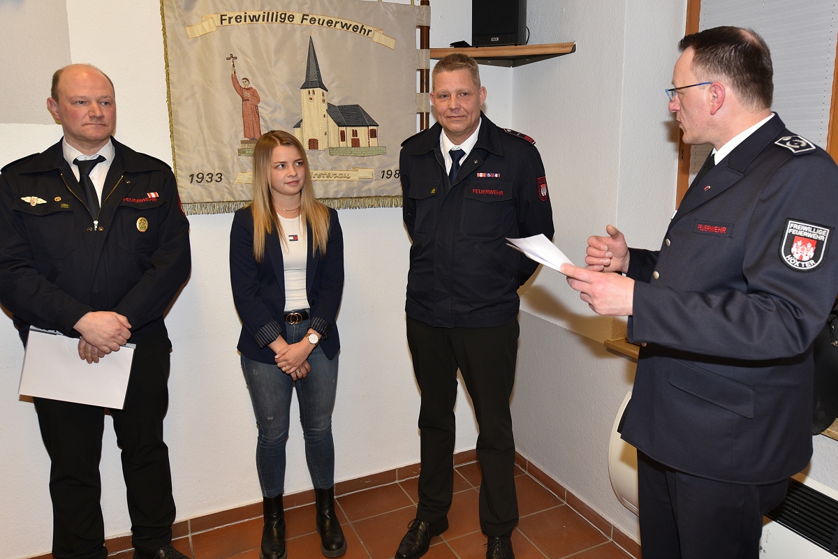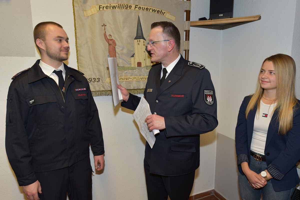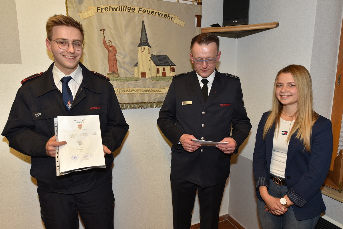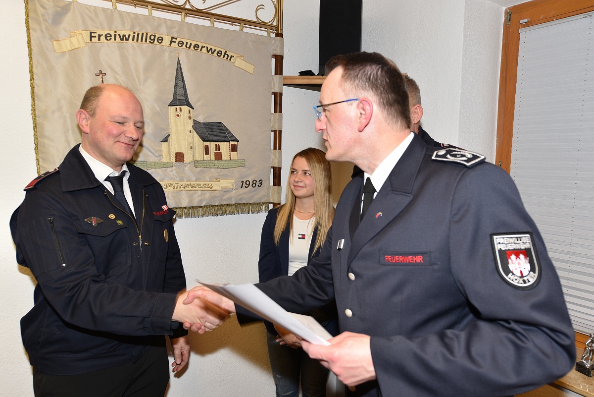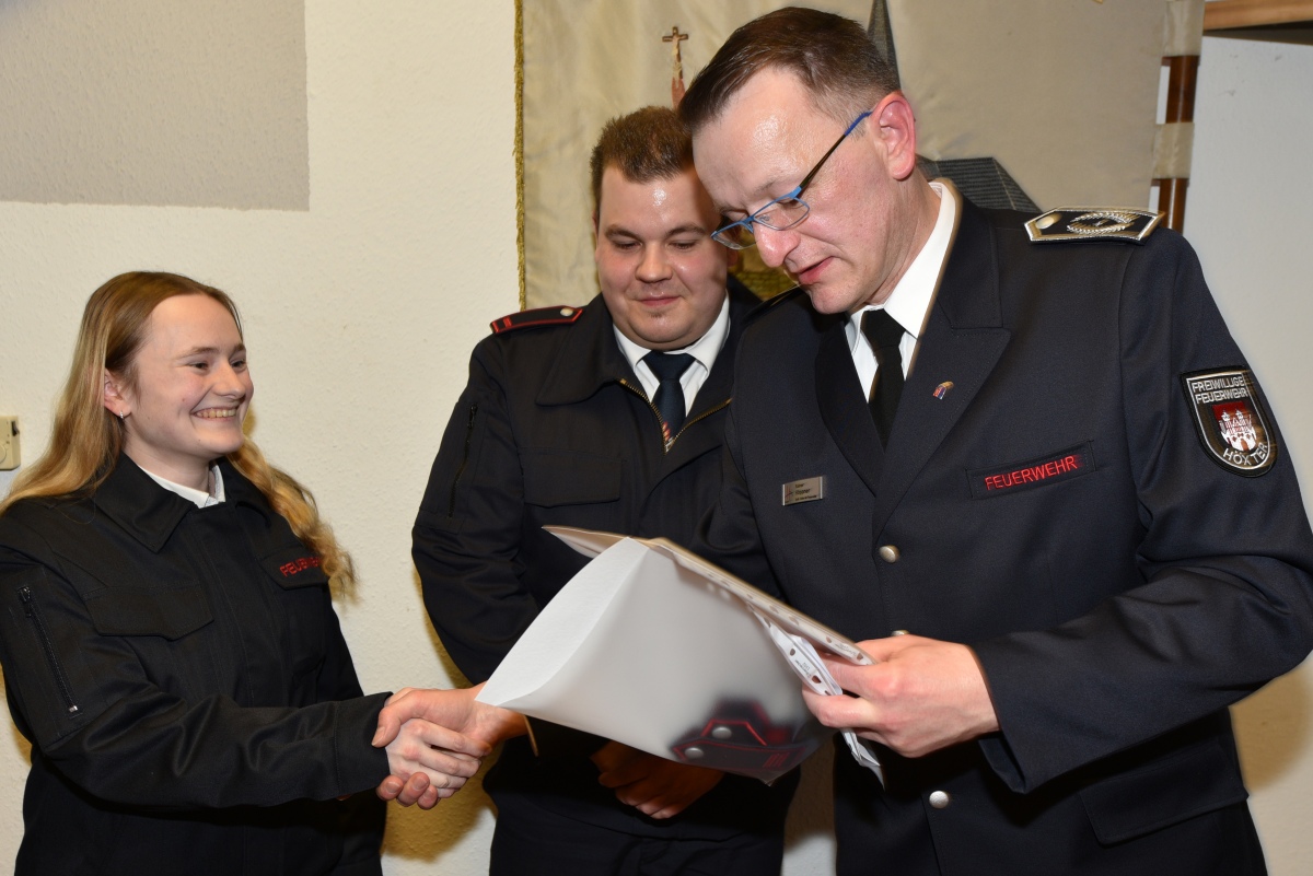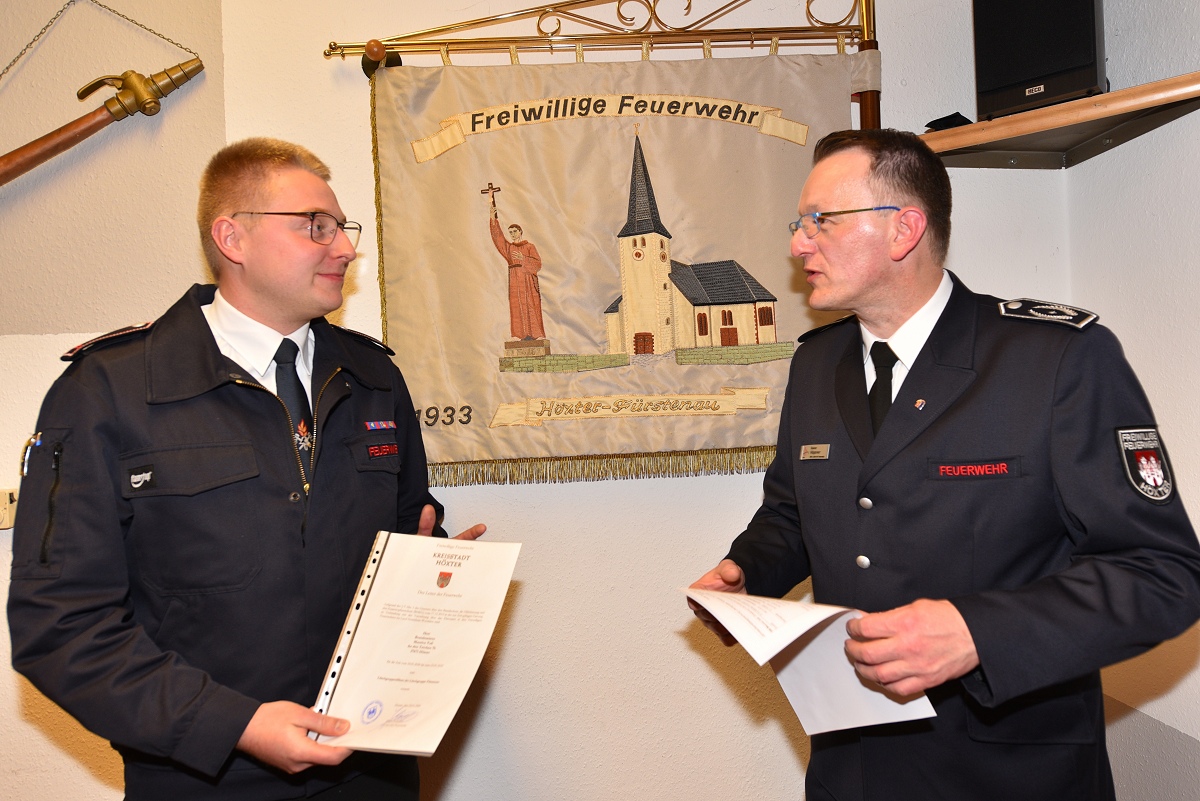 Feuerschutz-Sachbearbeiterin Stefanie Buhmann von der Stadt Höxter, berichtete über die laufenden Planungen zum Ersatz des 24 Jahre alten Einsatzfahrzeuges vom Typ HLF 10. Das neue Fahrzeug soll gemeinsam mit der Löschgruppe Ovenhausen beschafft werden, die ein baugleiches Modell erhalten soll. Bürgermeister Daniel Hartmann würdigte in seinem Grußwort die Einsatzstärke, den Zusammenhalt sowie die vielfältigen Aufgaben der Löschgruppe Fürstenau. Er betonte, dass die Stadt Höxter geschlossen hinter ihrer Feuerwehr stehe. Zum Abschluss der Versammlung nahm Stadtbrandinspektor Rainer Höppner zahlreiche Beförderungen und Ehrungen vor. Sven Warneke wurde zum Brandinspektor befördert. Tristan Heinemeyer erhielt die Beförderung zum Unterbrandmeister, Angelina Sobotta zur Oberfeuerwehrfrau, Aron Kanand zum Oberfeuerwehrmann. Zu Feuerwehrmännern ernannt wurden Lennard Schünemann und Sören Lange. Eine besondere Auszeichnung ging an Brandinspektor Olaf Dittrich, der für 35 erfolgreiche Teilnahmen mit dem Leistungsabzeichen in Gold geehrt wurde.