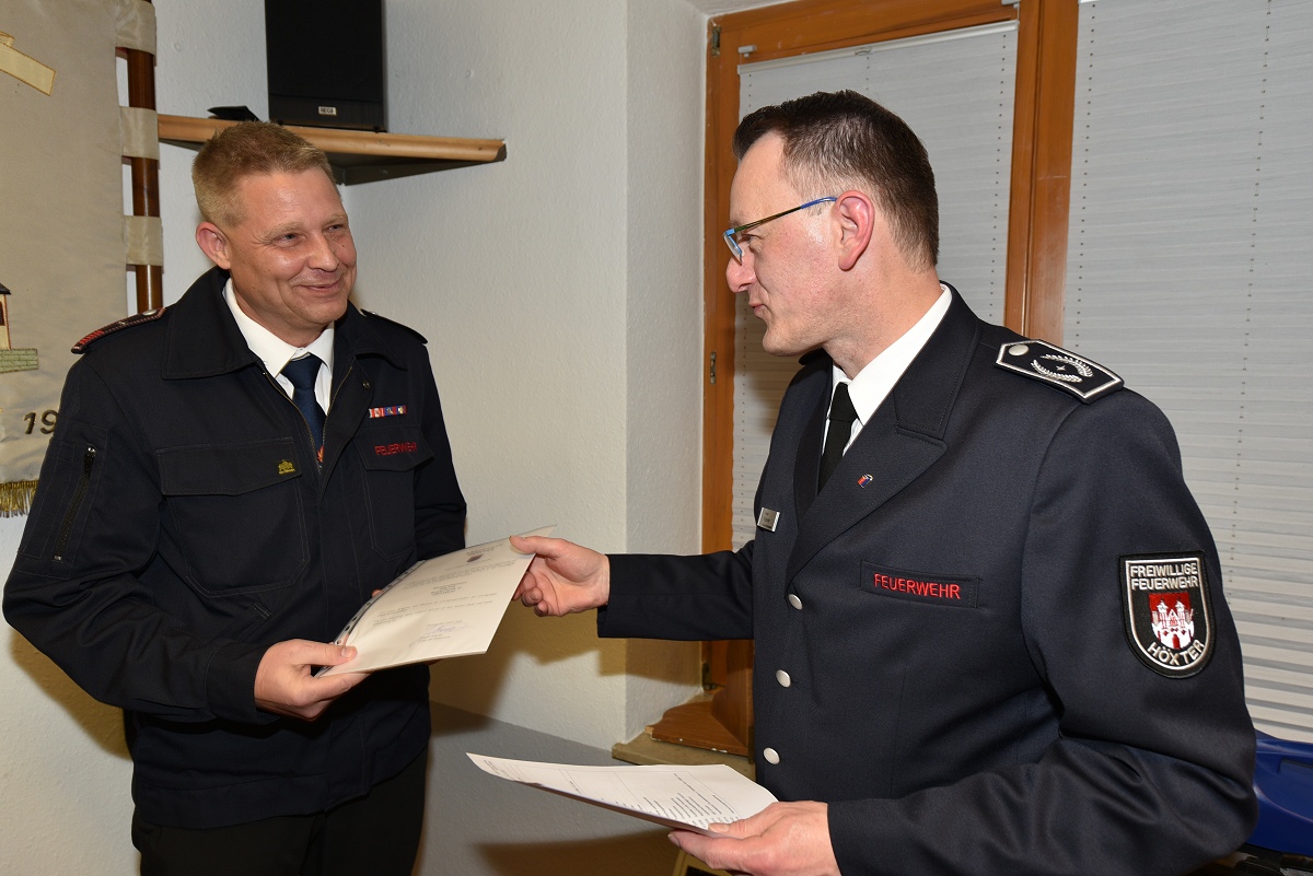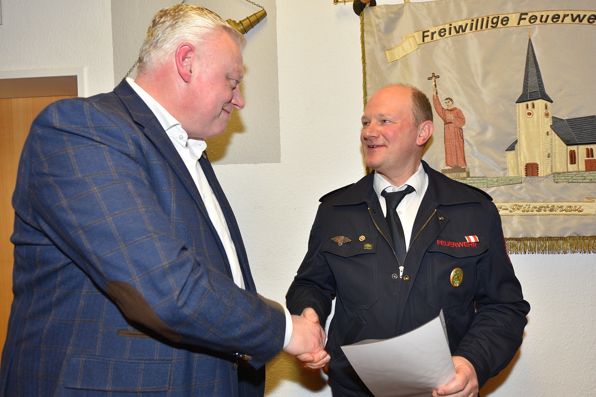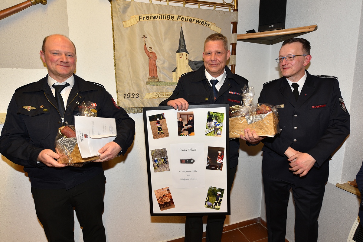 Mit dem Abschied von Jörg Voss und Manuel Bergmann endete eine 19-jährige gemeinsame Führungszeit. Jörg Voss ist seit 34 Jahren Mitglied der Freiwilligen Feuerwehr. Von 2007 bis 2012 leitete er die Löschgruppe Fürstenau, war ab 2011 zusätzlich als kommissarischer Löschzugführer aktiv und übernahm ab 2012 auch die Aufgabe des Atemschutzgerätewarts. 2016 wechselte er nach vier Jahren als stellvertretender Löschgruppenführer wieder zurück in die erste Reihe. Auch Manuel Bergmann blickt auf mehr als 30 Jahre aktiven Dienst zurück. Seine Laufbahn in der Führungsverantwortung begann 2007 als stellvertretender Löschgruppenführer. 2012 übernahm er für vier Jahre die Führung der Löschgruppe von Jörg Voss, bevor er ab 2016 wieder als dessen Stellvertreter tätig war. Fast 20 Jahre lang trugen beide gemeinsam Verantwortung an der Spitze der Löschgruppe. Die Kameradinnen und Kameraden verabschiedeten sie mit Geschenken und langanhaltendem Applaus.
