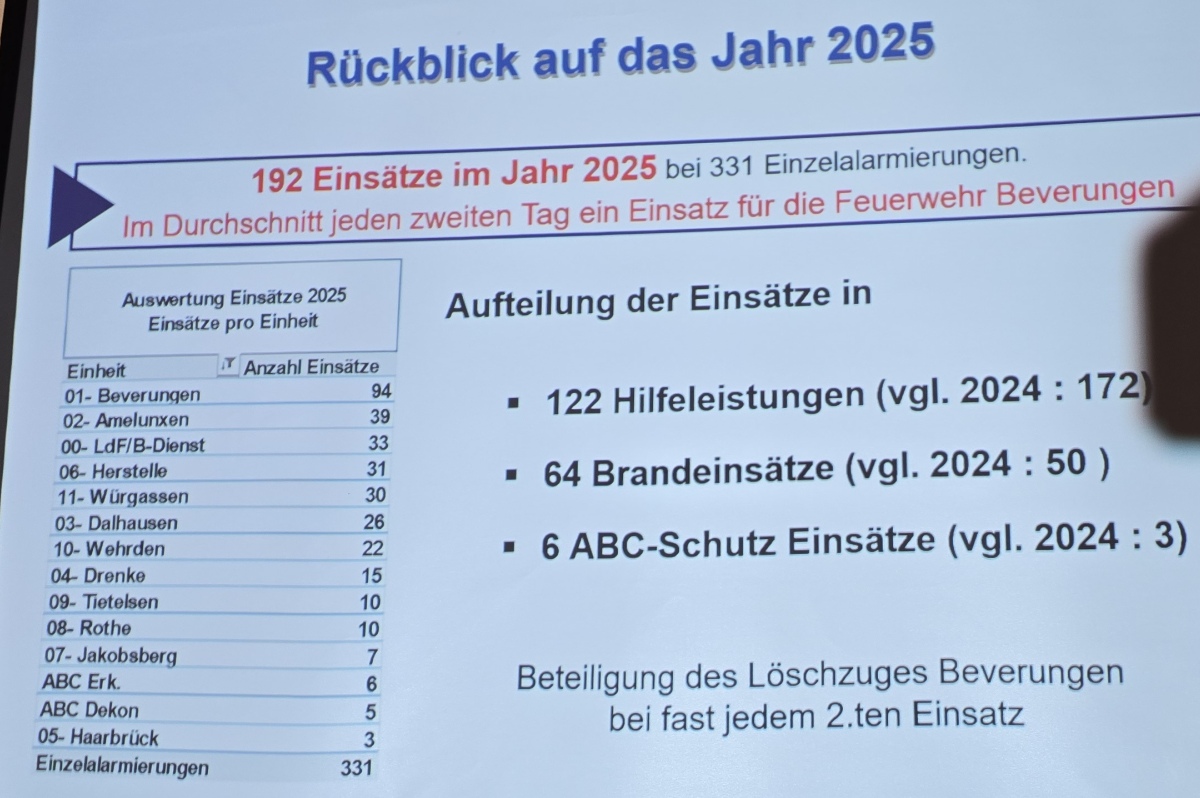 Die vorgestellte Einsatzstatistik unterstrich die Belastung der Feuerwehr Beverungen. Insgesamt wurden 192 Einsätze bewältigt, also im Durchschnitt nahezu jeden zweiten Tag ein Einsatz. Diese gliederten sich in 122 technische Hilfeleistungen, 64 Brandalarme und sechs ABC-Einsätze im Bereich Gefahrgut. Den größten Anteil trug der Löschzug Beverungen mit 94 Einsätzen. Es folgten die Löschgruppen Amelunxen mit 39 Einsätzen, Herstelle mit 31 Einsätzen, Würgassen mit 30 Alarmierungen und Dalhausen mit 26 Einsätzen.