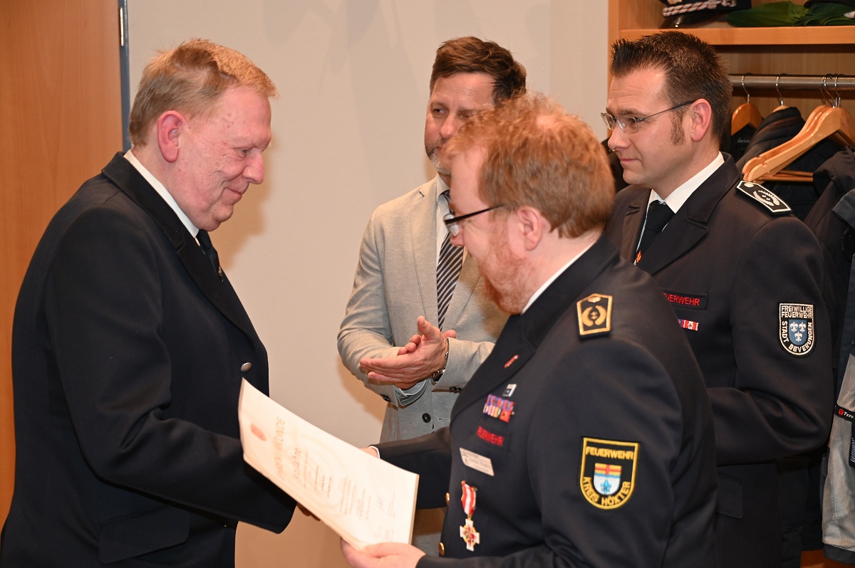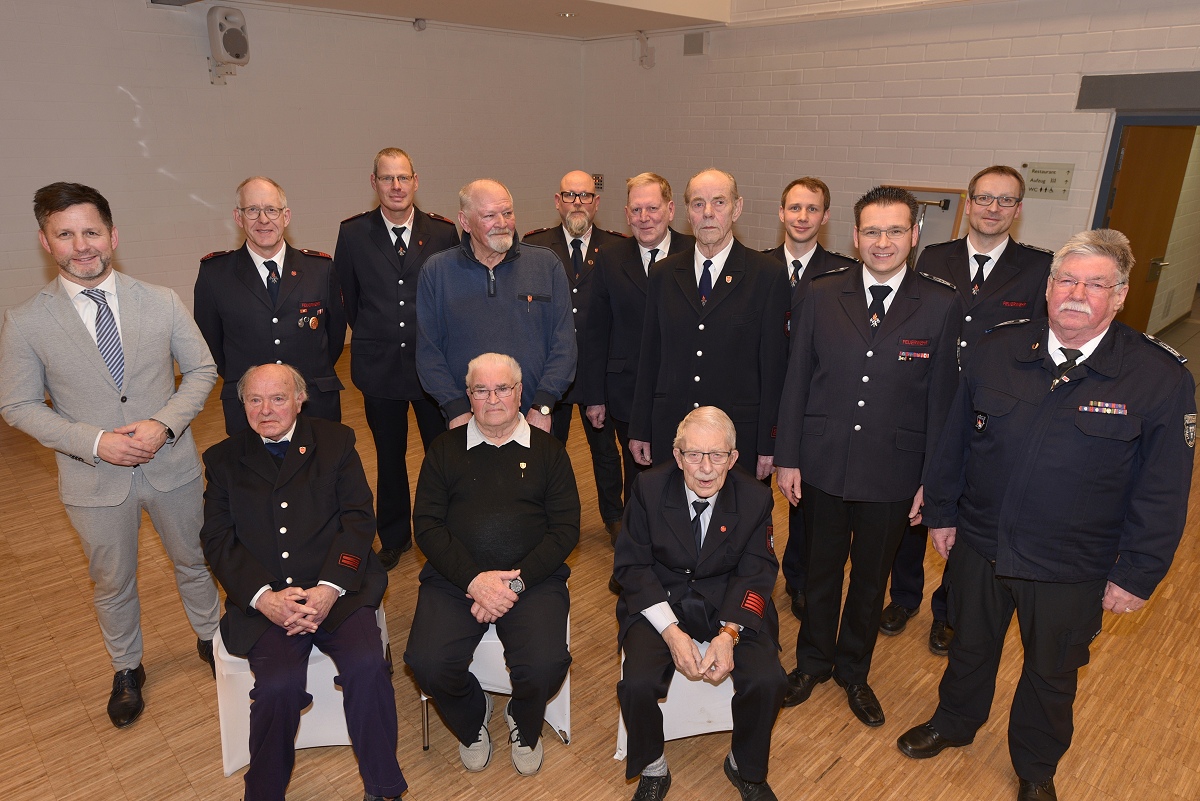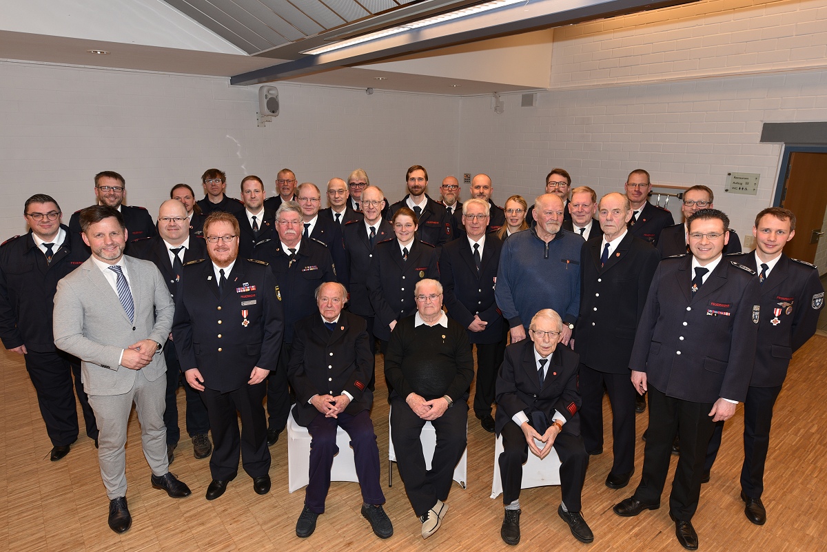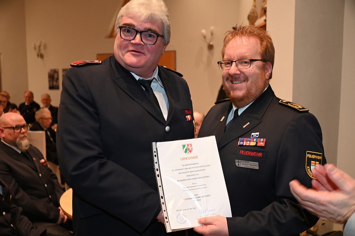 Das Feuerwehr-Ehrenzeichen des Landes in Gold für 35 Jahre aktiven Dienst ging an Stephan Sievers, Martin Beine, Klaus Even, Christoph Dierkes, Thomas Kröger, Tobias Dierkes, Markus Dierkes, Daniel Ernst, Kreisbrandmeister Stefan Nostiz, Andreas Nostitz und Ulrich Kieneke. Darüber hinaus wurden zahlreiche Sonderabzeichen des Verbandes der Feuerwehren NRW verliehen. Das Sonderabzeichen für 40 Jahre Feuerwehrmitgliedschaft in Silber erhielten Matthias Berg, Marc Schrick, Stefan Dewender, Arnold Dunschen und Franz Lavarino. Das Sonderabzeichen in Gold für 50 Jahre Mitgliedschaft verlieh Kreisbrandmeister Nostiz an Rudolf Berg, Günter Konzek, Ludwig Kuhn und Manfred Schade sowie für 60- bzw. 70-jährige Mitgliedschaft an Hans Lorenz Vössing und Josef Vössing.