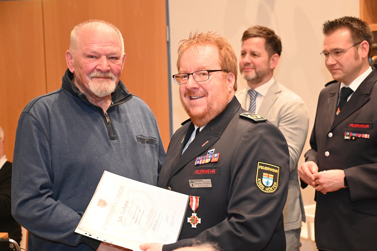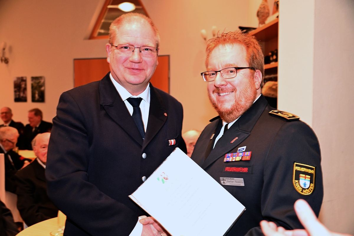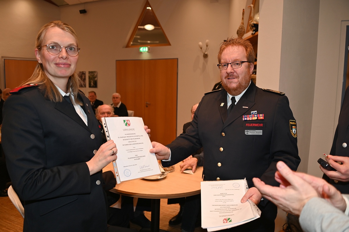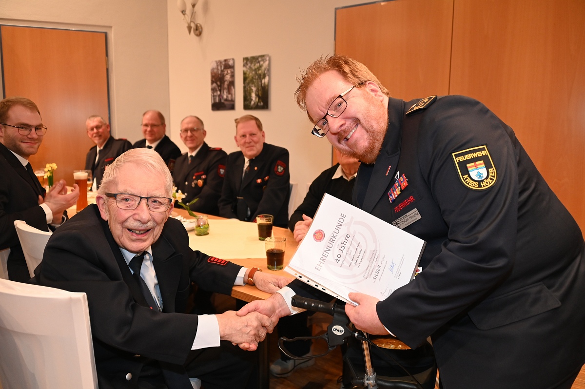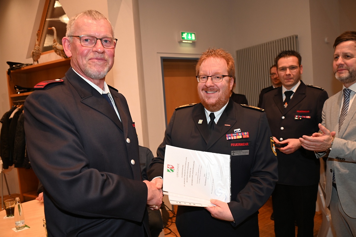 Das Feuerwehr-Ehrenzeichen des Landes in Gold für 35 Jahre aktiven Dienst ging an Stephan Sievers, Martin Beine, Klaus Even, Christoph Dierkes, Thomas Kröger, Tobias Dierkes, Markus Dierkes, Daniel Ernst, Kreisbrandmeister Stefan Nostiz, Andreas Nostitz und Ulrich Kieneke. Darüber hinaus wurden zahlreiche Sonderabzeichen des Verbandes der Feuerwehren NRW verliehen. Das Sonderabzeichen für 40 Jahre Feuerwehrmitgliedschaft in Silber erhielten Matthias Berg, Marc Schrick, Stefan Dewender, Arnold Dunschen und Franz Lavarino. Das Sonderabzeichen in Gold für 50 Jahre Mitgliedschaft verlieh Kreisbrandmeister Nostiz an Rudolf Berg, Günter Konzek, Ludwig Kuhn und Manfred Schade sowie für 60- bzw. 70-jährige Mitgliedschaft an Hans Lorenz Vössing und Josef Vössing.