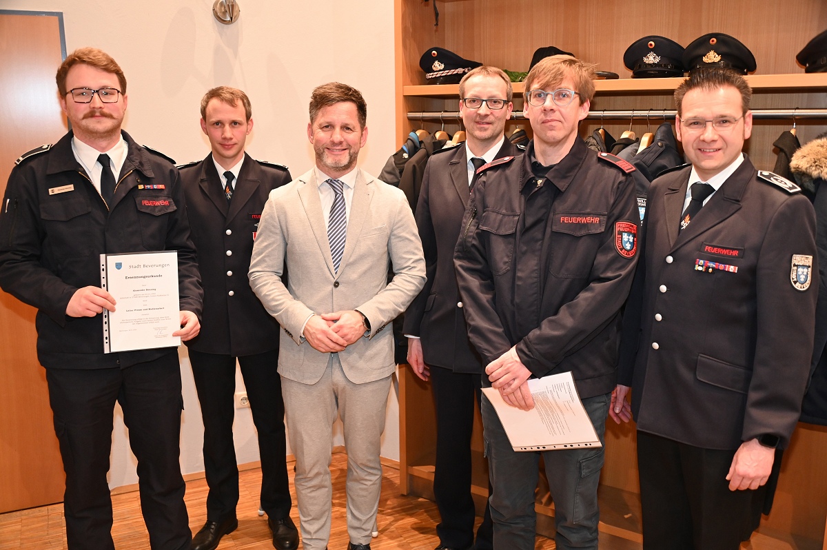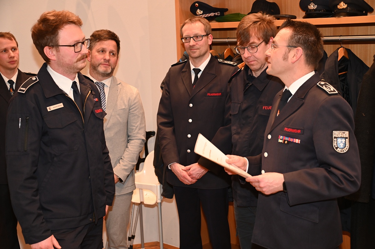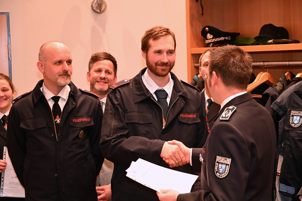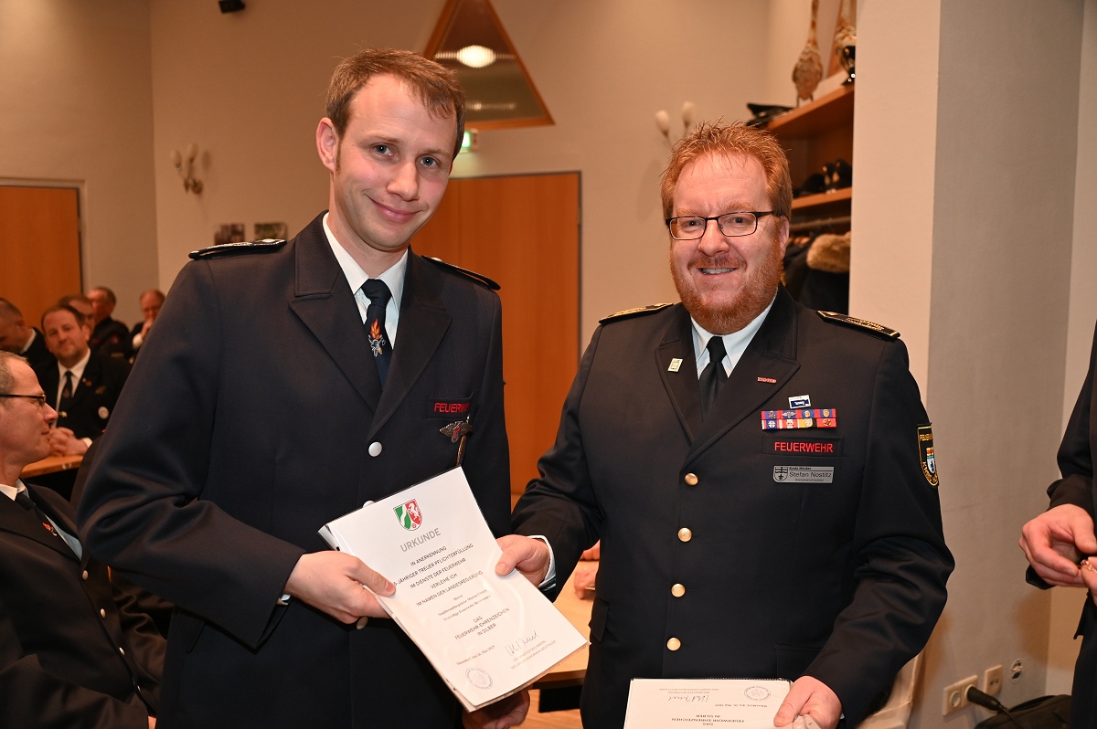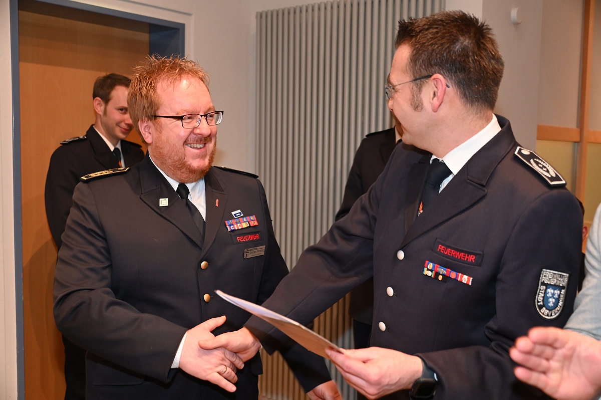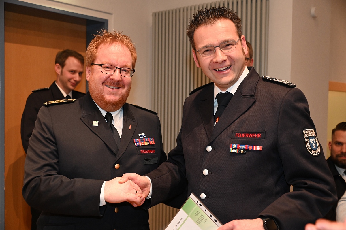 Zum Abschluss nahm Sebastian Ewen weitere Personalangelegenheiten vor. Lukas Peters wurde auf Wunsch als Stadtkinderfeuerwehrwart entlassen. Zudem wurde Marco Behler als Beauftragter für den Digitalfunk ernannt, und Alexander Bönning erhielt die Urkunde zur Bestellung als Pressesprecher der Feuerwehr überreicht.