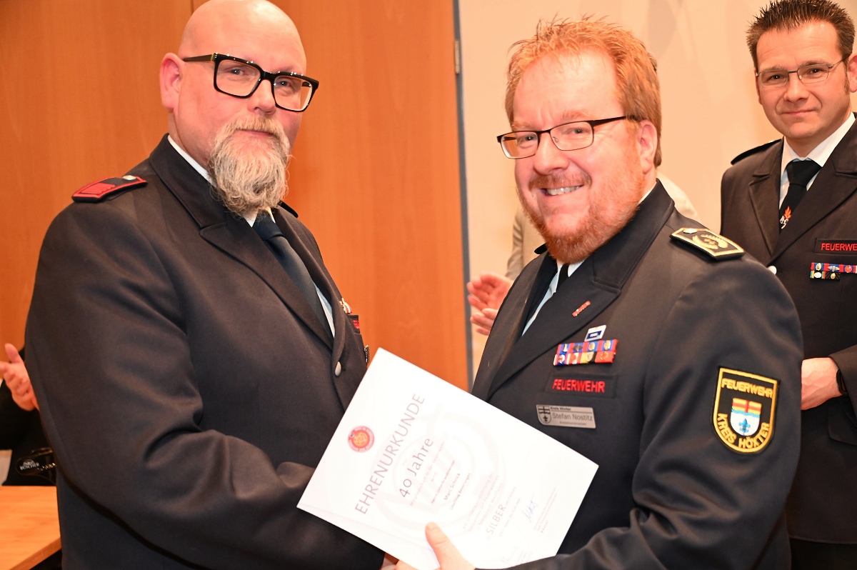 Ehrungen für zusammen 1065 Jahre ehrenamtlichen Dienst: Höhepunkt der Versammlung waren die Ehrungen verdienter Feuerwehrkameradinnen und -kameraden. Für 25 Jahre aktiven Dienst erhielten Marcel Becker, Andreas Naskrent, Uwe Siebeneicher, Rudolf Dewenter, Annette Knipping und der stellvertretende Leiter der Feuerwehr, Marius Ulrich, das Feuerwehr-Ehrenzeichen des Landes in Silber.