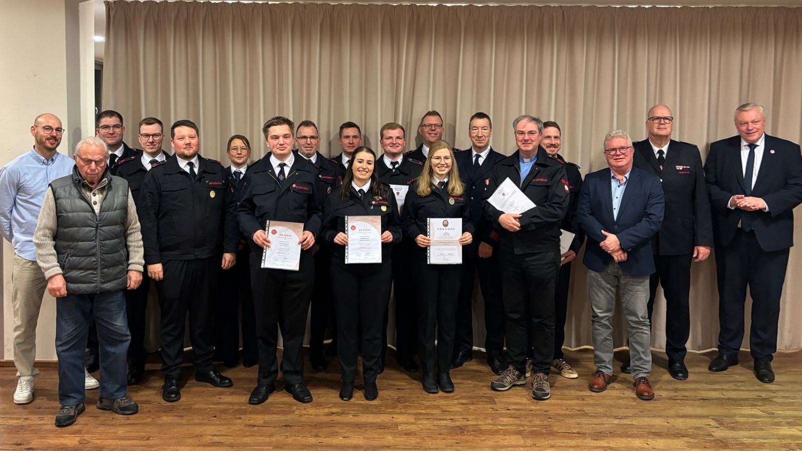 Auch langjähriges Engagement wurde gewürdigt: Das Feuerwehr-Ehrenzeichen des Landes Nordrhein-Westfalen in Gold für 35 Jahre aktiven Feuerwehrdienst wurde von Bürgermeister Daniel Hartmann und Ordnungsamtsleiter Marcus Winkler an den Hauptfeuerwehrmann Jürgen Drenker verliehen. Für zehn Jahre aktiven Feuerwehrdienst erhielt Unterbrandmeisterin Michelle Warschun und Oberfeuerwehrmann Bennet Schoppmeier die Ehrennadel des Verbandes der Feuerwehren. Folgende Leistungsabzeichen wurden verliehen: Sebastian Ritter in Gold auf rotem Grund, Kevin Redecker in Gold sowie Theresa Vieth und Katharina Sternberg in Bronze.