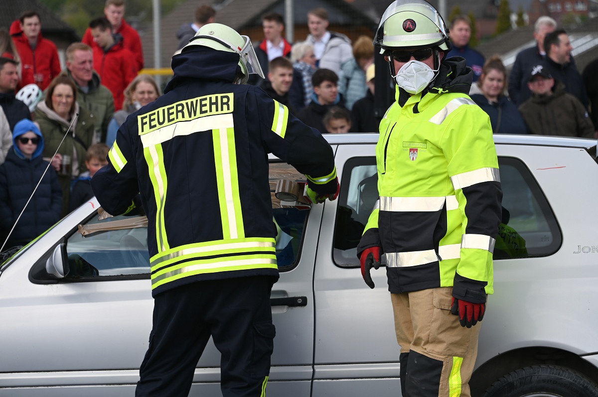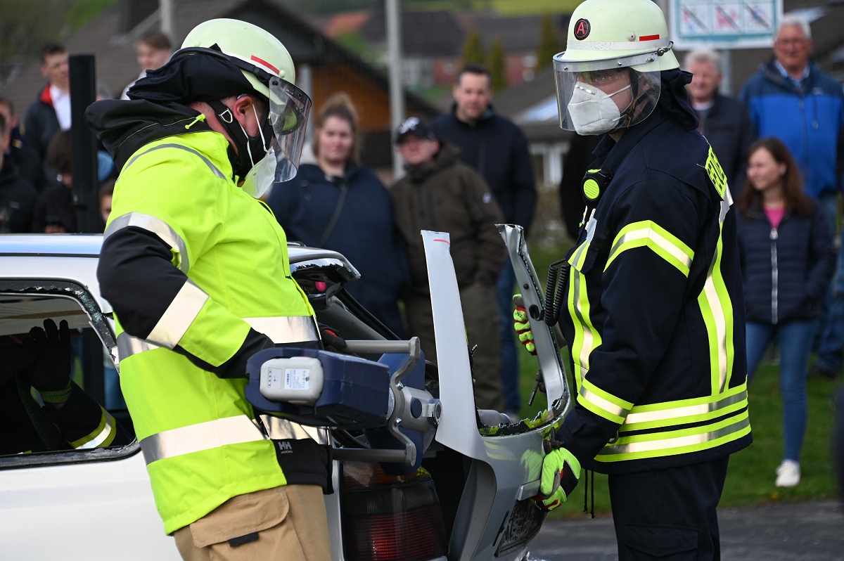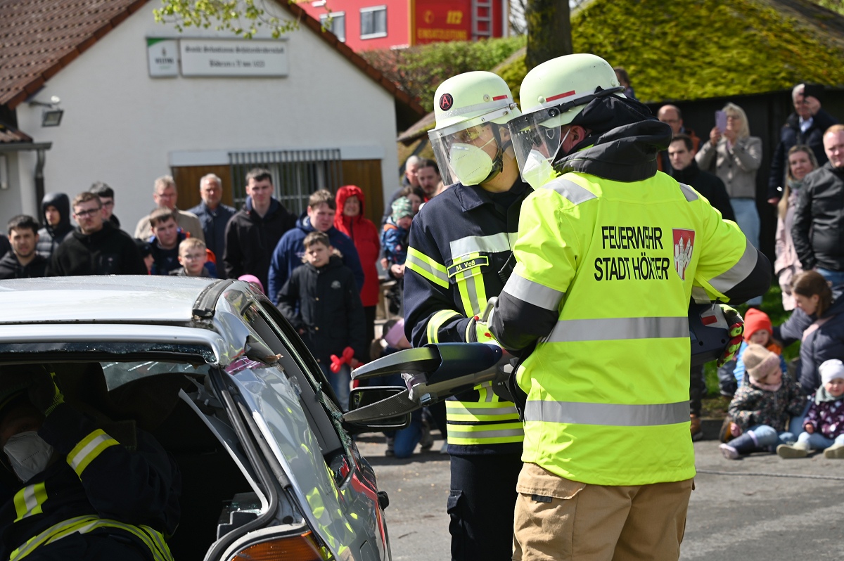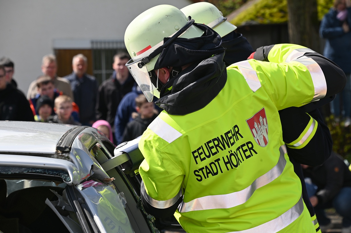 Großes Interesse zog zudem eine realitätsnahe Einsatzübung auf dem Schützenplatz auf sich. Die Löschgruppe Fürstenau zeigte gemeinsam mit dem Löschzug Höxter, wie die Feuerwehr bei einem Verkehrsunfall mit eingeklemmter Person vorgeht. Vor den Augen von dutzenden Zuschauern wurde ein ausgemusterter Pkw fachgerecht zerlegt, um eine schonende Rettung des „Verletzten“ zu ermöglichen. Dabei musste unter anderem das Fahrzeugdach entfernt werden, um die verunfallte Person aus dem Fahrzeug zu befreien. Auch personell gab es einen wichtigen Moment: Der stellvertretende Leiter der Feuerwehr Höxter, Rainer Höppner, nahm die Ernennung zweier Führungskräfte vor. Die Brüder Benedikt und Philipp Meise wurden für weitere sechs Jahre in ihren Funktionen als Löschgruppenführer bestätigt. Benedikt Meise bleibt Löschgruppenführer, während Philipp Meise weiterhin als sein Stellvertreter fungiert.
