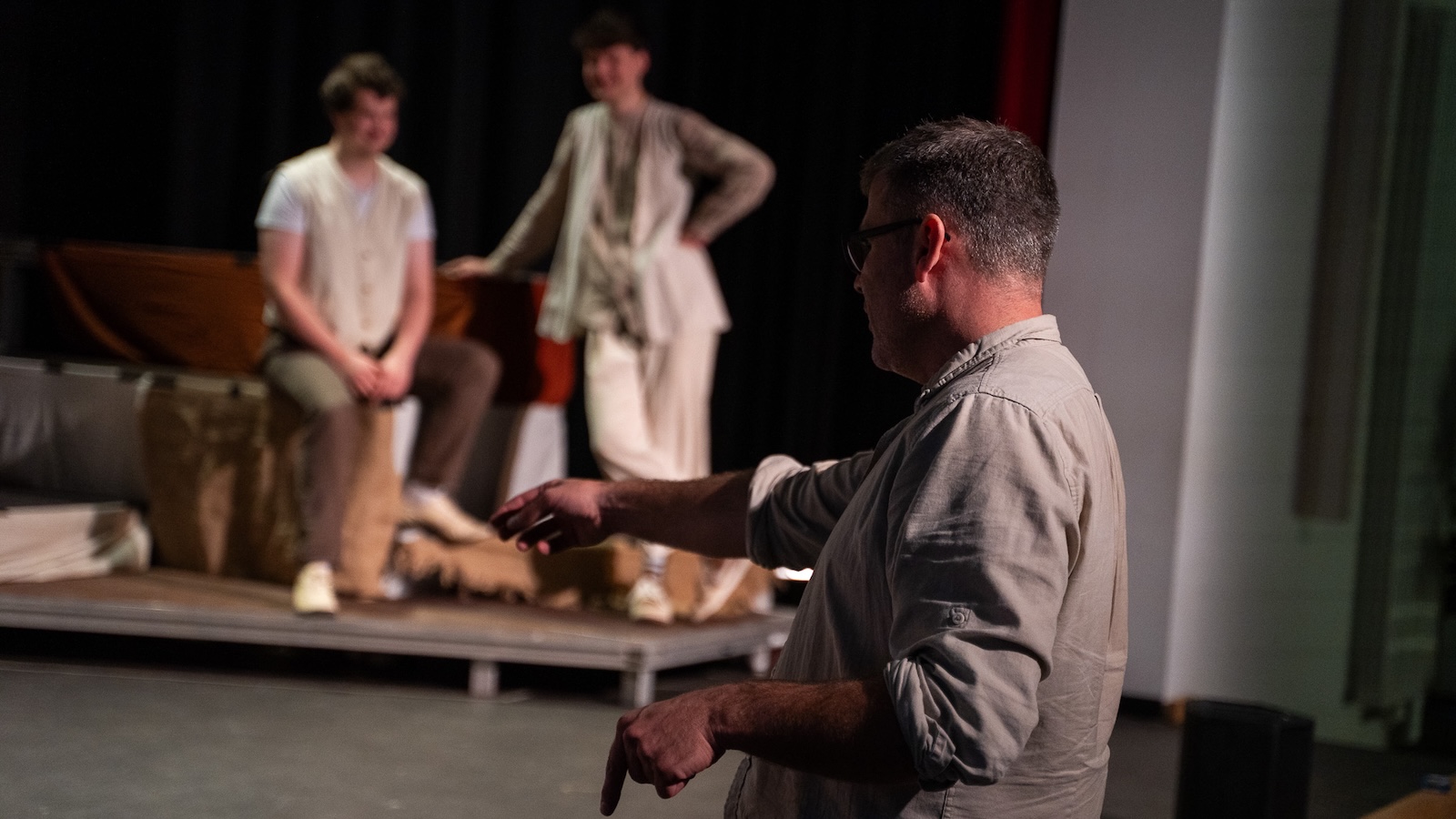 Die 18 Darstellenden haben die meisten Szenen bereits gestellt, aktuell wird am Feinschliff gearbeitet. Das Ensemble nutzt die besondere Atmosphäre der Aula der Gesamtschule Brakel, um das Spiel neu zu denken. Das intime Umfeld verlangt eine andere Konzentration, da jede Bewegung, jede Pause unmittelbarer wirkt. Denn das Publikum sitzt nah dran und erlebt die Figuren intensiver.