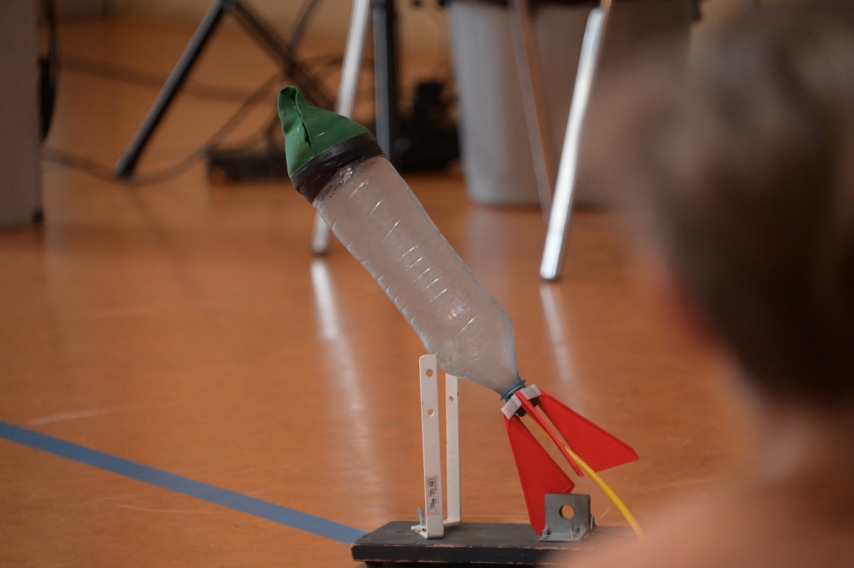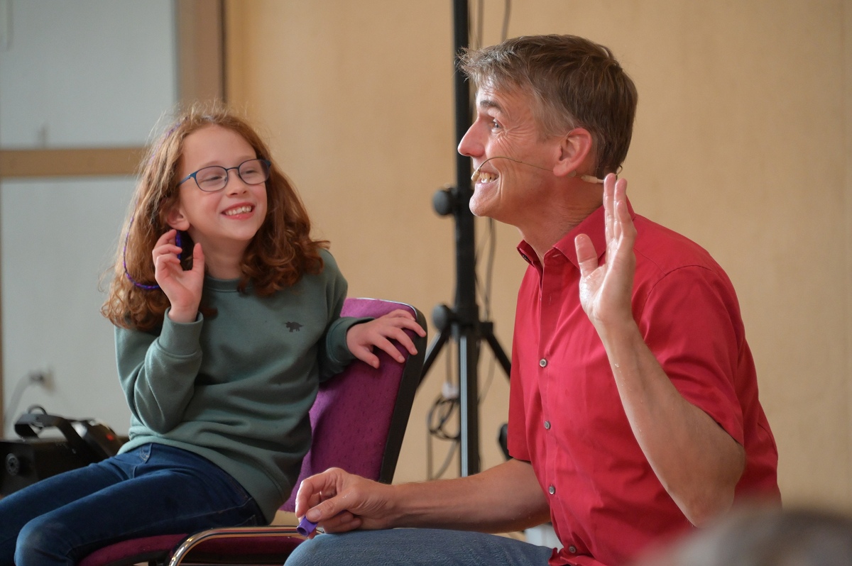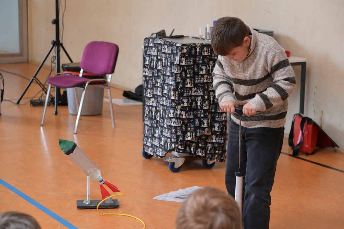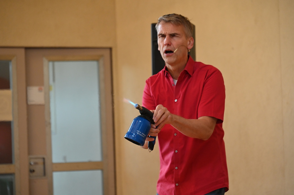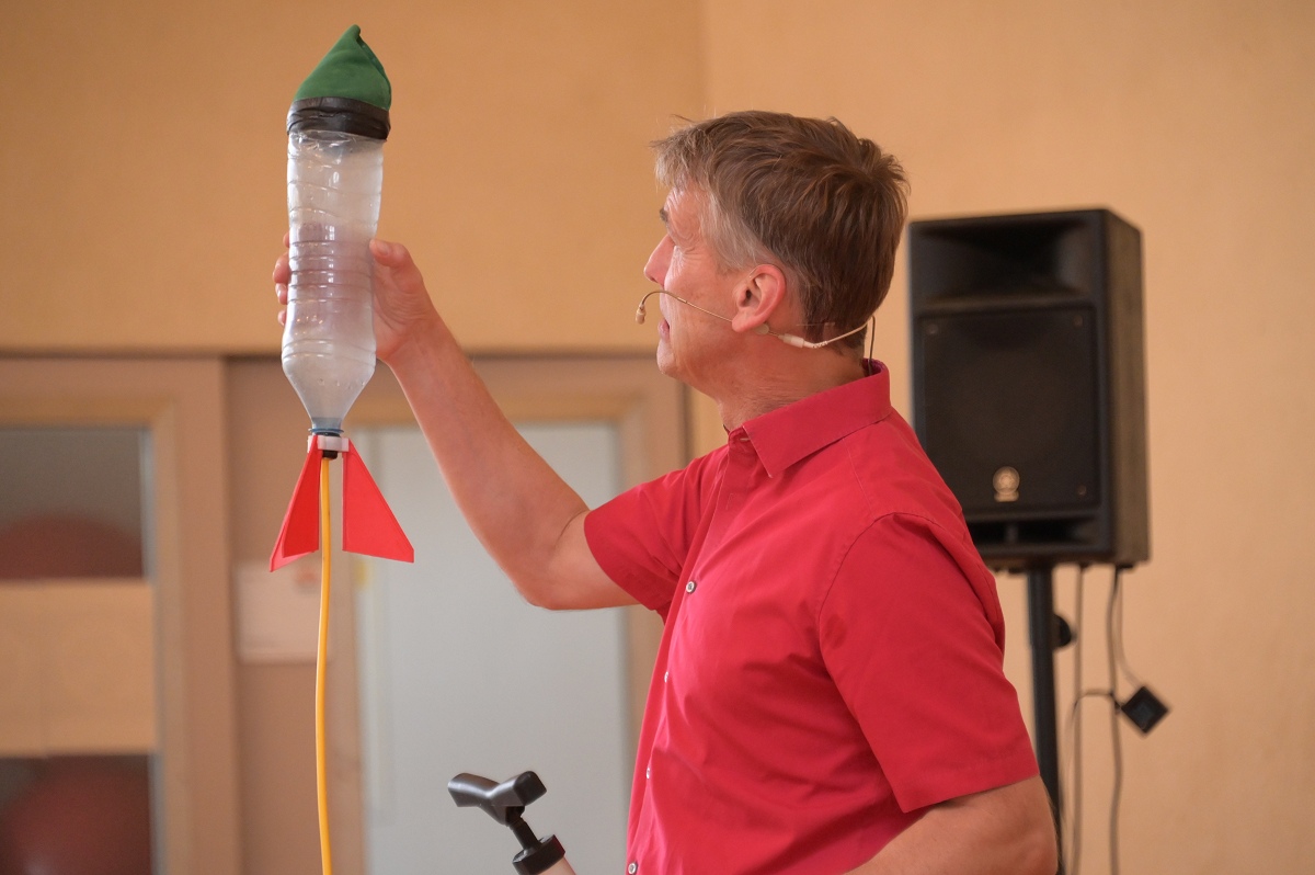 Im Mittelpunkt der Show standen die vier Elemente Feuer, Wasser, Luft und Erde. Wissenschaftsjournalist Dr. Sascha Ott, bekannt aus dem WDR-Format „Küchenexperimente“, präsentierte die physikalischen Phänomene kindgerecht, humorvoll und immer auf dem soliden Grund wissenschaftlicher Fakten. So wurde ein kleines Teelicht plötzlich zu einem spektakulären Feuerball. Fünf Liter Wasser verwandelten sich in eine Schwalldusche, die für viel Staunen und Gelächter sorgte. Doch nicht nur beeindruckende Experimente standen im Fokus. Die Kinder erfuhren spielerisch, wie Raketen fliegen, warum ein Feuer brennt oder wie man im Alltag Energie sparen kann. Besonders wichtig dabei: Alle durften mitdenken, miträtseln und mitexperimentieren. Genau dieses aktive Erleben macht die Wissensshows der Physikanten zu nachhaltigen Lernerlebnissen.