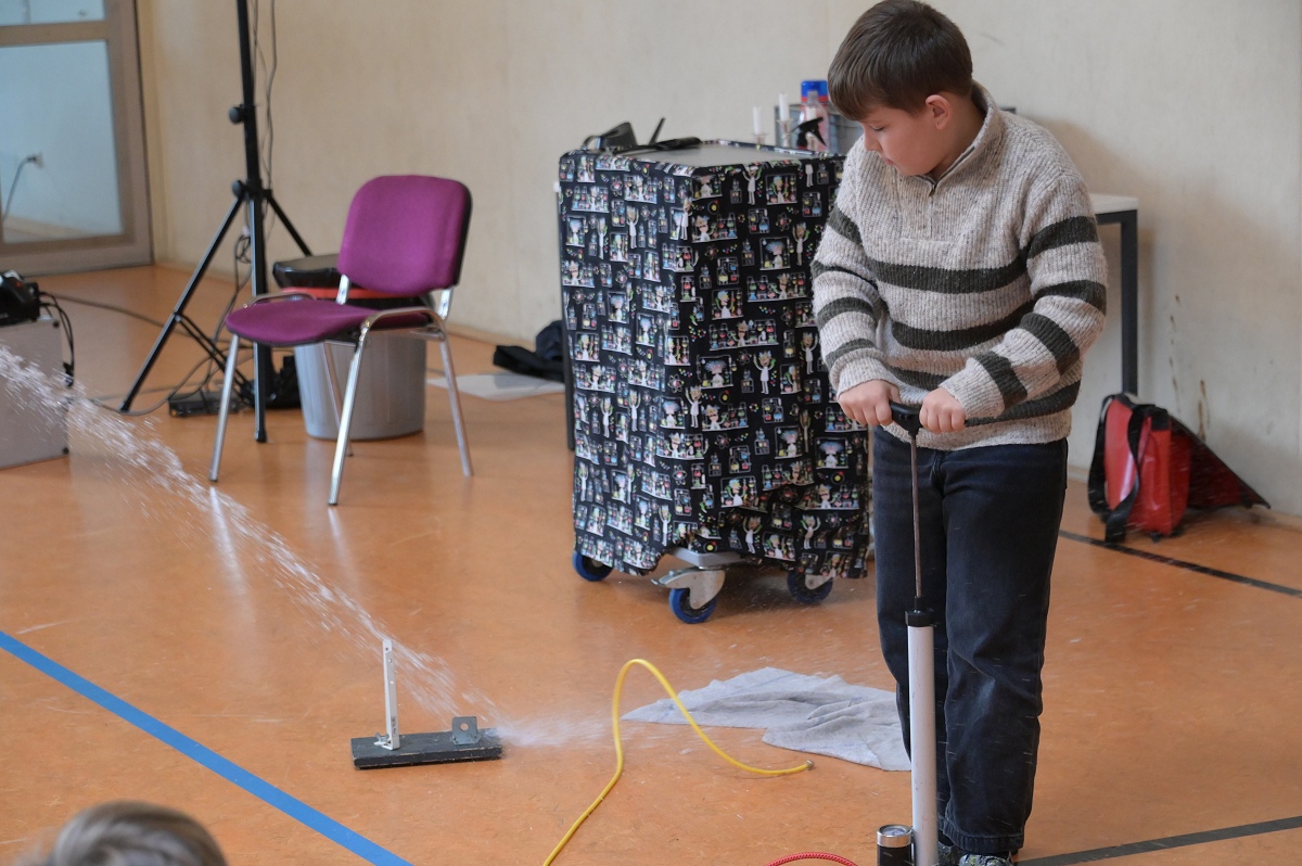 Lüchtringen (TKu). Mit einem Feuerball, spritzenden Wassermengen und Wirbelringen, die quer durch die Turnhalle schossen, endete am Donnerstagmorgen die letzte Unterrichtsstunde für die Schülerinnen und Schüler der Grundschule Lüchtringen auf besonders spannende Weise. Zu Gast waren „Die Physikanten“, ein mehrfach ausgezeichnetes Team aus Naturwissenschaftlern und Künstlern, das seit Jahren Kinder wie Erwachsene mit spektakulären Experimenten begeistert. Der Förderverein der Grundschule Lüchtringen hatte diese besondere Wissensshow organisiert und finanziert. Damit konnten alle Klassen von Jahrgang 1 bis 4 teilnehmen, und das nicht nur zuschauen, sondern auch aktiv mitmachen.