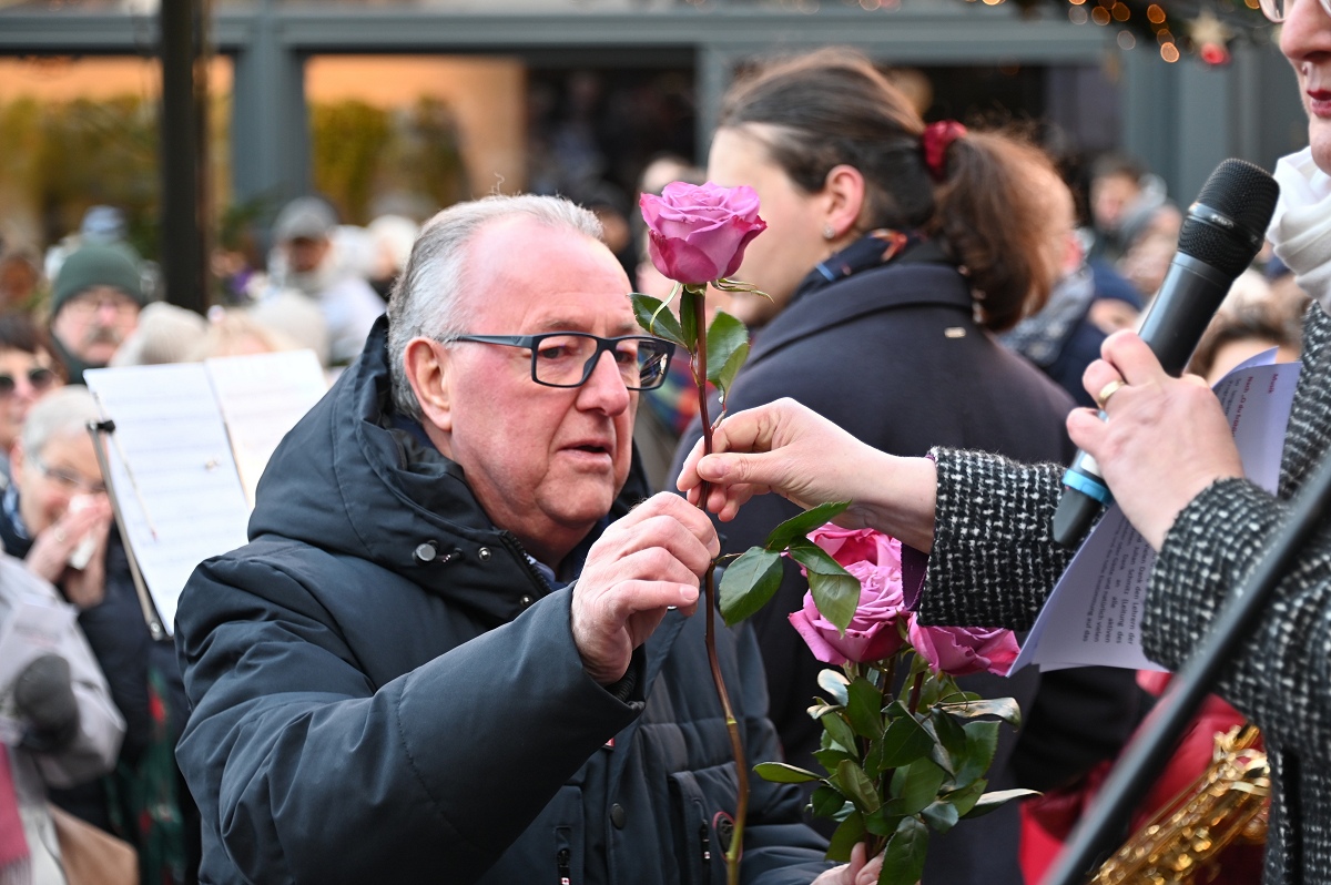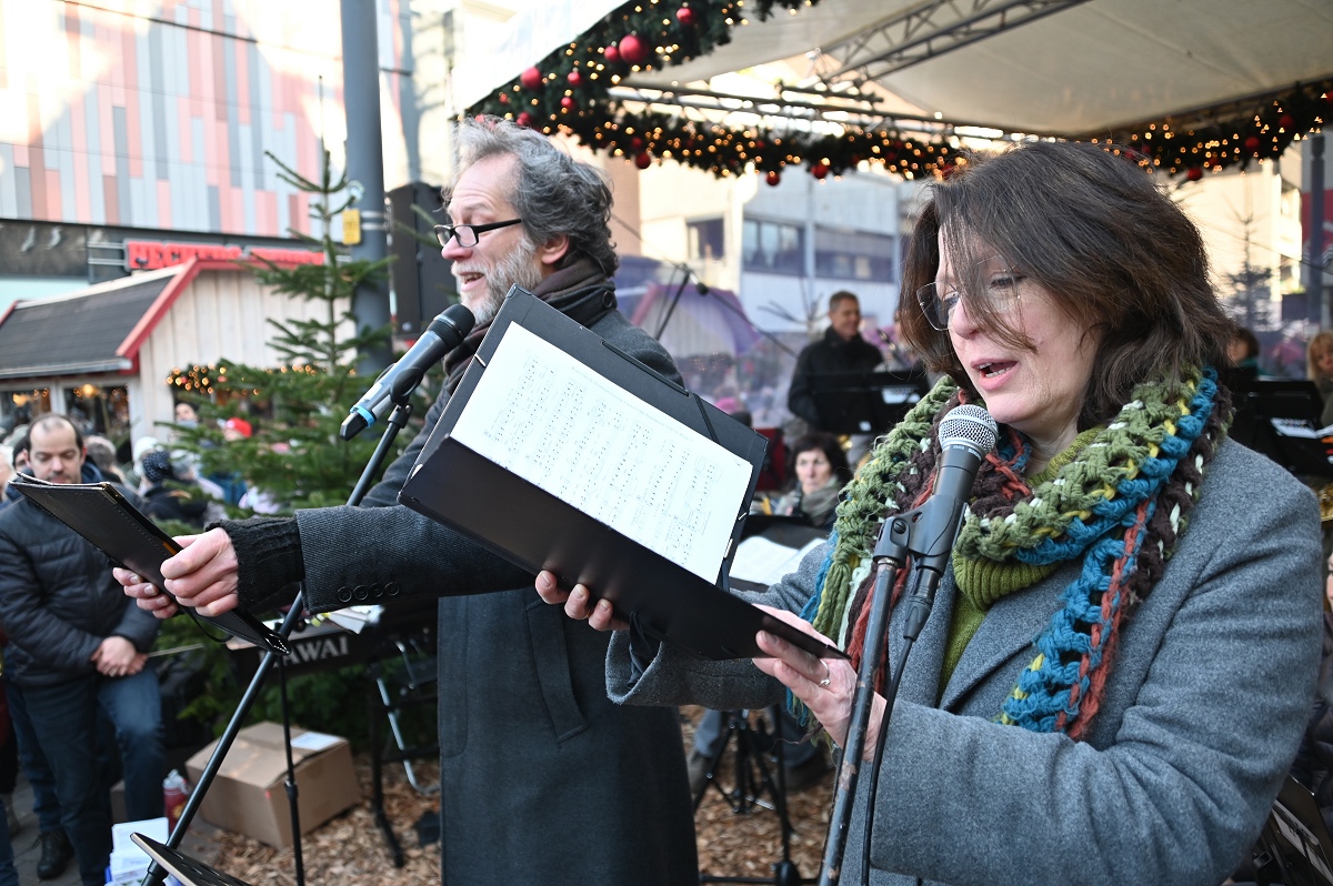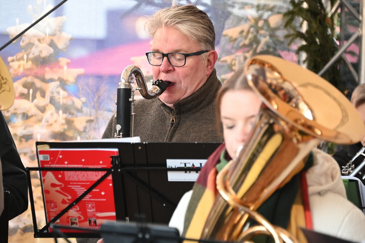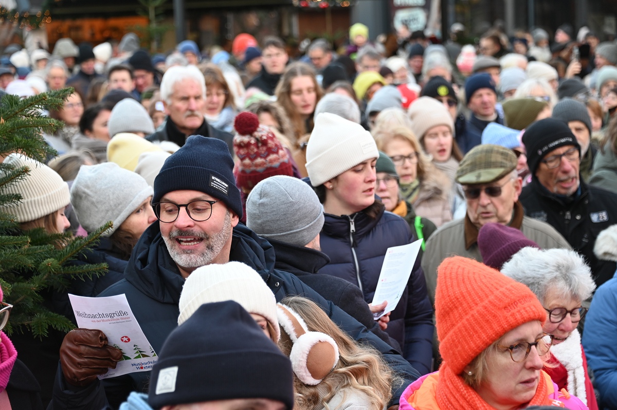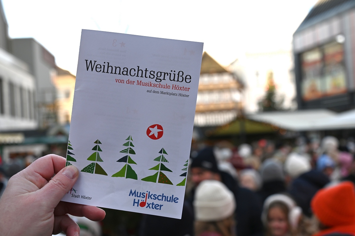 Musikschulleiterin Klaudia Knapp blickte in einer kurzen Ansprache zurück und erinnerte an die Anfänge der Musikschule, die vor wenigen Wochen 65 Jahre alt geworden ist. Ende November 1960 wurde das Jugendmusikwerk laut Claudia Knapp gegründet, der Vorläufer der heutigen Musikschule. Unterstützt wurde das Weihnachtssingen zudem von den Turmbläsern Stefan Balke vom Weserberglandorchester Bödexen und Jonathan Mann von den Hochstiftmusikanten, die vom Balkon über Thalia aus einzelne Musikstücke anstimmten und so für eine besondere Klangatmosphäre sorgten. Bürgermeister Daniel Hartmann wünschte allen Menschen „frohe Festtage“, dankte den Mitwirkenden für ihr Engagement. Er hob den starken Gemeinschaftssinn in Höxter hervor und betonte die Bedeutung des letzten Liedes „Stille Nacht, heilige Nacht“ als Zeichen von Frieden, Hoffnung und Zusammenhalt, ein Lied, das wie kaum ein anderes für Frieden in der Welt steht.