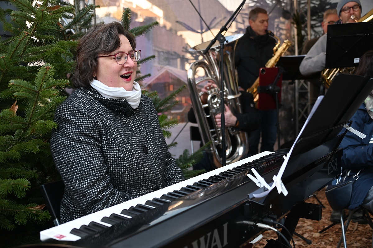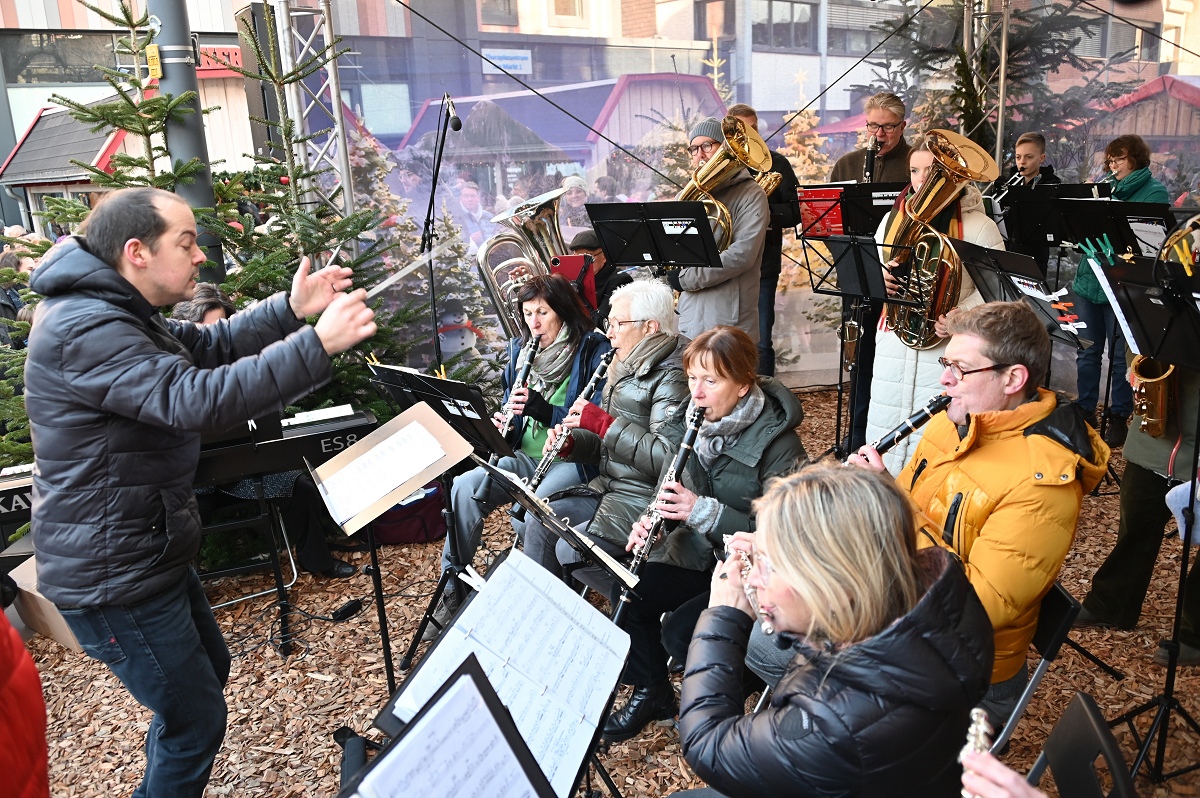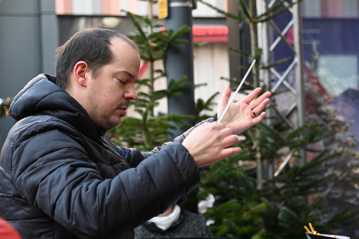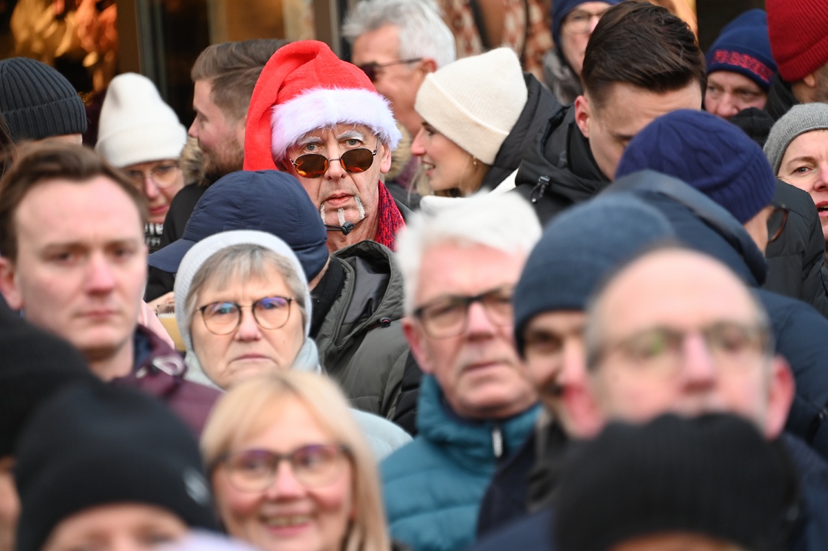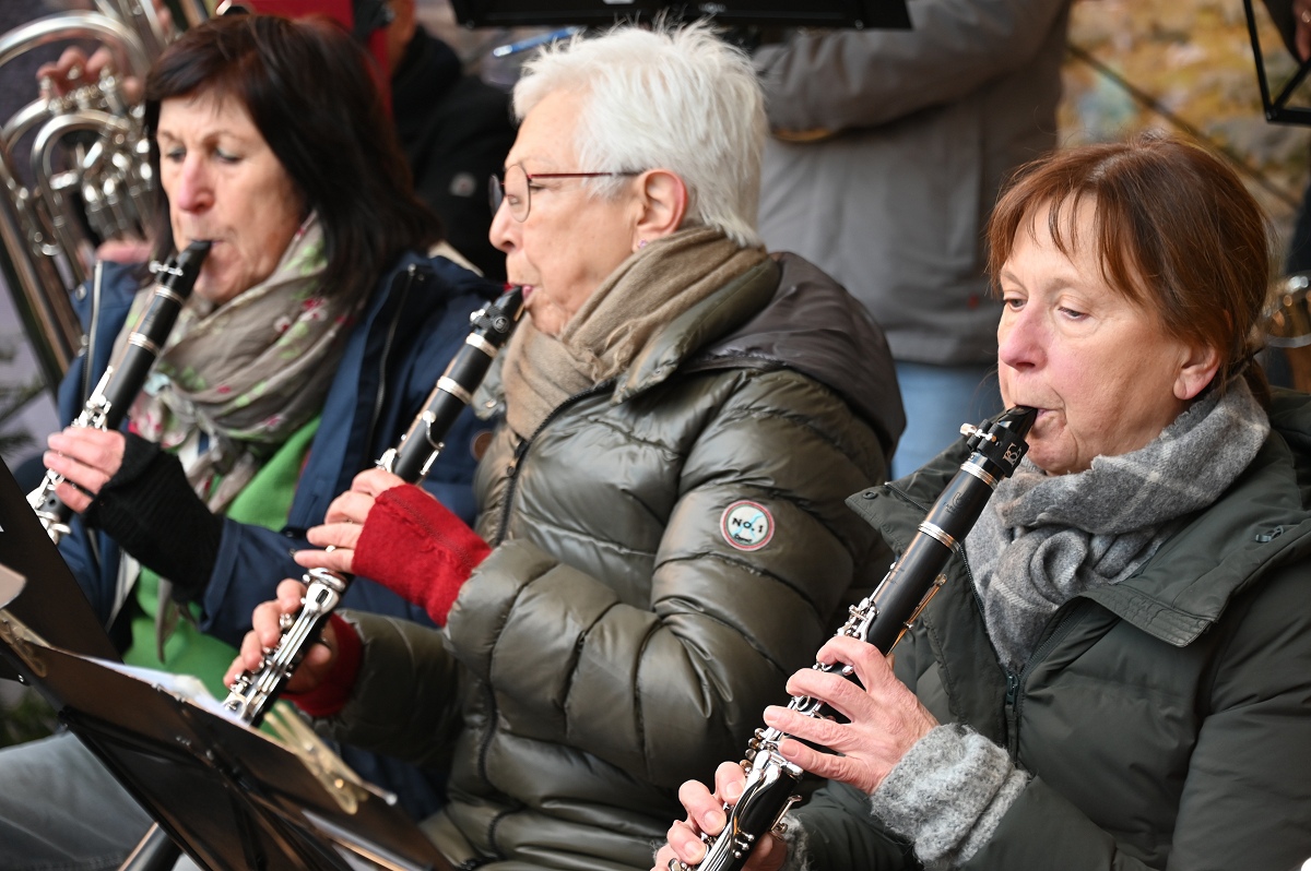 Musikschulleiterin Klaudia Knapp blickte in einer kurzen Ansprache zurück und erinnerte an die Anfänge der Musikschule, die vor wenigen Wochen 65 Jahre alt geworden ist. Ende November 1960 wurde das Jugendmusikwerk laut Claudia Knapp gegründet, der Vorläufer der heutigen Musikschule. Unterstützt wurde das Weihnachtssingen zudem von den Turmbläsern Stefan Balke vom Weserberglandorchester Bödexen und Jonathan Mann von den Hochstiftmusikanten, die vom Balkon über Thalia aus einzelne Musikstücke anstimmten und so für eine besondere Klangatmosphäre sorgten. Bürgermeister Daniel Hartmann wünschte allen Menschen „frohe Festtage“, dankte den Mitwirkenden für ihr Engagement. Er hob den starken Gemeinschaftssinn in Höxter hervor und betonte die Bedeutung des letzten Liedes „Stille Nacht, heilige Nacht“ als Zeichen von Frieden, Hoffnung und Zusammenhalt, ein Lied, das wie kaum ein anderes für Frieden in der Welt steht.