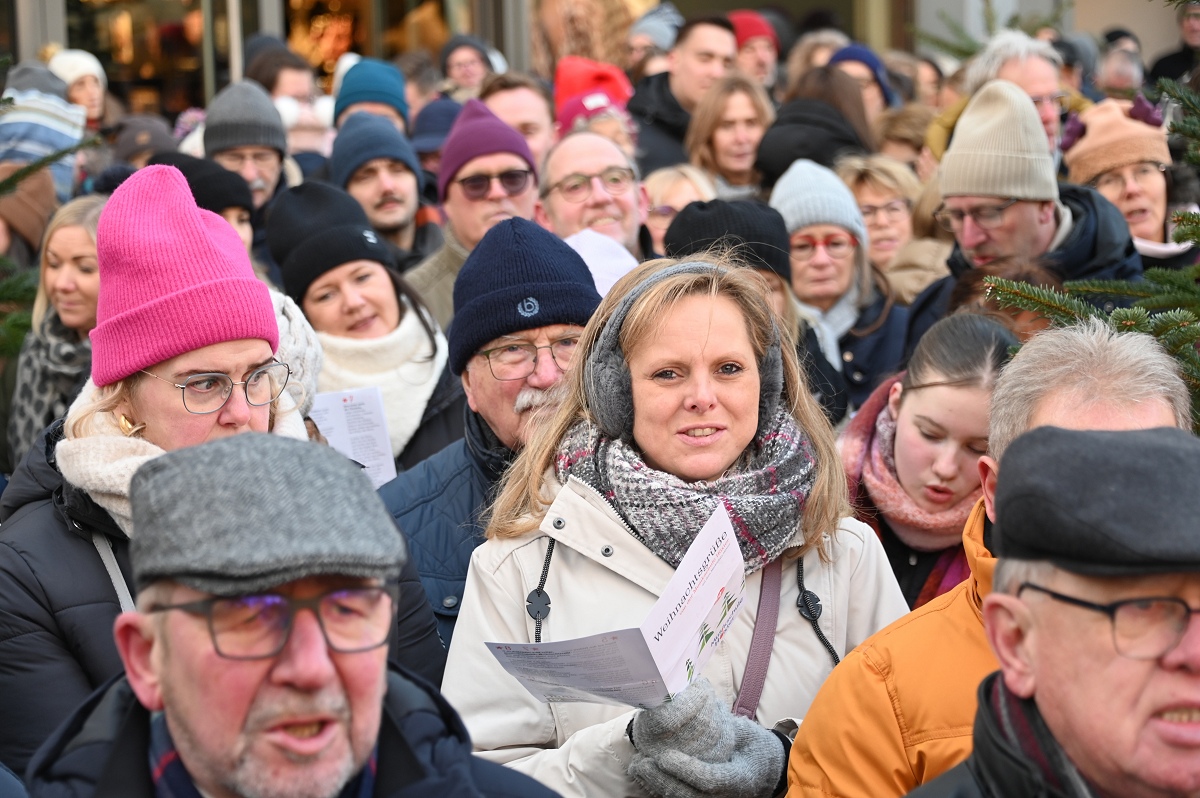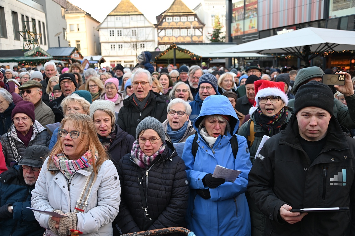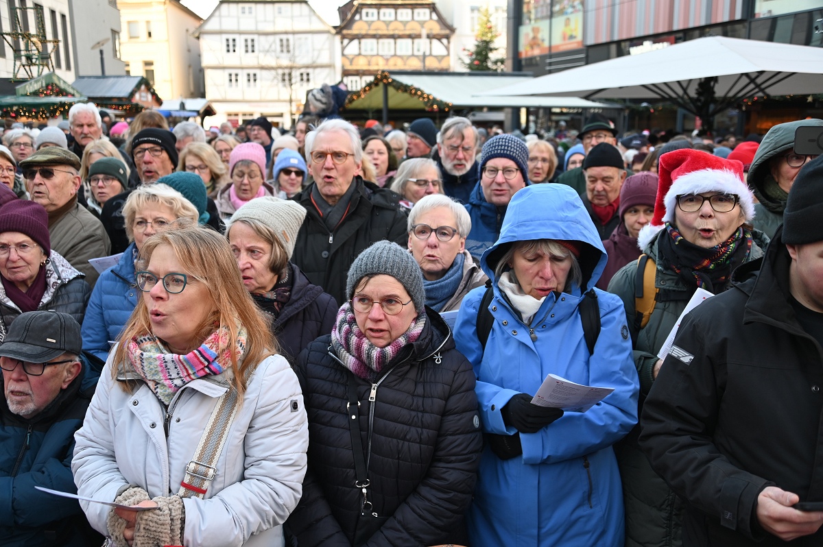 Höxter (TKu). Höxter hält zusammen und wünscht sich gegenseitig frohe Weihnachten: Höxters „gute Stube“ zeigte sich am Heiligabend von ihrer schönsten Seite: Kalt, aber sonnig und prall gefüllt mit Menschen. Mehr als 500 Bürgerinnen und Bürger versammelten sich auf dem Marktplatz von Höxter, um gemeinsam mit der Musikschule Höxter Weihnachtslieder zu singen, um damit das Weihnachtsfest einzuläuten. Von „Kling Glöckchen, klingelingeling“ bis „Leise rieselt der Schnee“ hat Höxter sich selbst wieder in Weihnachtsstimmung versetzt. Die Veranstaltung war auch zugleich der stimmungsvolle Abschluss des diesjährigen Weihnachtsmarktes. Musikalisch begleitet wurden die hunderte Sängerinnen und Sänger von der Musikschule Höxter, die durch ihre Blechbläser auf dem Marktplatz, wie auf einem Balkon ergänzt wurde. Die Kinderherzen höher schlagen ließ Carolin Franke, die das Weihnachtssingen als Solo-Sängerin mit dem Lied „Willst Du einen Schneemann bauen“ aus „Die Eiskönigin“ eröffnet hat. Auch wieder mit von der Partie waren die Solisten Sylvia Wiesemeyer-Koke (Sopran) und Georg Thauern (Bariton).