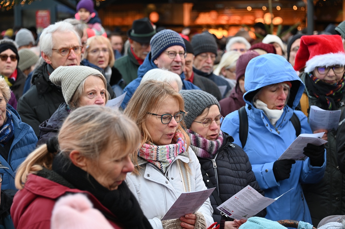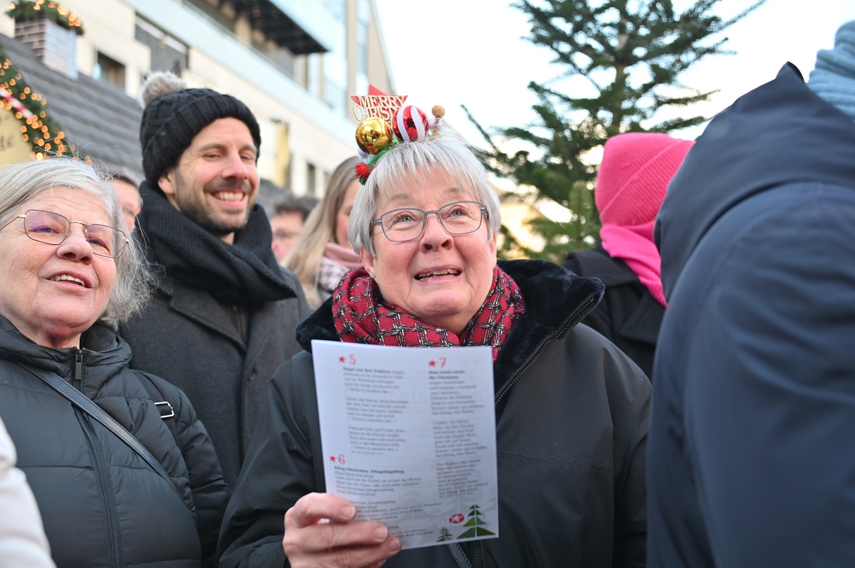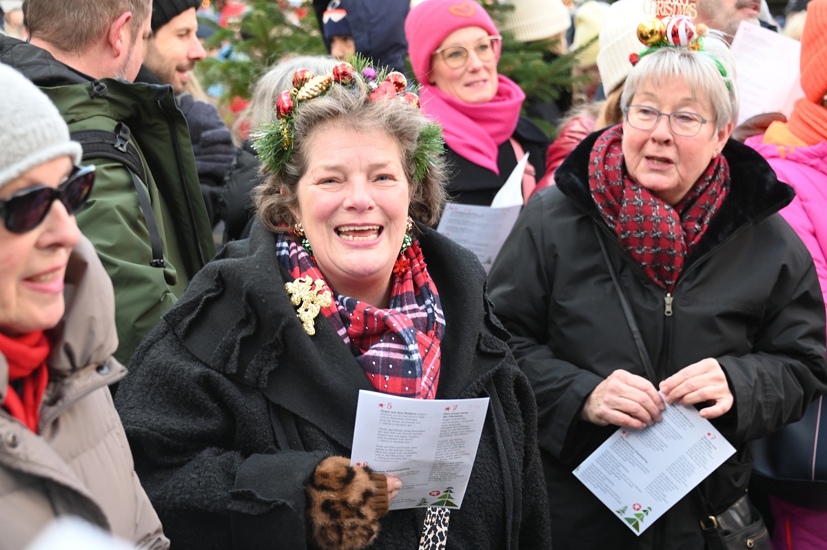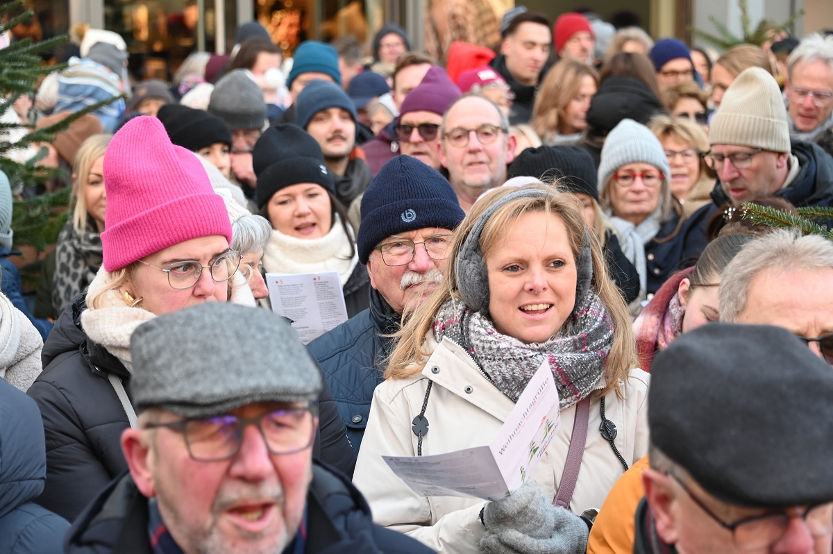 Höxter (TKu). Höxter hält zusammen und wünscht sich gegenseitig frohe Weihnachten: Höxters „gute Stube“ zeigte sich am Heiligabend von ihrer schönsten Seite: Kalt, aber sonnig und prall gefüllt mit Menschen. Mehr als 500 Bürgerinnen und Bürger versammelten sich auf dem Marktplatz von Höxter, um gemeinsam mit der Musikschule Höxter Weihnachtslieder zu singen, um damit das Weihnachtsfest einzuläuten. Von „Kling Glöckchen, klingelingeling“ bis „Leise rieselt der Schnee“ hat Höxter sich selbst wieder in Weihnachtsstimmung versetzt. Die Veranstaltung war auch zugleich der stimmungsvolle Abschluss des diesjährigen Weihnachtsmarktes. Musikalisch begleitet wurden die hunderte Sängerinnen und Sänger von der Musikschule Höxter, die durch ihre Blechbläser auf dem Marktplatz, wie auf einem Balkon ergänzt wurde. Die Kinderherzen höher schlagen ließ Carolin Franke, die das Weihnachtssingen als Solo-Sängerin mit dem Lied „Willst Du einen Schneemann bauen“ aus „Die Eiskönigin“ eröffnet hat. Auch wieder mit von der Partie waren die Solisten Sylvia Wiesemeyer-Koke (Sopran) und Georg Thauern (Bariton).