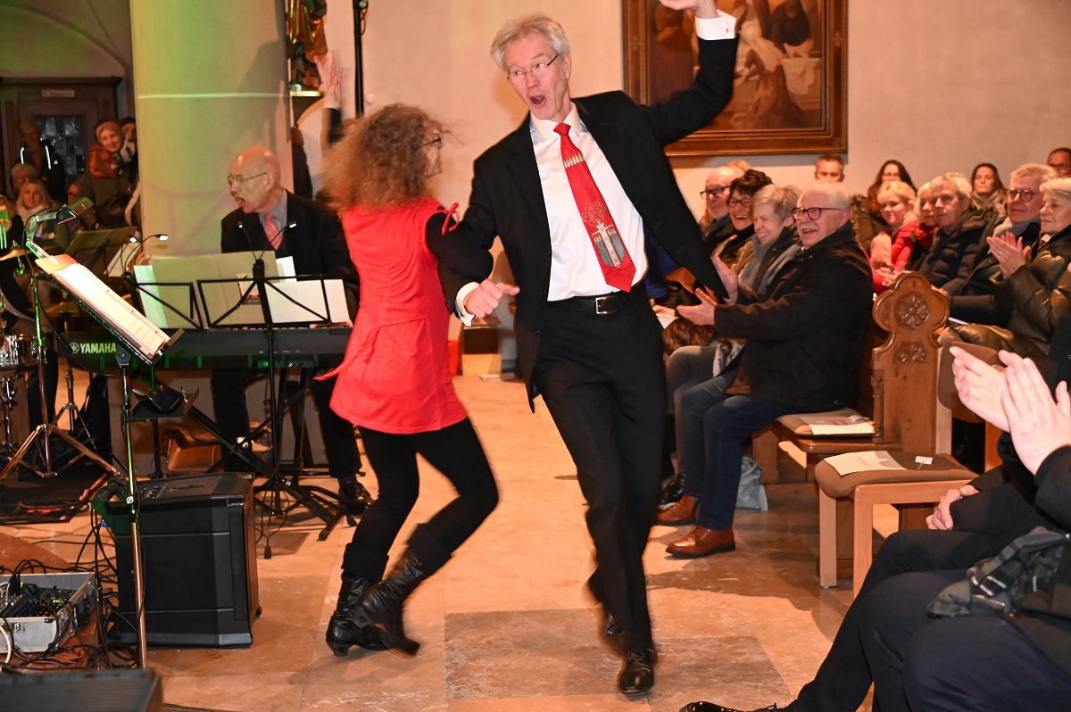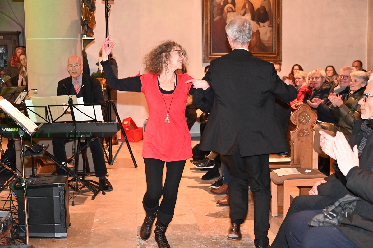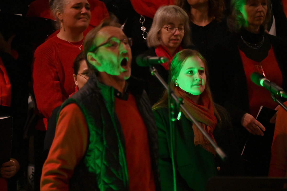 Ein besonderer Höhepunkt des Abends war der tänzerische Auftritt von Anke Schregel, die zum Lied „Lord Of The Dance“ mit ausdrucksstarker Bewegung die Kirche förmlich zum Leben erweckte. Während sie durch die Reihen schritt, wurde sie von den kraftvollen Stimmen des Chors begleitet und sorgte für einen magischen Moment. Für einen weiteren Gänsehautmoment sorgte der 20-jährige Timo Ising. Mit seiner gefühlvollen Interpretation von „Du bist so“ berührte der junge Mann mit Handycap die Herzen der Anwesenden. Seine ausdrucksstarke Stimme und lebhaften Gesten machten diesen Auftritt zu einem emotionalen Höhepunkt des Konzerts und setzten zugleich ein starkes Zeichen für gelebte Inklusion. Musikalisch überzeugten die LIVING VOICES mit einem abwechslungsreichen Repertoire. Neu arrangierte Weihnachtsklassiker wie „Winter Wonderland“, „Santa Claus Is Coming to Town“, „Shepherds Run“ und „Feliz Navidad“ sorgten für vertraute Melodien in frischem Gewand. Passend zum 15-Jährigen erklangen insgesamt auch 15 Titel. Für besondere Klangfarben sorgte erneut die dreiköpfige Band mit dem britischen Keyboarder Peter Moss, Bassist Peter Kros und Percussionist Yukinobu Ishikawa. Die Soloparts wurden von den vereinseigenen Sängerinnen und Sängern Monique Sandmann, Nicole Timmermann, Johanna Potthast, Werner Humann, Heiner Wiemers-Meyer sowie Matthias Kämpfer und Walter Cappell übernommen. Zusätzliche Instrumentalbeiträge, unter anderem von Helena Holletzek an der Blockflöte, rundeten das Klangbild ab. Zum Abschluss des Konzerts erhob sich das Publikum zu stehenden Ovationen und daher gab es auch noch eine Zugabe.