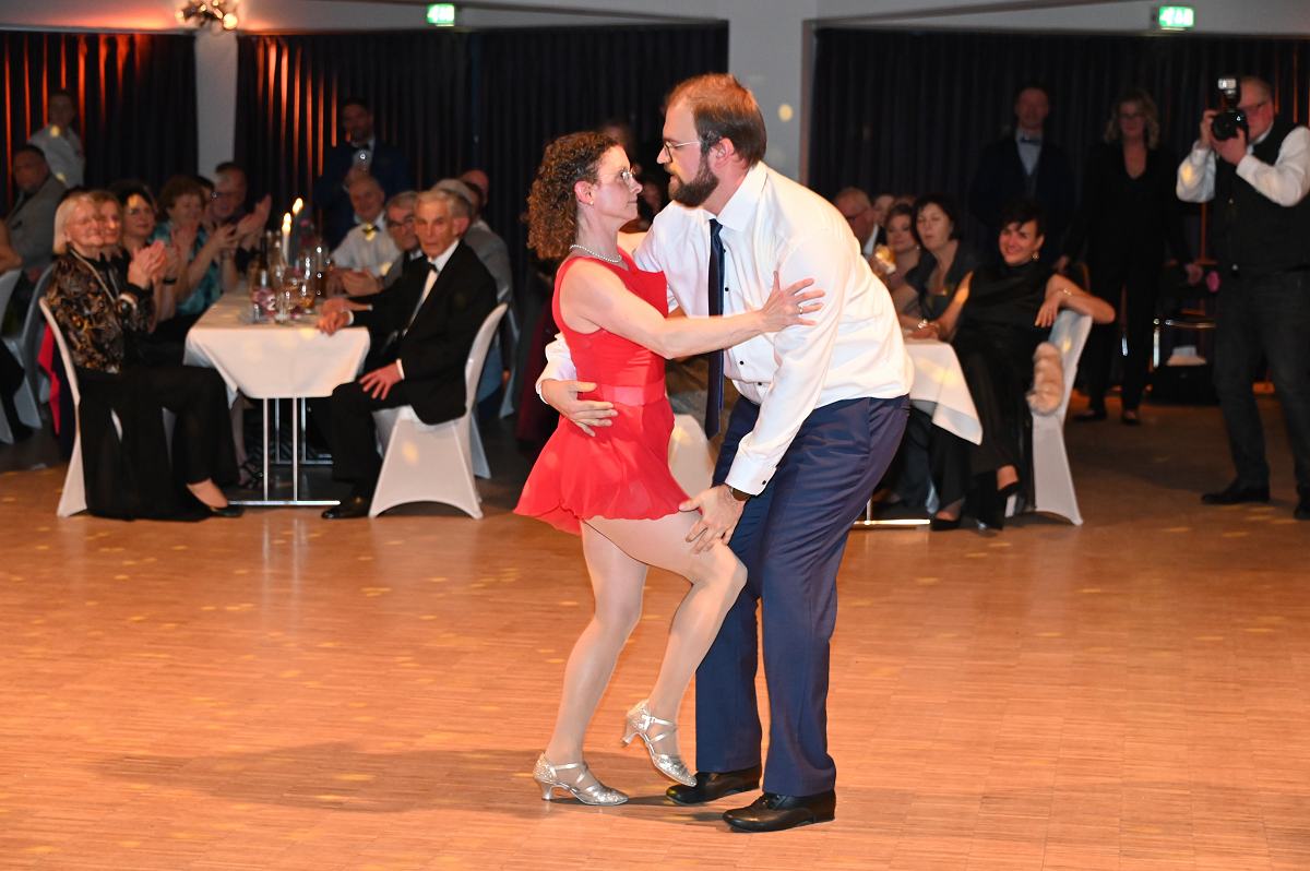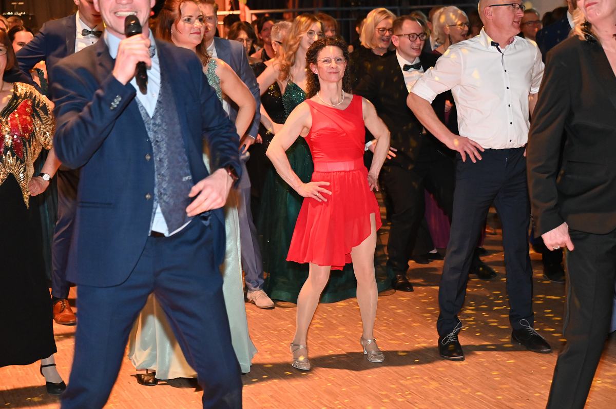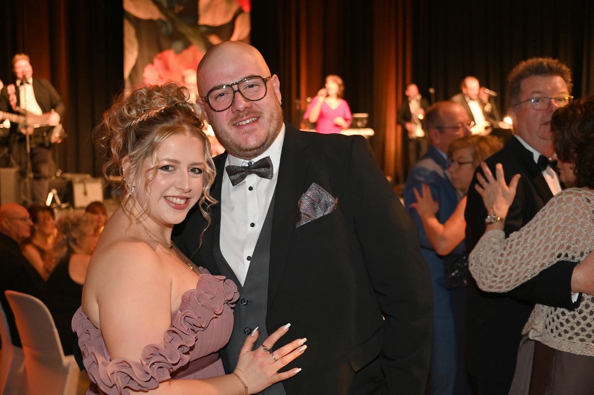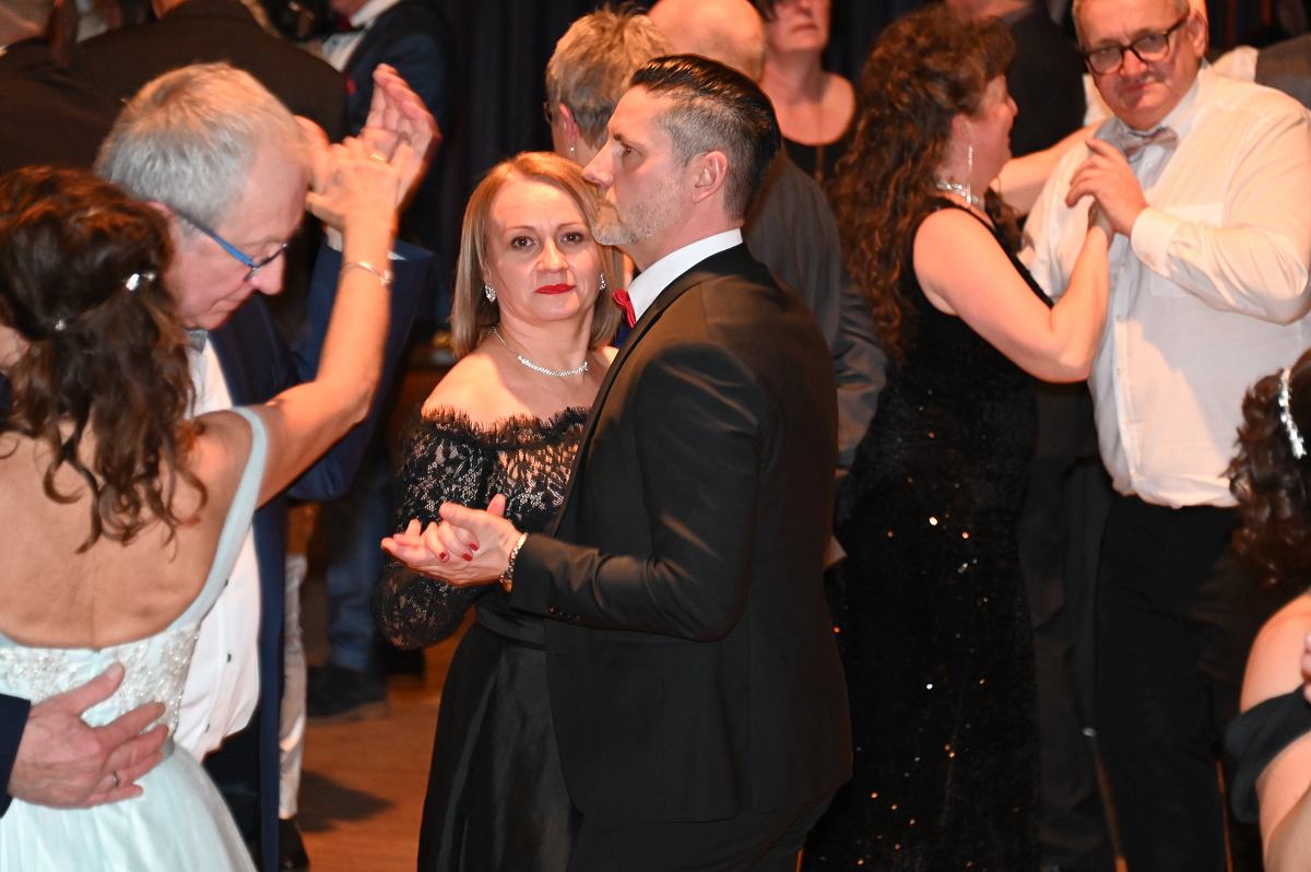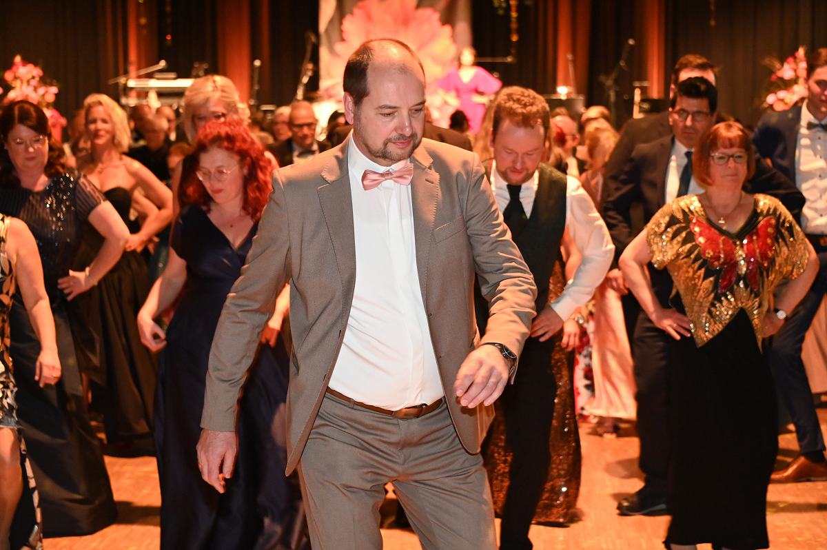 Doch statt Enttäuschung folgte Begeisterung: Ball-Besucher Daniel Hesse von der Tanzschule Hesse aus Heiligenstadt sprang spontan ein und „rettete“ den zweiten Hauptact. Mit einer Line-Dance-Vorführung, Animationen und einem eigenen Tanzpaar brachte Hesse die Stimmung zum Kochen. „Wir haben uns das aus den Fingern gesogen“, sagte er schmunzelnd und traf damit genau den Geschmack des Publikums. Besonders der Auftritt des Tanzpaares Diana und Michael aus Heiligenstadt zum Song „Pretty Woman“ sorgte für großen Applaus. Insgesamt war die Gruppe mit 26 Personen vertreten. Für Daniel Hesse schloss sich dabei ein Kreis: Bereits vor 15 Jahren hatte er in der Stadthalle Beverungen Tanzkurse gegeben. Seine Verbundenheit zum Kulturball sei bis heute geblieben. Für die musikalische Begleitung sorgten Jürgen Becker und seine Amorados Showband. Die achtköpfige Formation überzeugte erneut mit ihrer großen musikalischen Bandbreite und direkter Publikumsnähe. Die Tanzfläche blieb daher durchgehend gut gefüllt, wenn sie vom Walzer bis Disco-Fox mit einer großen Bandbreite an bester Ball-Musik begeisterten.