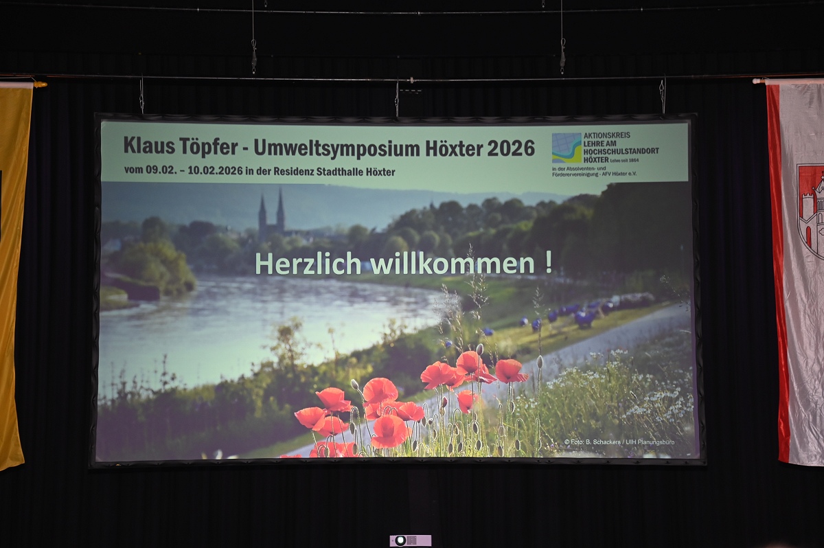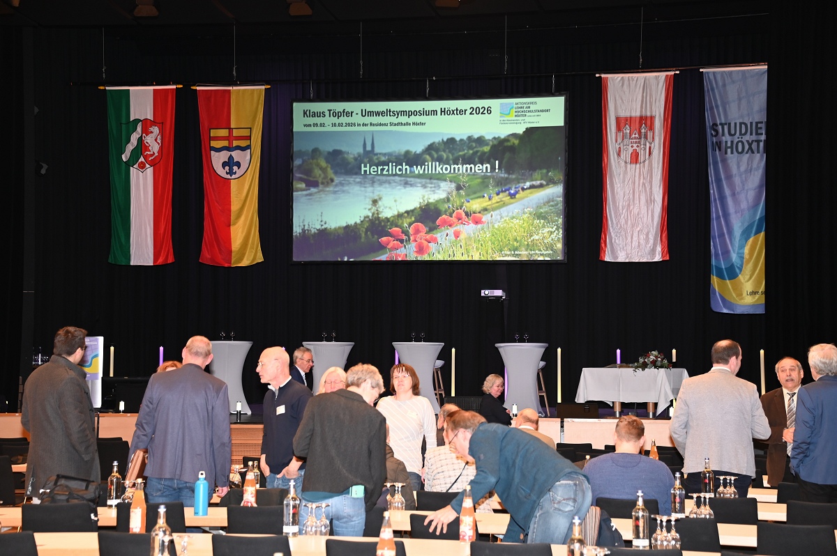Höxter (TKu). Mit großer Resonanz ist am 9. Februar 2026 das erste Klaus-Töpfer-Umweltsymposium in der Residenz-Stadthalle in Höxter gestartet. Mehr als 250 Teilnehmende aus Wissenschaft, Wirtschaft, Verwaltung und Politik sowie zahlreiche interessierte Bürgerinnen und Bürger nutzten die zweitägige Veranstaltung, um sich intensiv über aktuelle und zukünftige Herausforderungen im Umwelt- und Nachhaltigkeitsbereich auszutauschen. Die Eröffnung des Symposiums übernahm die nordrhein-westfälische Wissenschaftsministerin Ina Brandes, die als Schirmherrin die Bedeutung von Wissenschaft und Forschung für nachhaltige Lösungsansätze unterstrich. Zuvor hatten die Kreisdirektorin des Kreises Höxter, Manuela Kupsch, und der Bürgermeister der Stadt Höxter, Daniel Hartmann, die Gäste willkommen geheißen. Zu den Anwesenden zählten neben Landes- und Europapolitikern auch die Regierungspräsidentin des Regierungsbezirks Detmold, Anna Katharina Bölling, sowie Vertreterinnen und Vertreter weiterer Hochschulen aus Nordrhein-Westfalen und darüber hinaus.