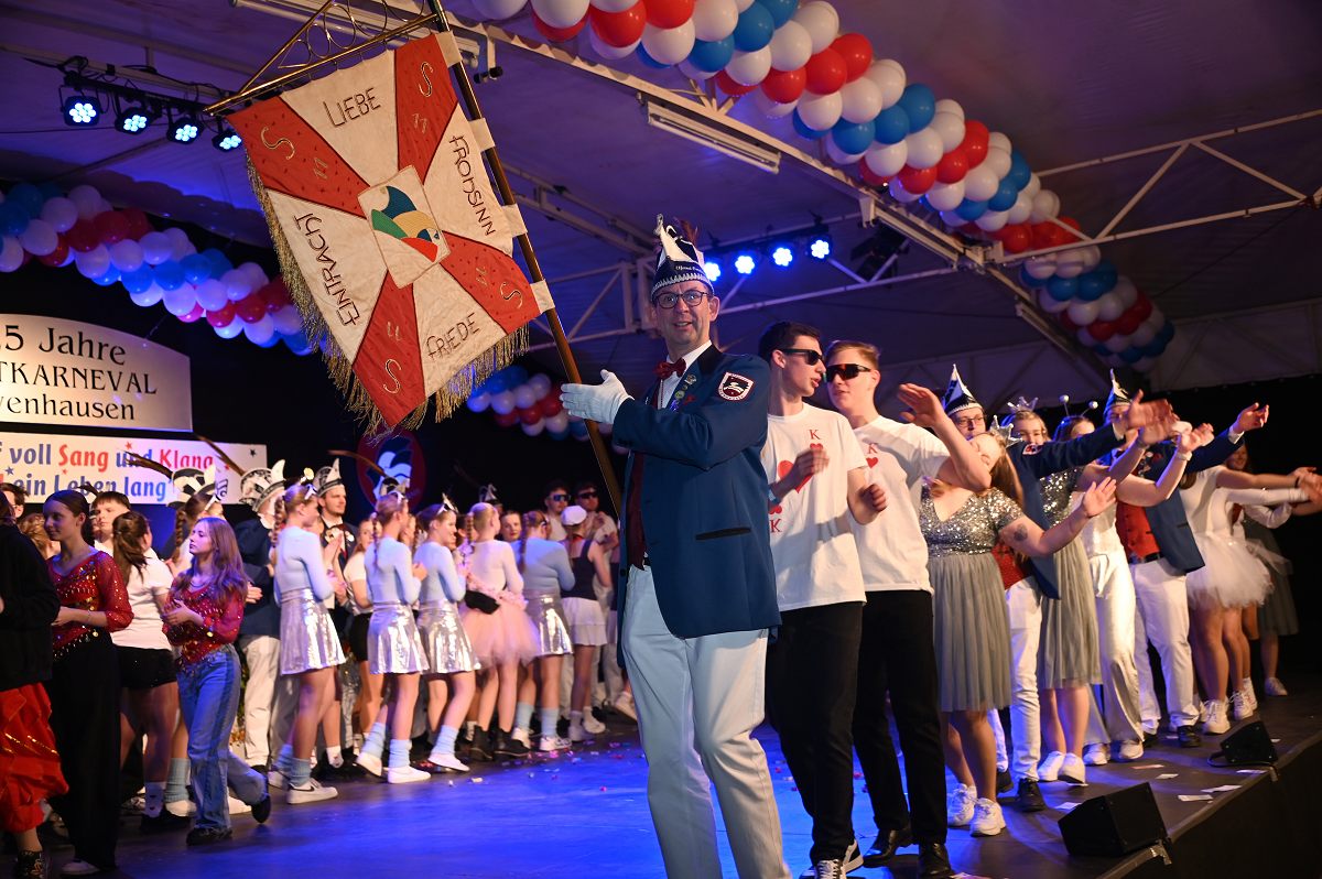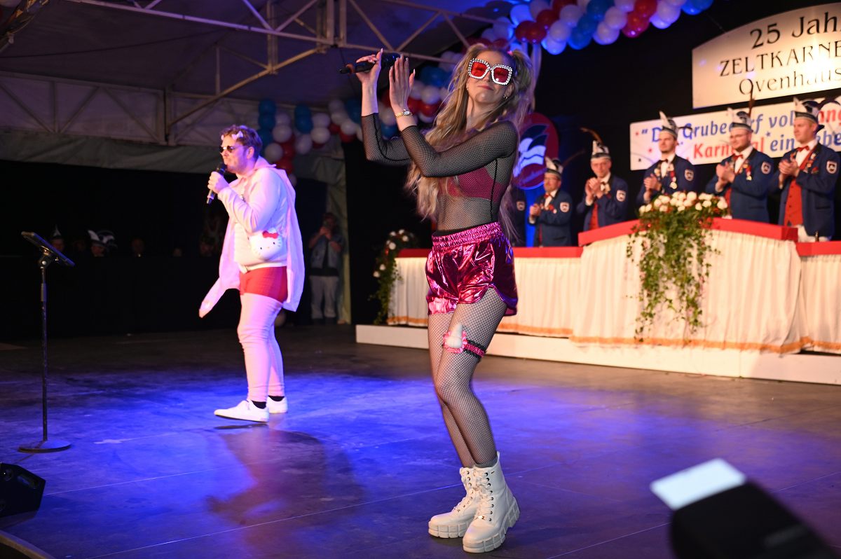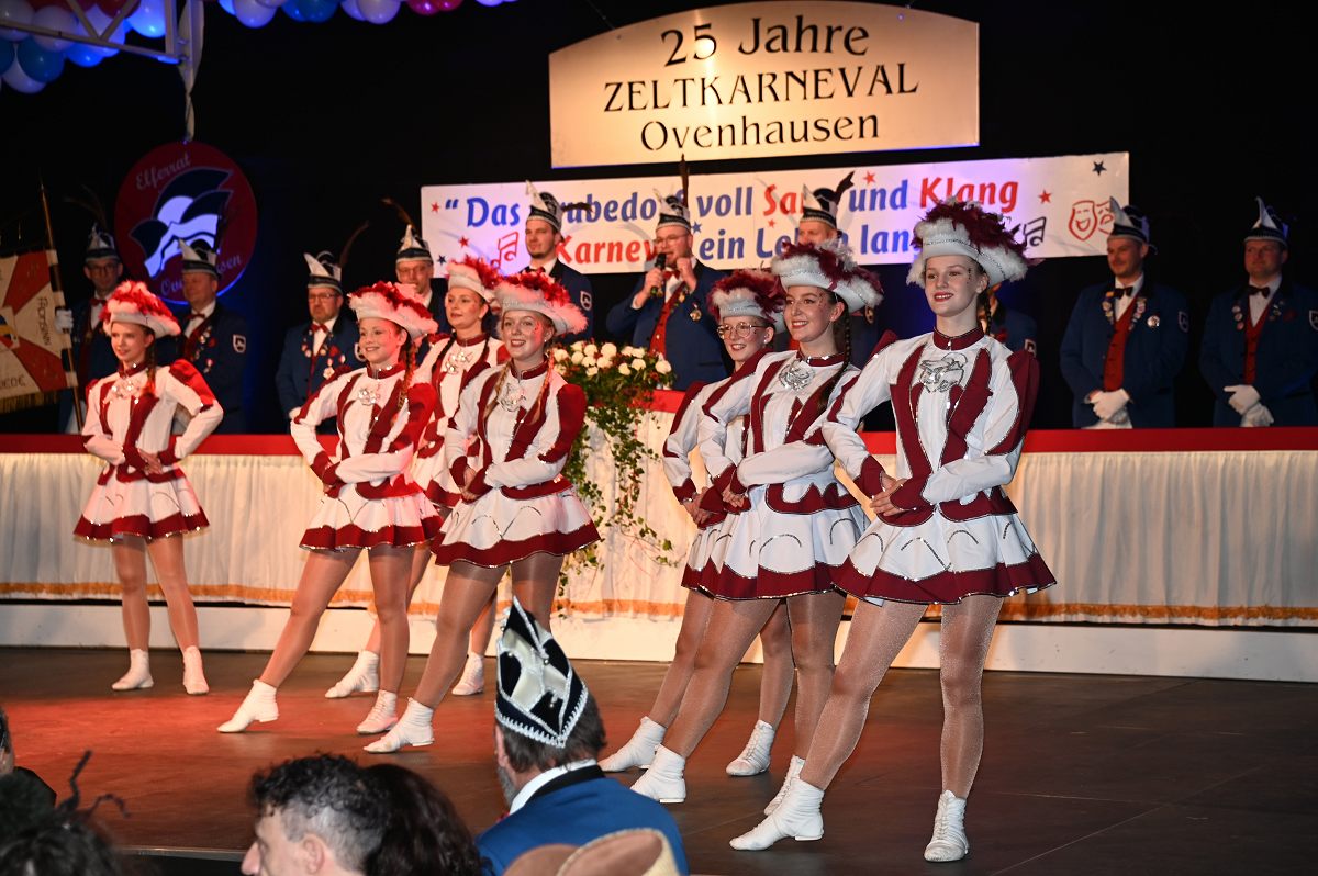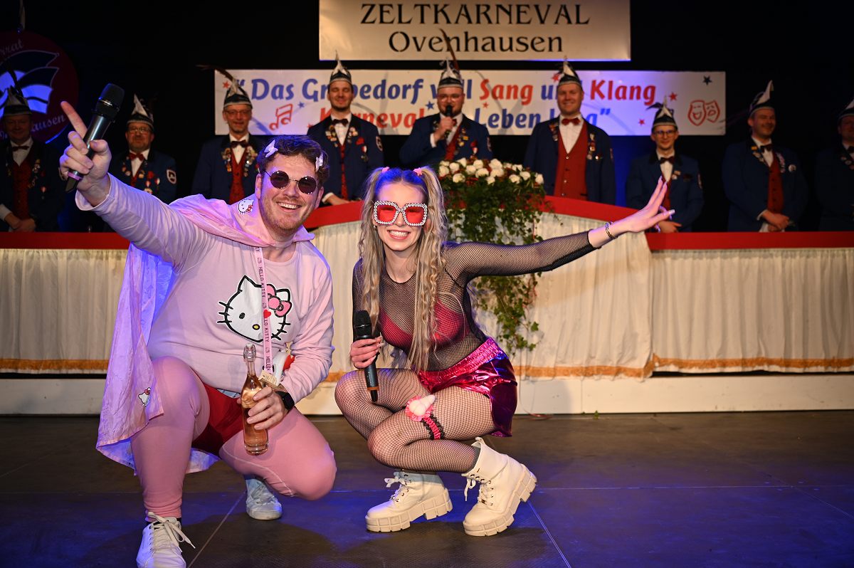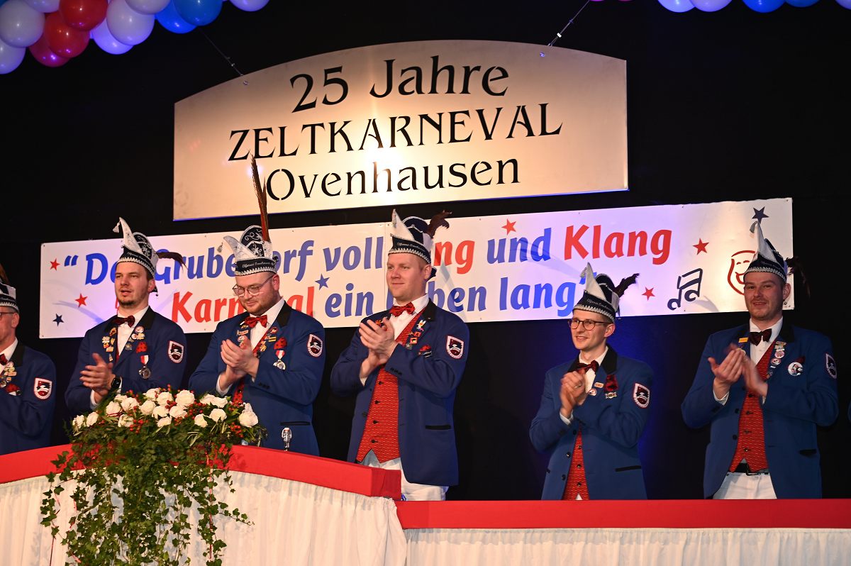 Ovenhausen (TKu). Der Büttenabend im Festzelt „Am Dreiort“ in Ovenhausen am Samstagabend war der zentrale Höhepunkt des Karnevalswochenendes im „Grubedorf“ Ovenhausen. Mehr als 1.111 Närrinnen und Narren füllten das Festzelt bis auf den letzten Platz und erlebten ein Programm, das von Tanz, Humor und der Würdigung ehrenamtlichen Engagements getragen wurde und das unter ständiger Moderation von Sitzungspräsident Jonas „Bone“ Behrenberg. Unter dem Motto „Das Grubedorf voll Sang und Klang – Karneval ein Leben lang“ zeigte sich, wie fest der Karneval in Ovenhausen verankert ist. Das Bühnenprogramm lebte vor allem von seiner tänzerischen Vielfalt. Mehrfach standen die Garden im Mittelpunkt: Die Teeny-Garde Ovenhausen überzeugte mit einem thematisch ausgearbeiteten Tanz, während die Prinzengarde Ovenhausen sowohl mit klassischem Gardetanz als auch später mit einem modernen Showtanz Akzente setzte. Ergänzt wurde das Programm durch die Ehrengarde Ovenhausen sowie die O-Town-Dancegroup, die mit ihrem Auftritt für zusätzlichen Applaus sorgte. Einen bewussten Kontrast bildete die Hip-Hop-Formation ExeQtive von Benny’s Danceschool, die moderne Elemente in das traditionelle Sitzungsformat einbrachte sowie ein Musikquiz.