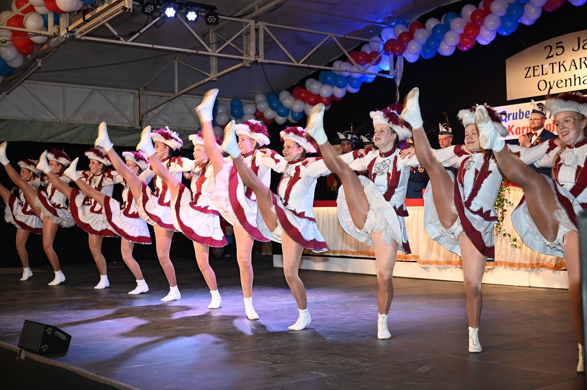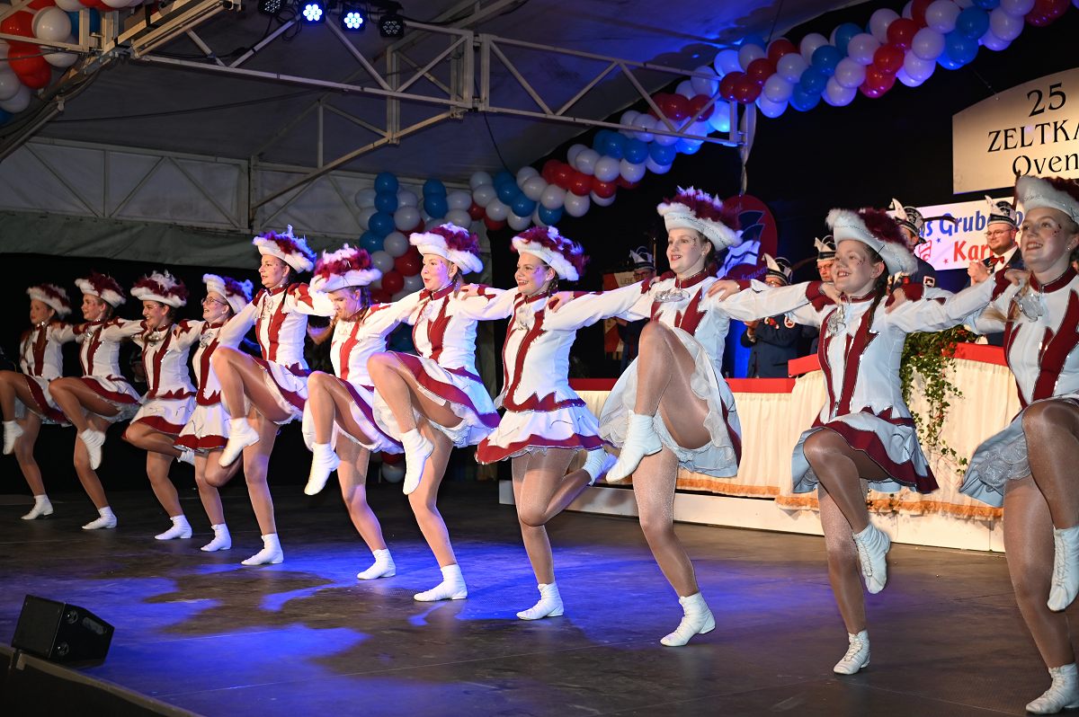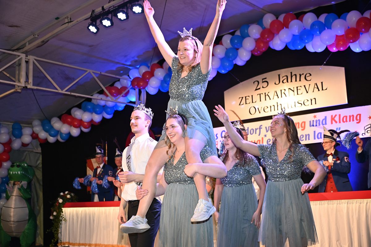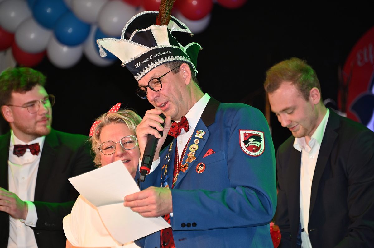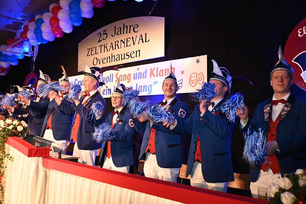 Ovenhausen (TKu). Der Büttenabend im Festzelt „Am Dreiort“ in Ovenhausen am Samstagabend war der zentrale Höhepunkt des Karnevalswochenendes im „Grubedorf“ Ovenhausen. Mehr als 1.111 Närrinnen und Narren füllten das Festzelt bis auf den letzten Platz und erlebten ein Programm, das von Tanz, Humor und der Würdigung ehrenamtlichen Engagements getragen wurde und das unter ständiger Moderation von Sitzungspräsident Jonas „Bone“ Behrenberg. Unter dem Motto „Das Grubedorf voll Sang und Klang – Karneval ein Leben lang“ zeigte sich, wie fest der Karneval in Ovenhausen verankert ist. Das Bühnenprogramm lebte vor allem von seiner tänzerischen Vielfalt. Mehrfach standen die Garden im Mittelpunkt: Die Teeny-Garde Ovenhausen überzeugte mit einem thematisch ausgearbeiteten Tanz, während die Prinzengarde Ovenhausen sowohl mit klassischem Gardetanz als auch später mit einem modernen Showtanz Akzente setzte. Ergänzt wurde das Programm durch die Ehrengarde Ovenhausen sowie die O-Town-Dancegroup, die mit ihrem Auftritt für zusätzlichen Applaus sorgte. Einen bewussten Kontrast bildete die Hip-Hop-Formation ExeQtive von Benny’s Danceschool, die moderne Elemente in das traditionelle Sitzungsformat einbrachte sowie ein Musikquiz.