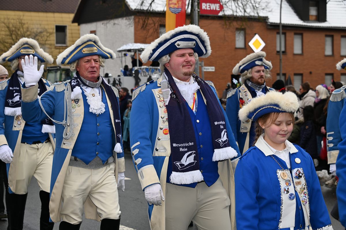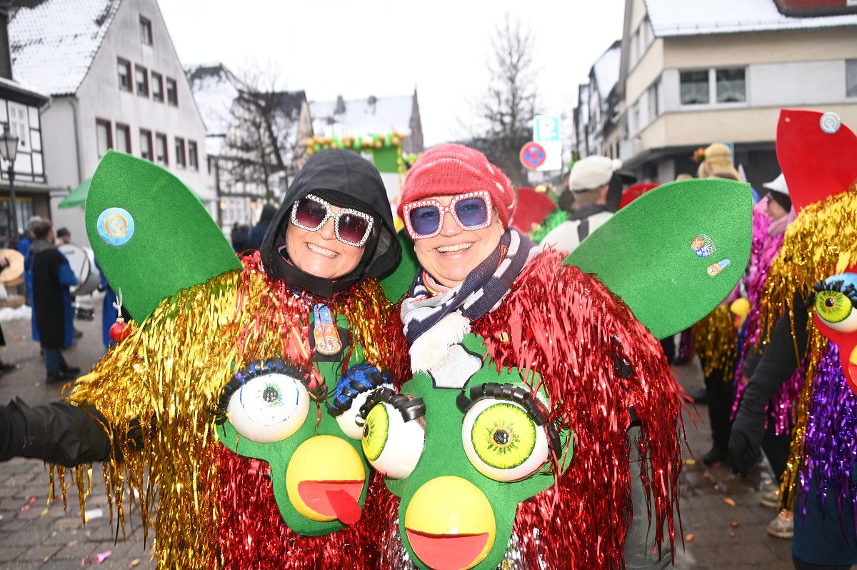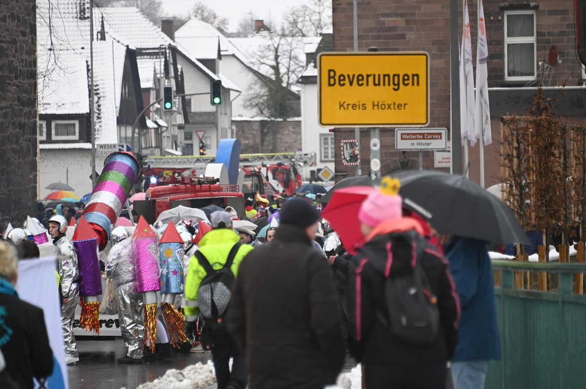 Tausende Jecken säumten die Straßenränder, ausgerüstet mit Beuteln und guter Laune, stets in der Hoffnung auf Kamelle, Konfetti und kleine Überraschungen. Für eine besondere, fast schon märchenhafte Note sorgte das Wetter: Mitten im Februar fielen zwischendurch tatsächlich ein paar Schneeflocken. Die Prinzenpaare hatten mit dem Rosenmontagsumzug auch ihren letzten großen Auftritt. Prinz Florian (Kastens), „der balearisch Regierende“, und Prinzessin Carena (Zarnitz), „die ewig Marschierende“, verabschiedeten sich gemeinsam mit dem Kinderprinzenpaar Till (Marx), „der fröhlich Kreative“, und Prinzessin Johanna (Kleinschmidt), „die glitzernd Aktive“, vom närrischen Volk. Insgesamt nahmen über 50 Wagen, Fußgruppen und Musikzüge teil: von Spielmannszügen aus der Region über Garden, Elferräte und Fantasiegruppen bis hin zu Sicherheitswagen und dem Deutsches Rotes Kreuz, das für einen sicheren Ablauf sorgte. Nach dem Umzug wurde in und an der Stadthalle Beverungen ausgelassen weitergefeiert.